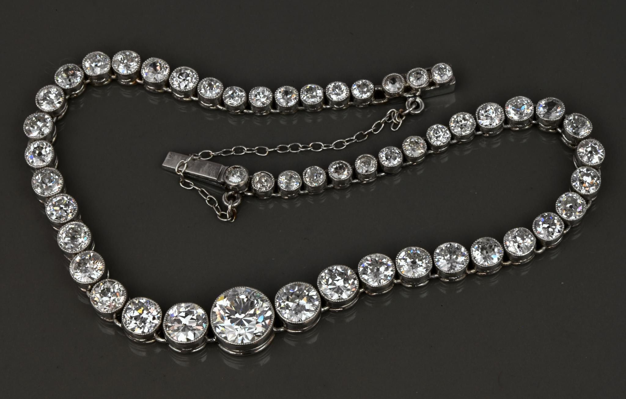 Line bracelet in platinum 850 set with a line of half-cut diamonds (0.8ct, 2 x 0.3ct, 2 x 0.2ct) and old-cut diamonds (0.18ct to 0.05ct) in scalloped closed setting, safety chain. Early 20th century. Gross weight: 9.92g. Length: 17.8 cm