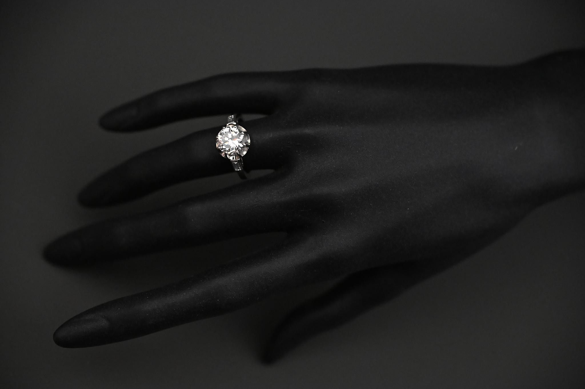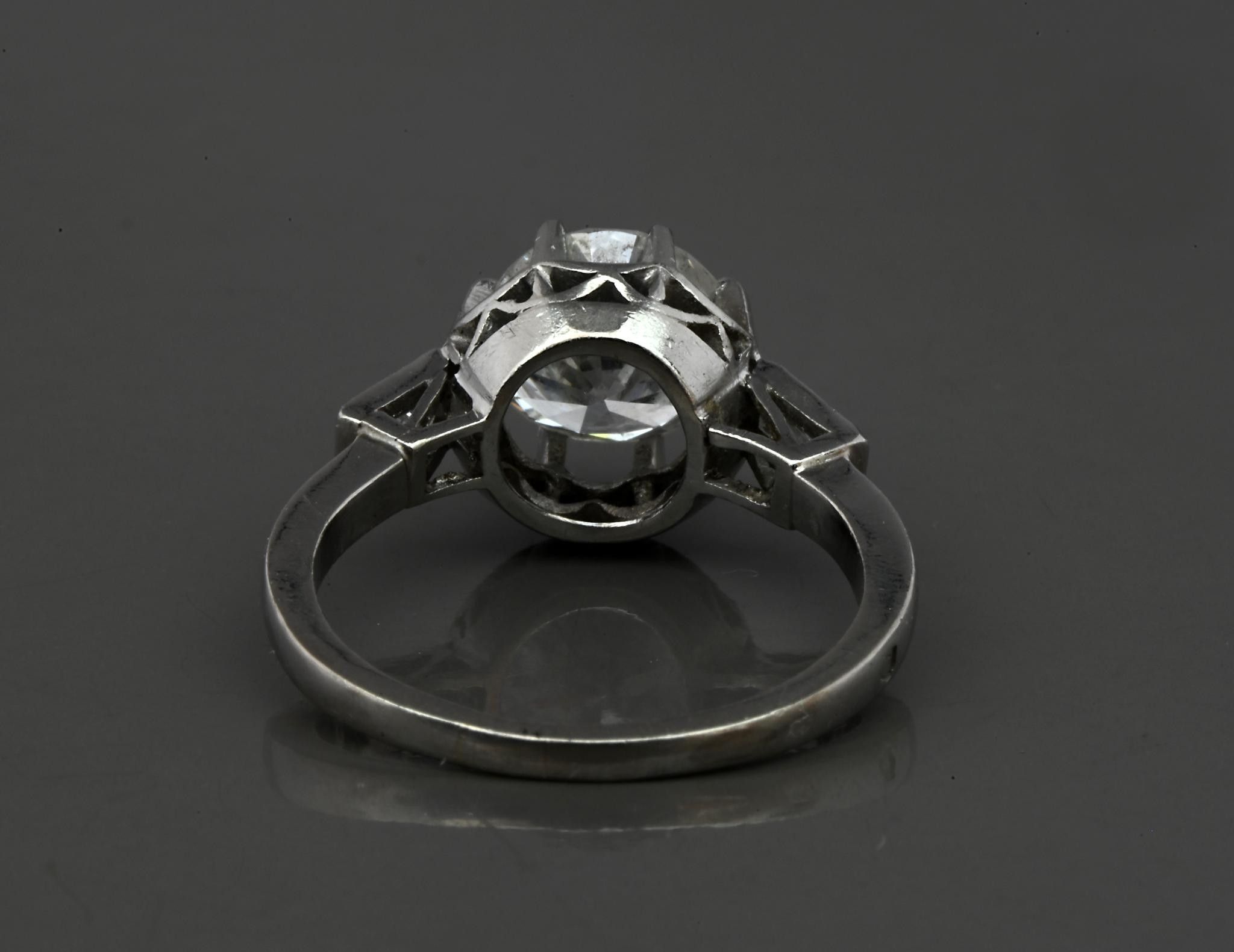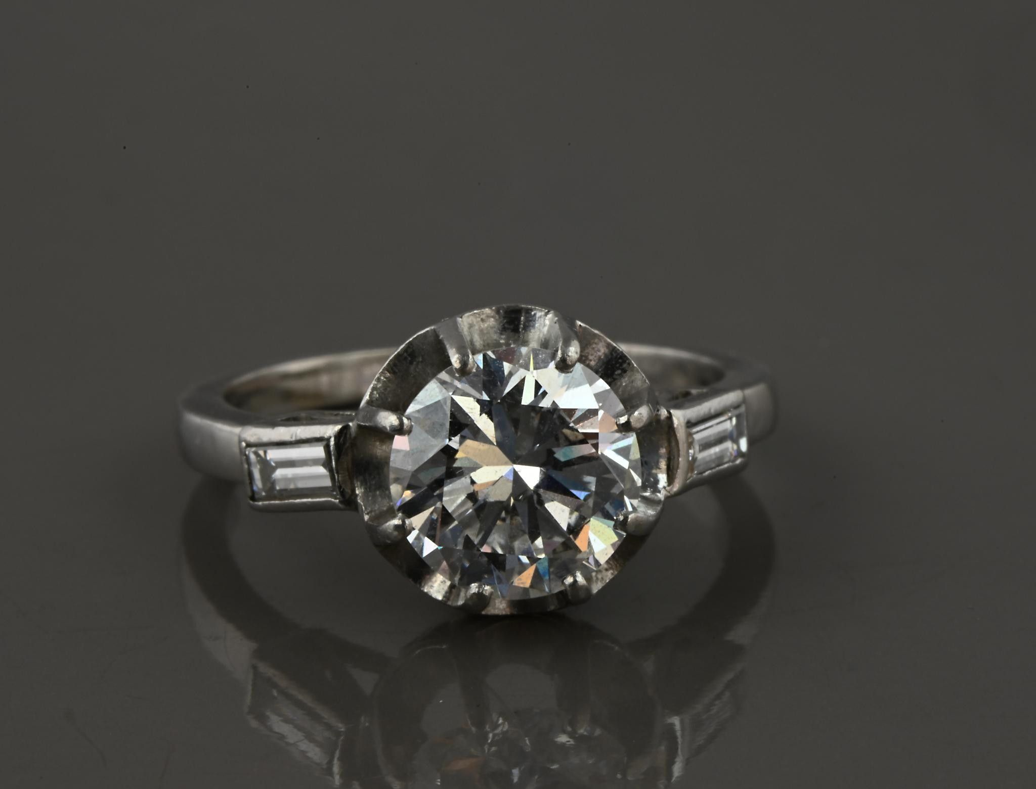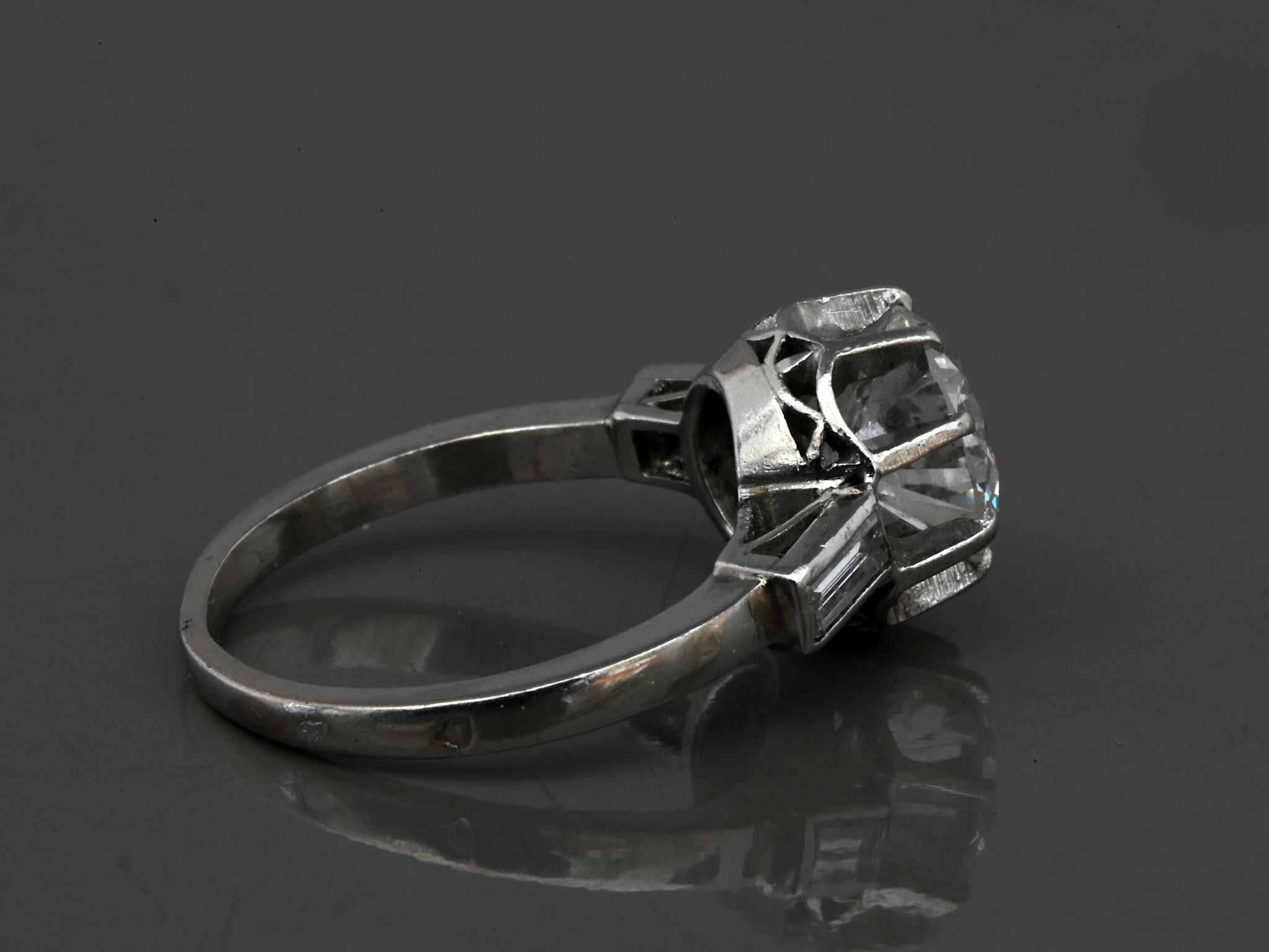 Approximately 2.1ct half-cut diamond, very fine quality, set in solitaire with two baguette diamonds, on a platinum effect claw and openwork basket setting, hallmarked dog head. Size 52. 5.39g gross.