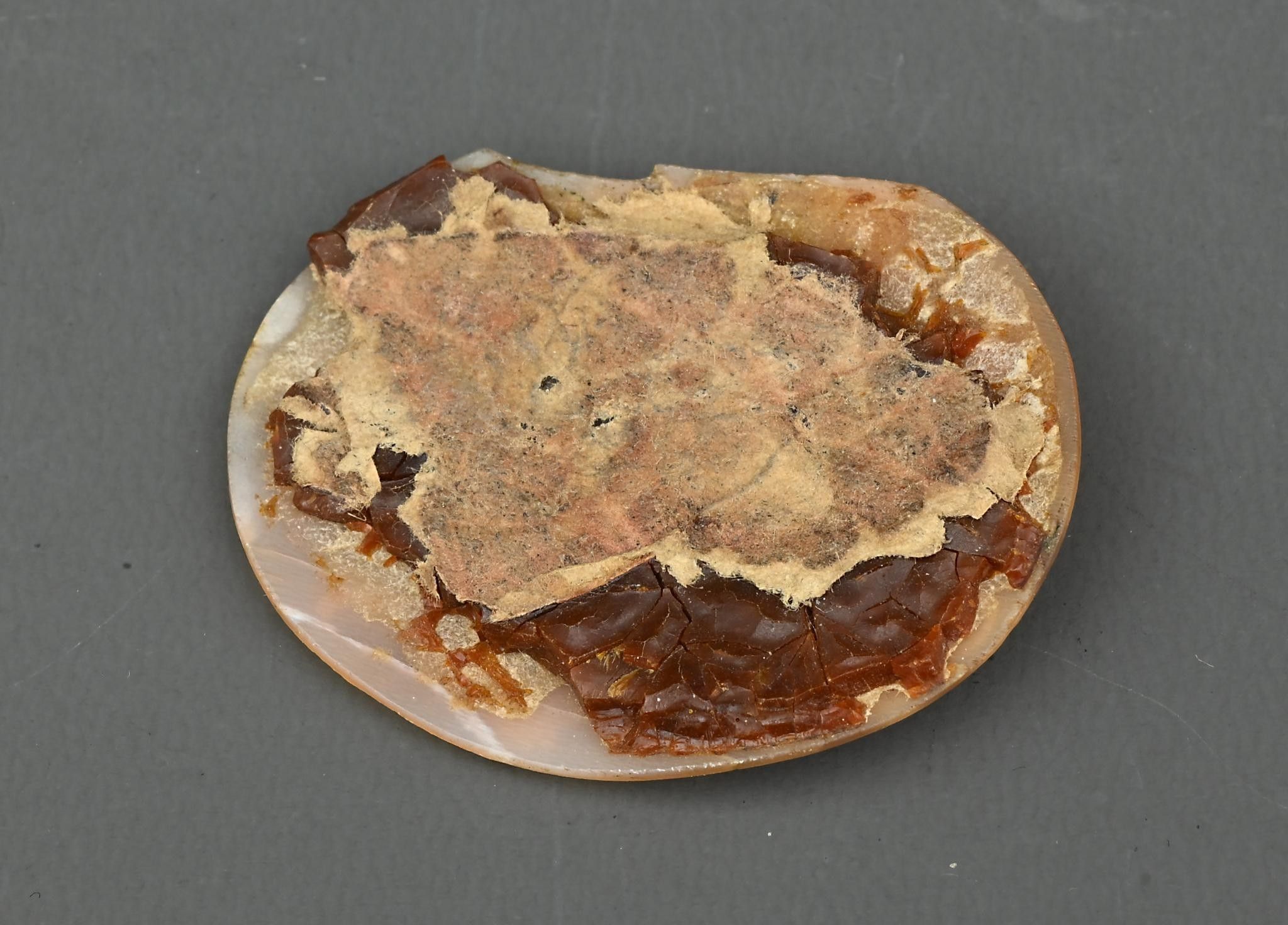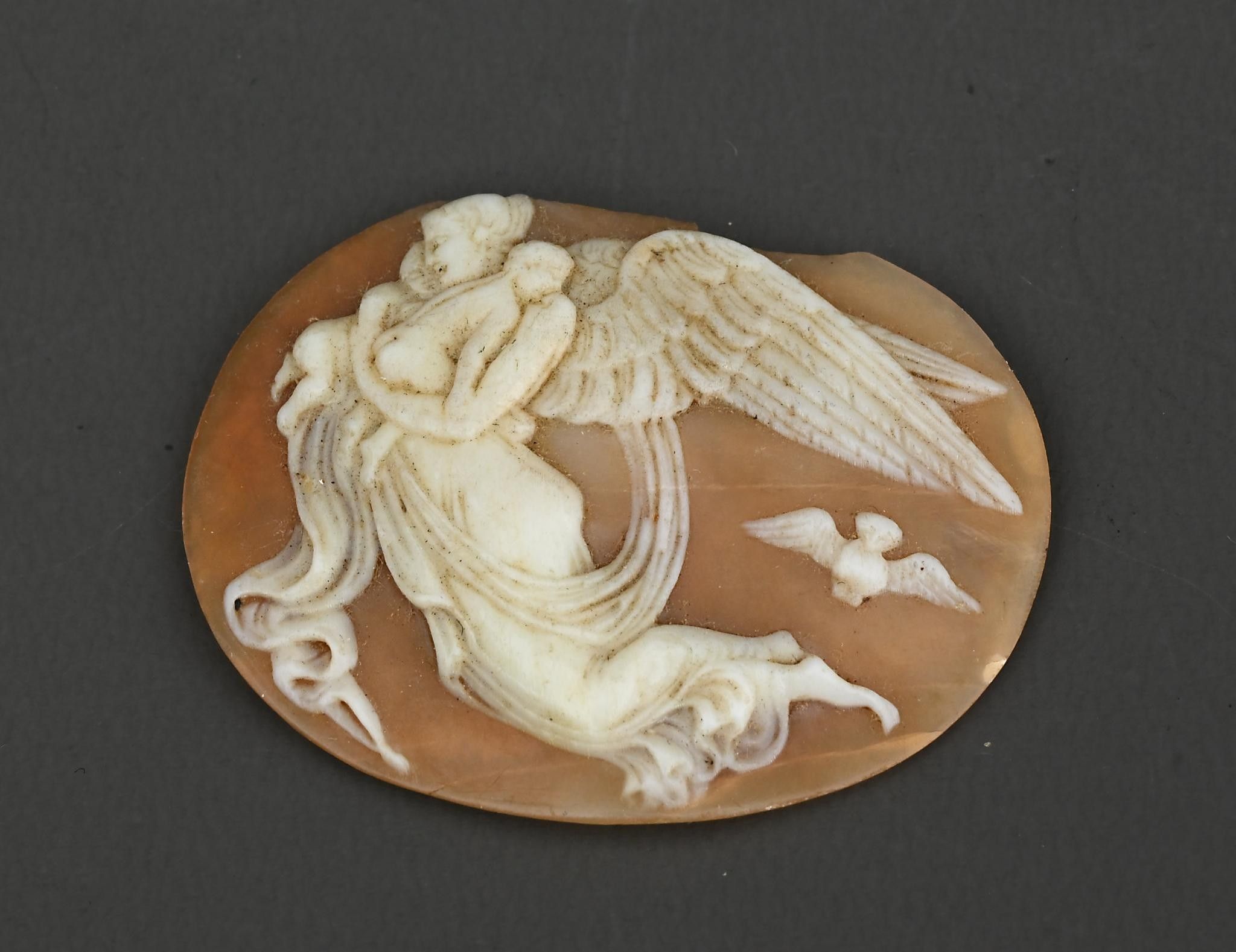 Cameo on shell representing Nyx, goddess of the night, flying with her two sons, Hypnos and Thanatos. The upper part is missing and there is some glue on the back.) Size 4 x 3.2 cm.