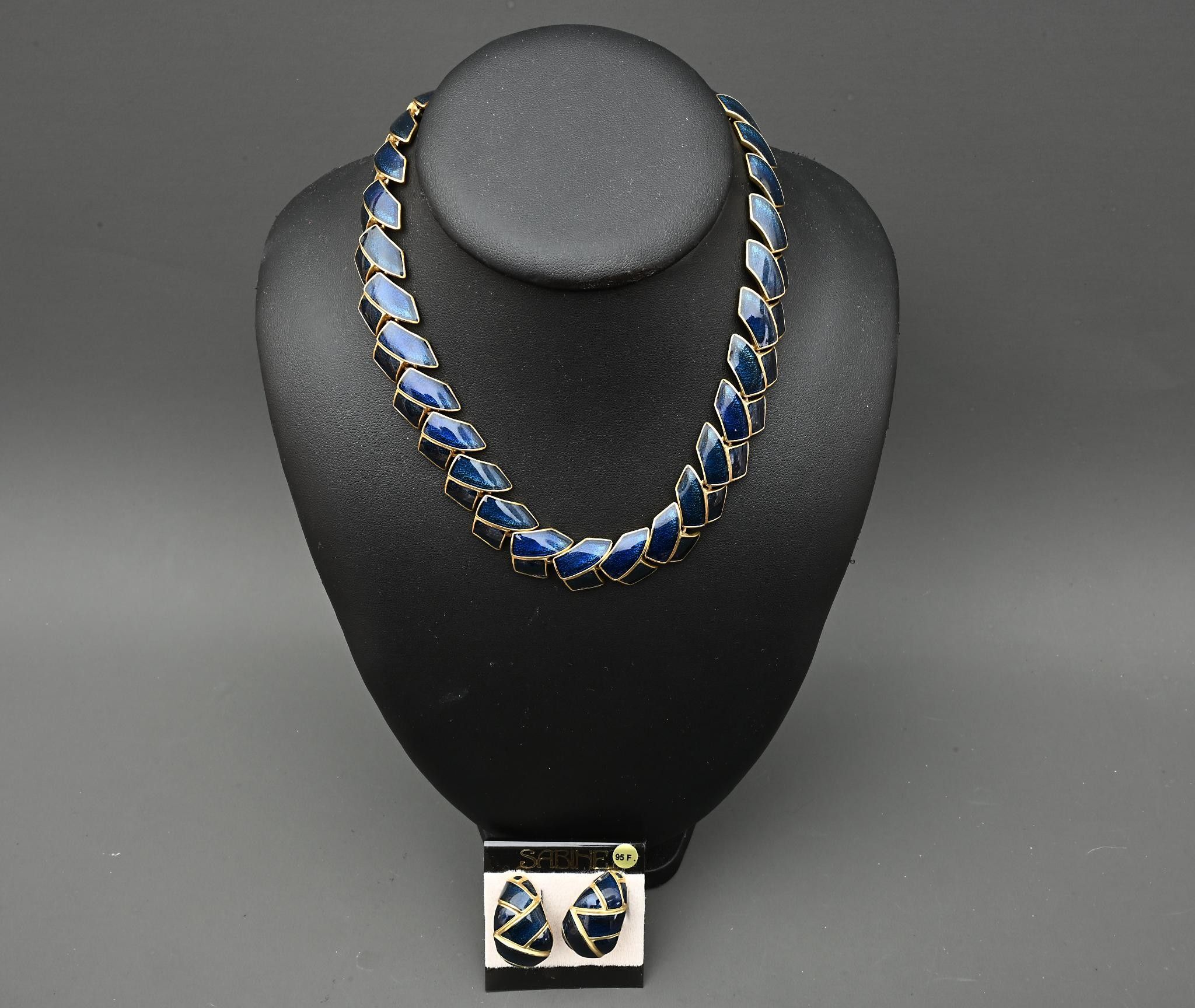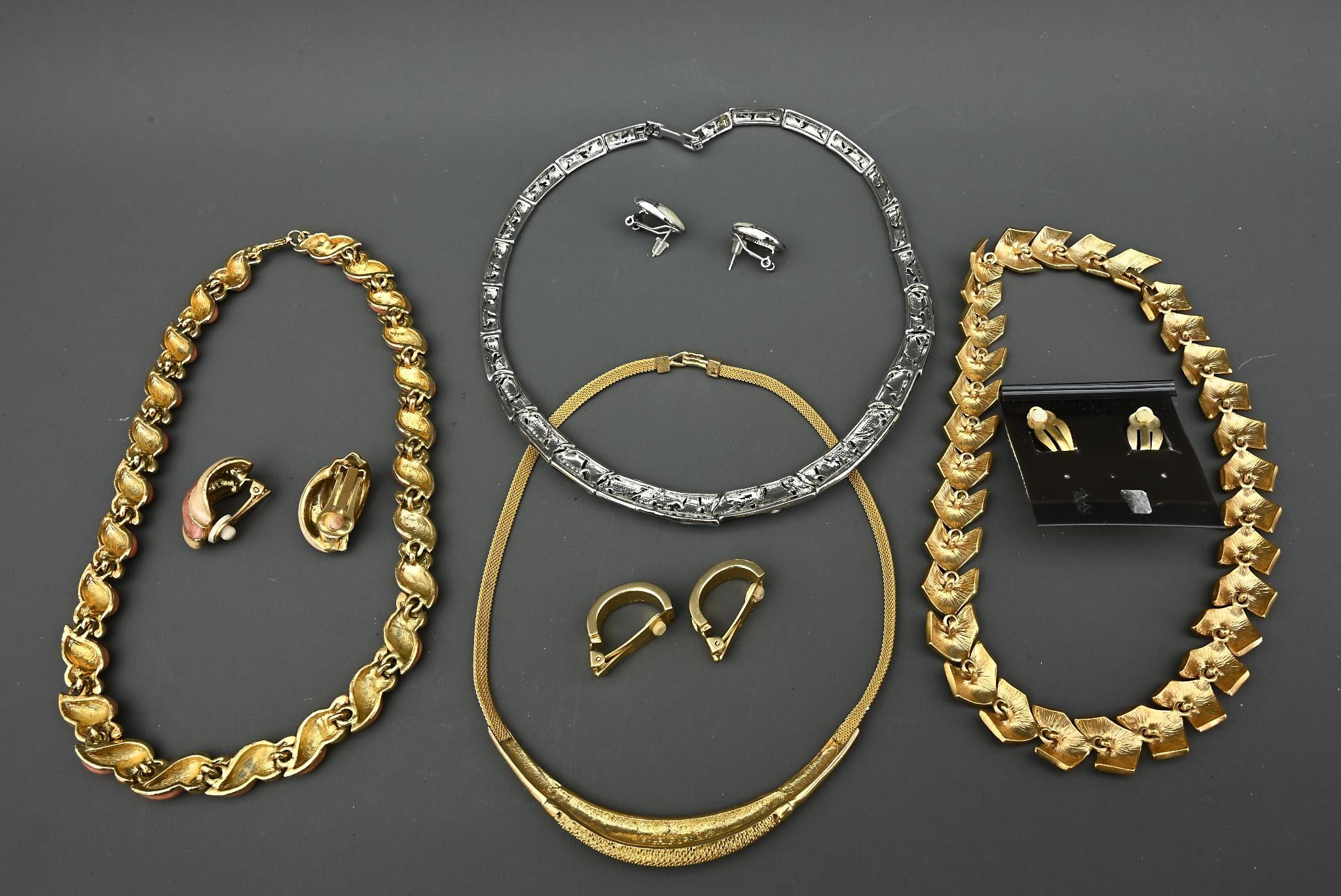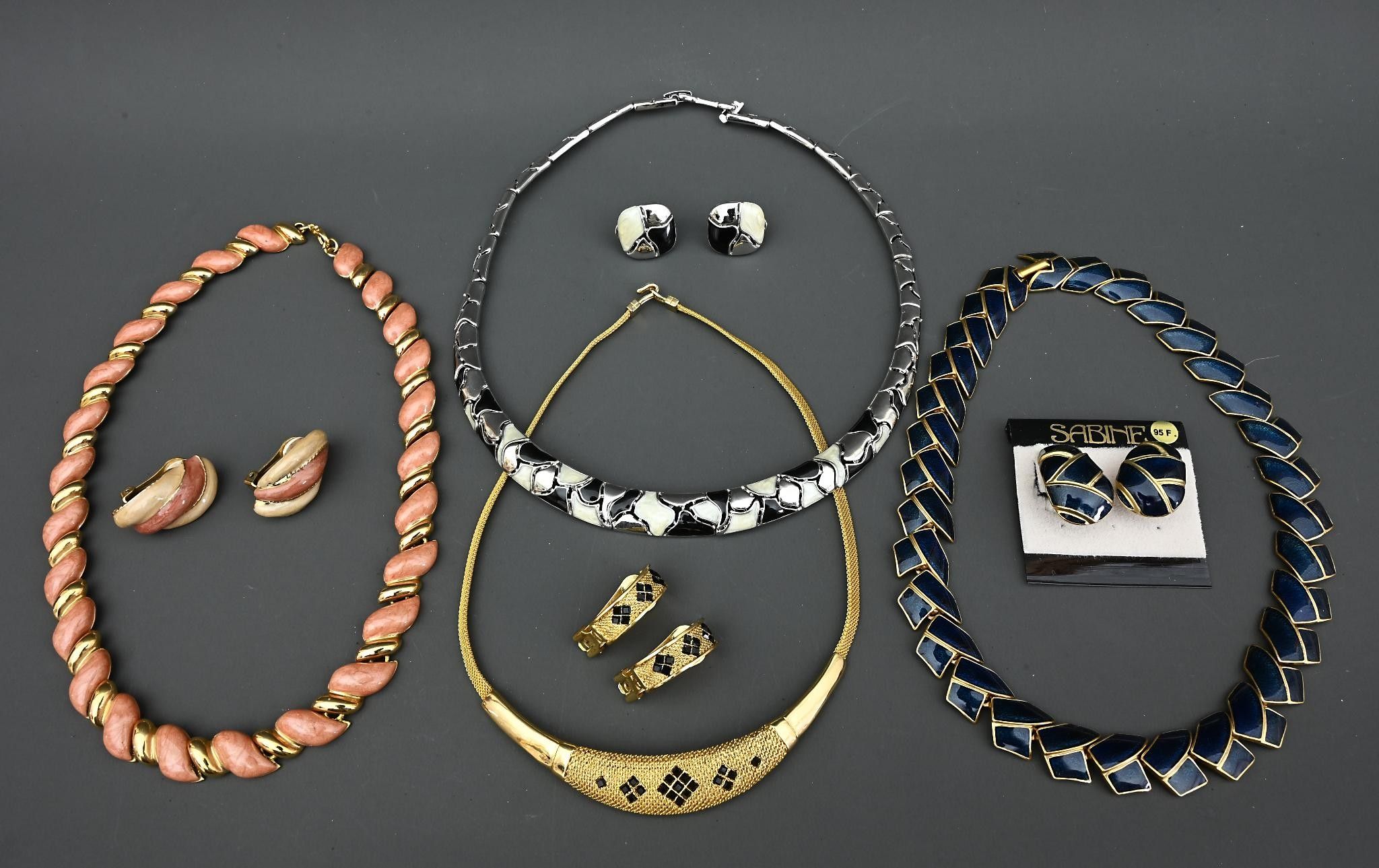 Lot of costume jewellery comprising four sets of enamelled metal necklaces and earrings.