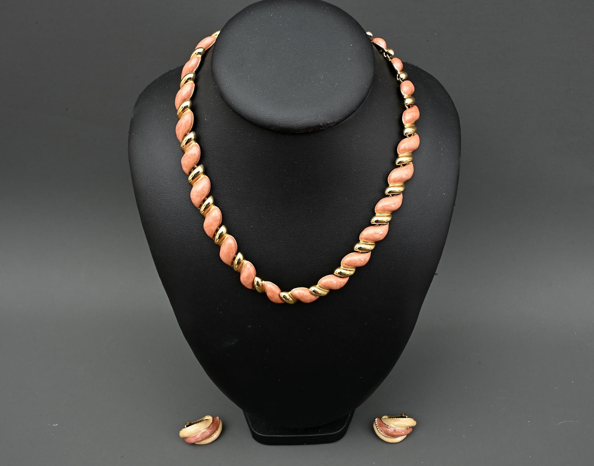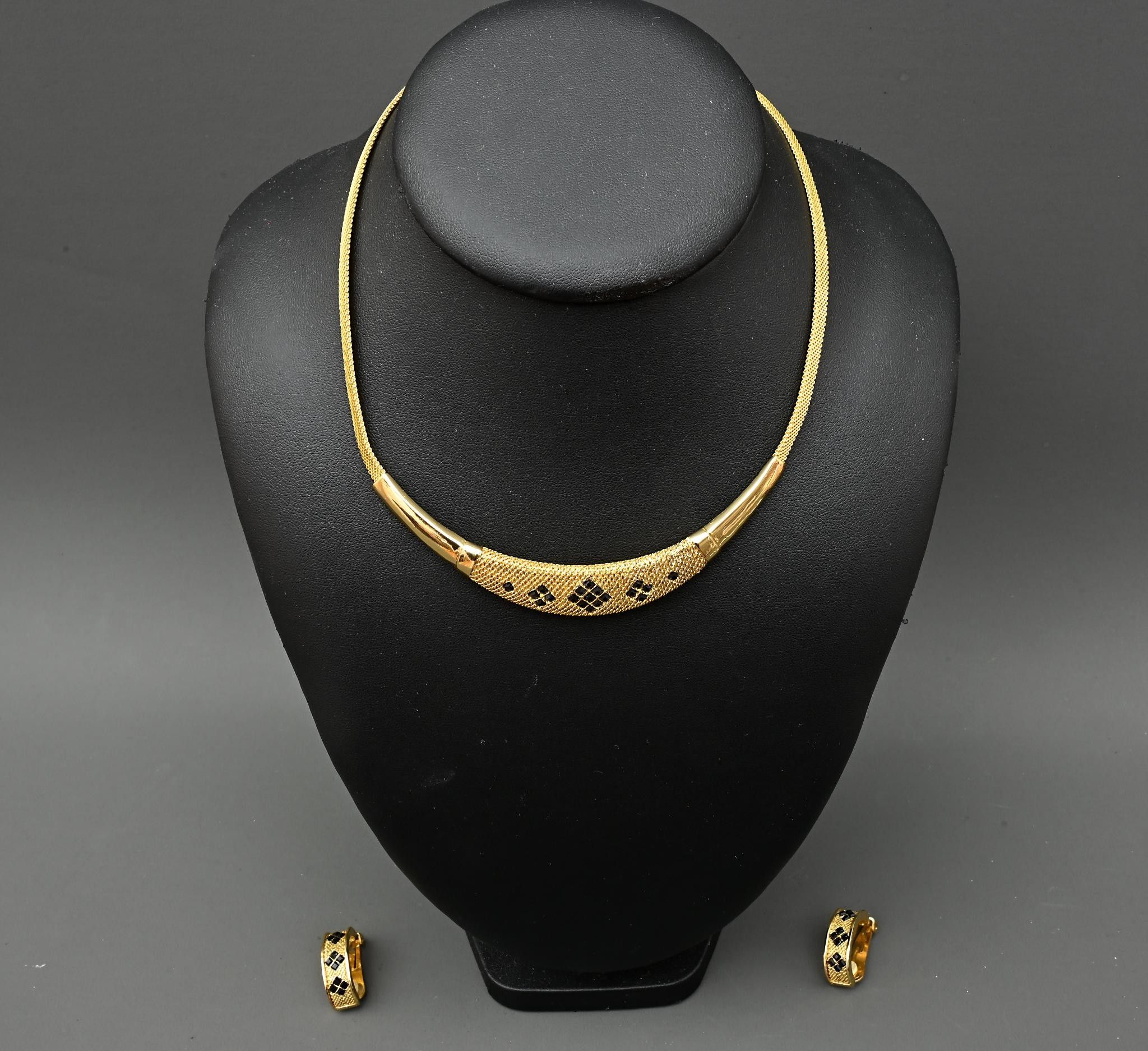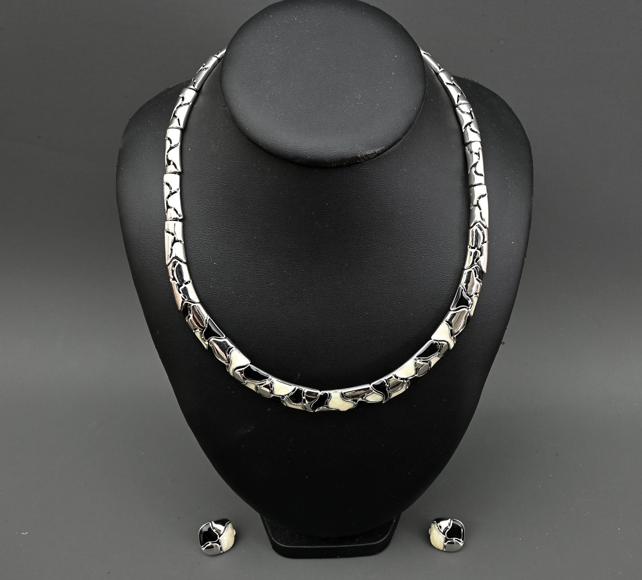 Lot of costume jewellery comprising four sets of enamelled metal necklaces and earrings.
