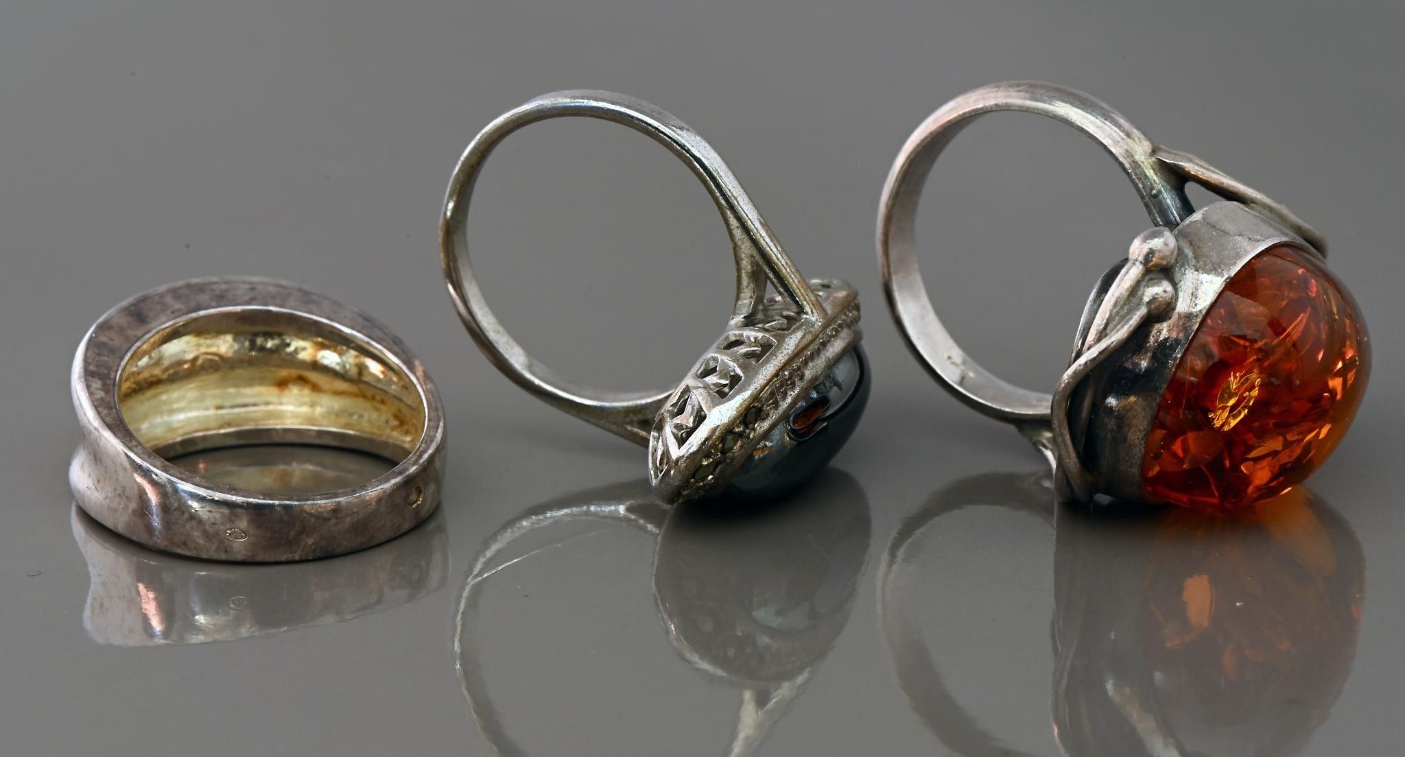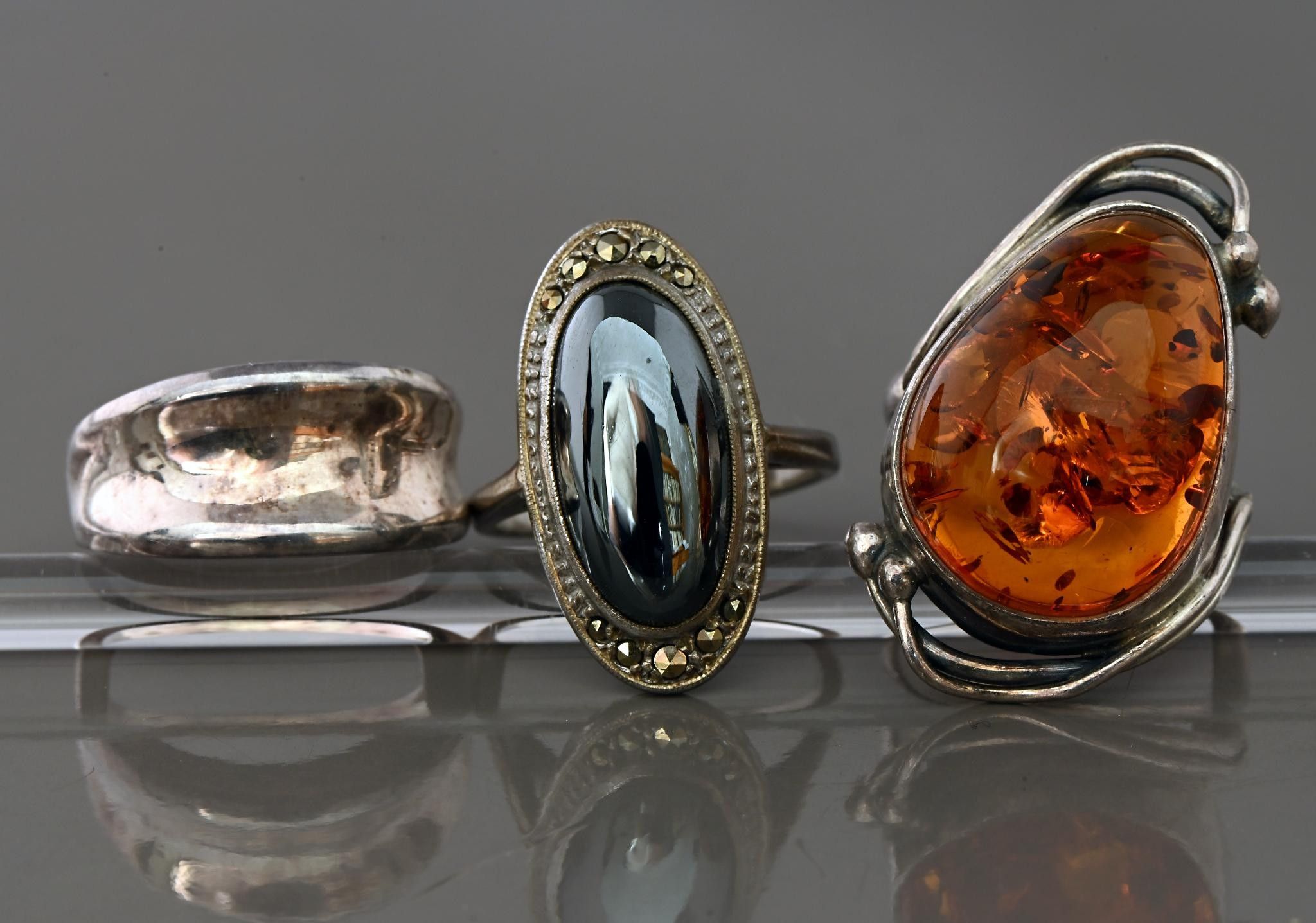 Set of three 925 silver rings, one with an amber cabochon and a marcasite cabochon. T53.