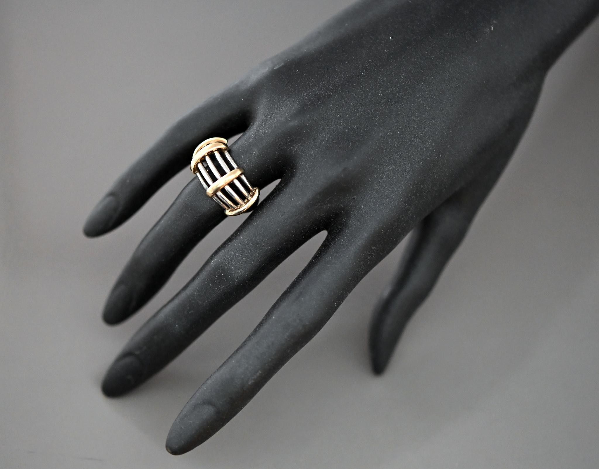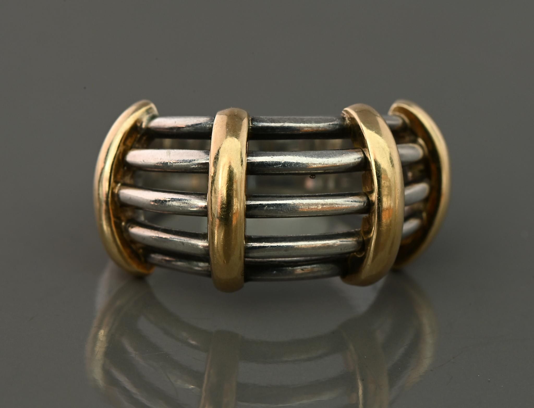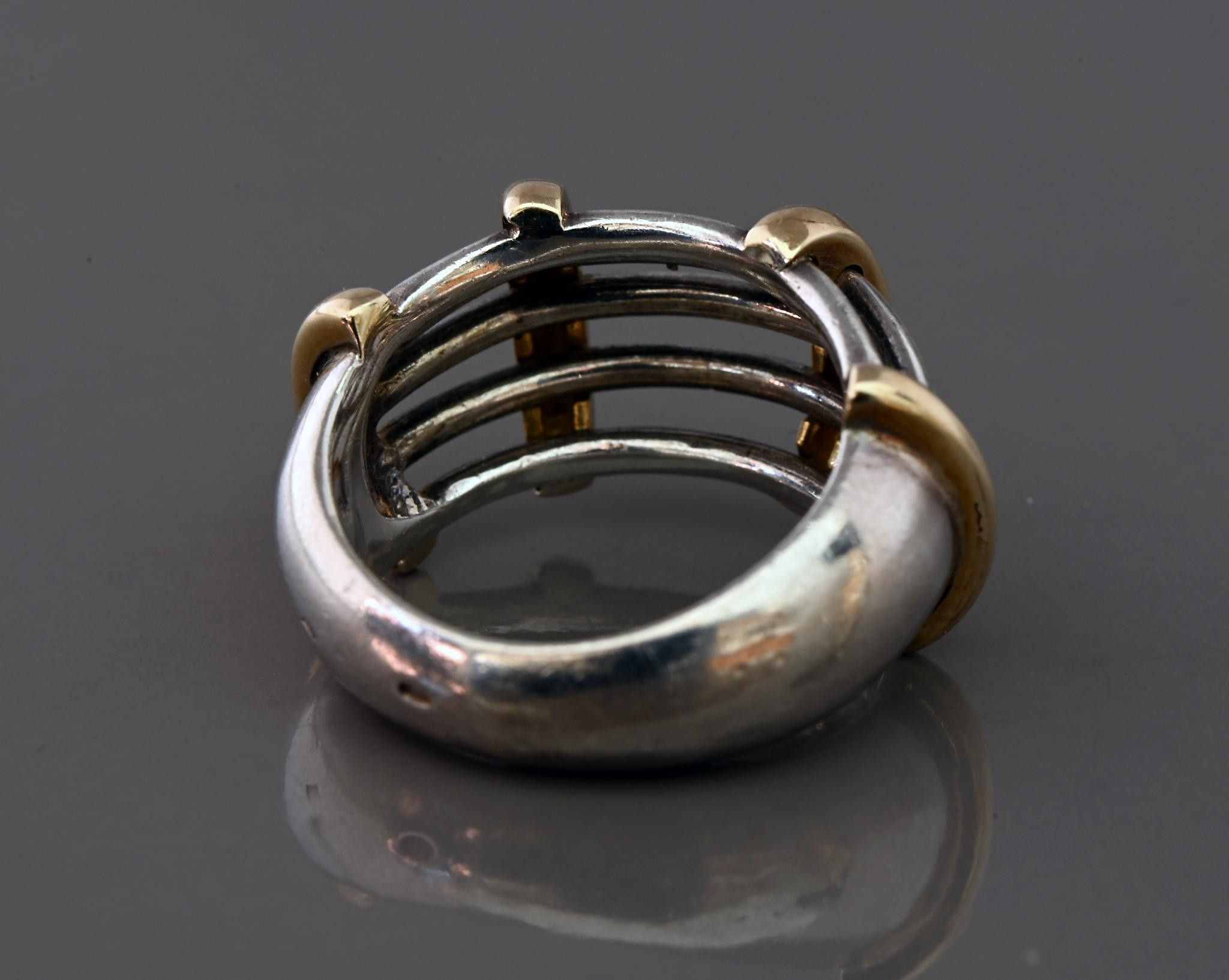 Silver and gold band ring comprising five silver rings linked by four gold bars. Mixed gold and silver hallmark. T52. 9.7g.