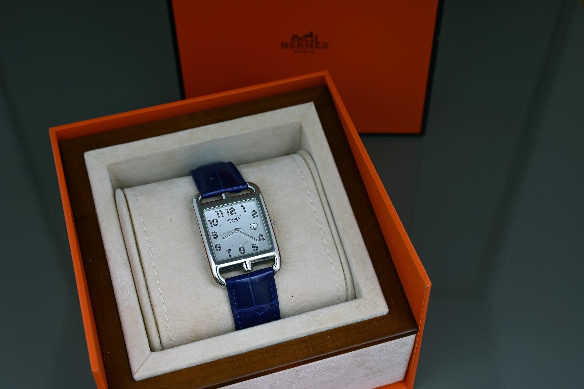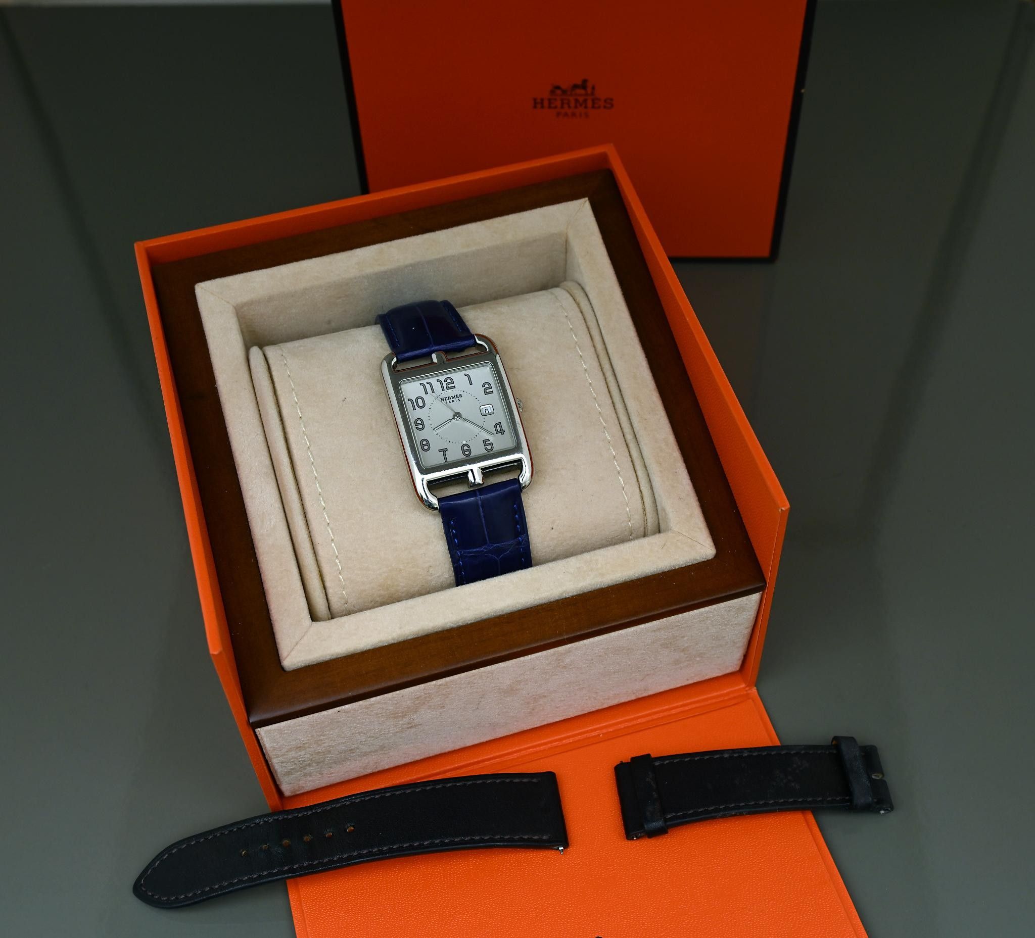 HERMES- Cap Cod watch, 41 mm, stainless steel case with stylised stirrup clasp, silver dial with Art Deco-style Arabic numerals, large seconds hand and date at 3 o'clock, midnight blue crocodile-style leather strap, original Hermès buckle. Size: 29 x 41 mm. In original box. The original Hermès bracelet is included,