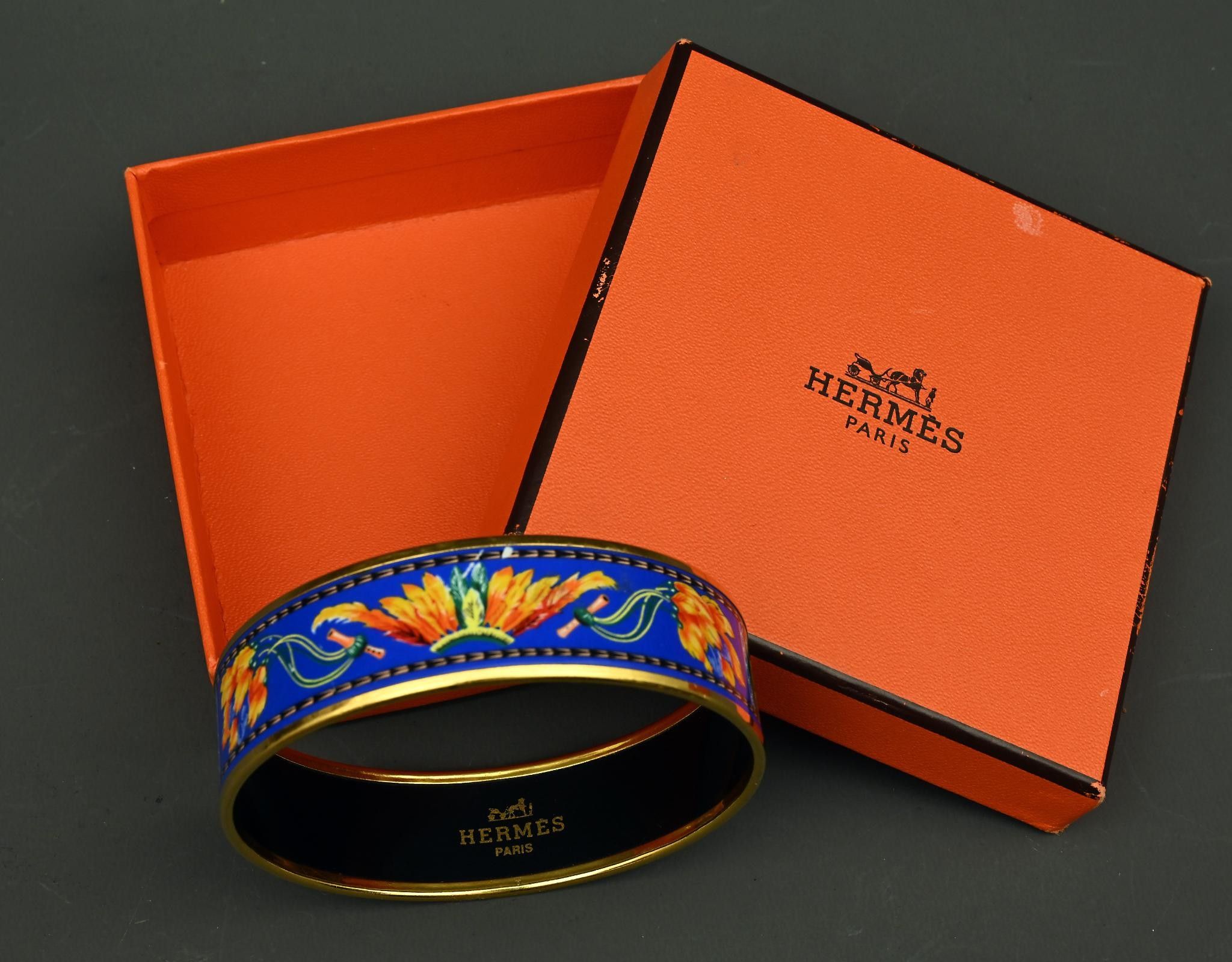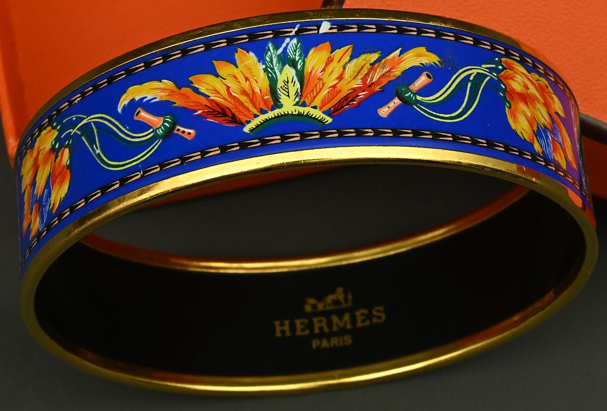 HERMES Paris made in Austria. - 20mm "Brazil" bangle bracelet in blue enamelled gold-plated metal, with multicoloured feather motif. Signed. In its box.
