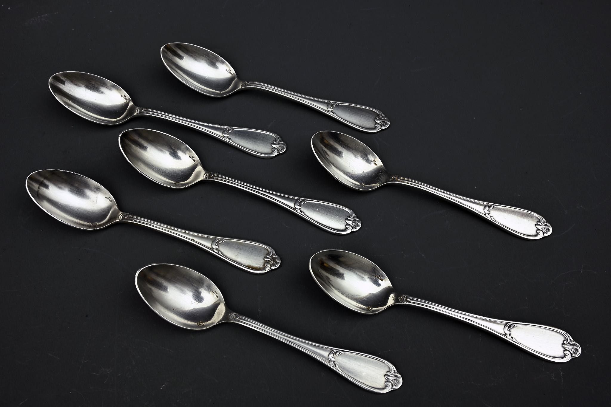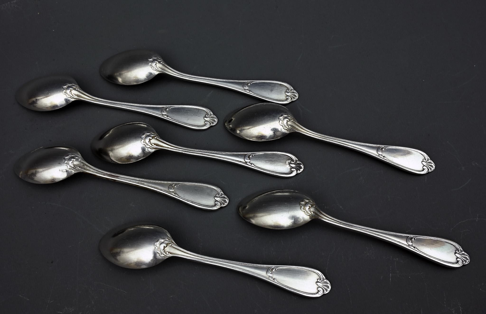 ERCUIS - Suite of 7 rocaille silver plated moka spoons.