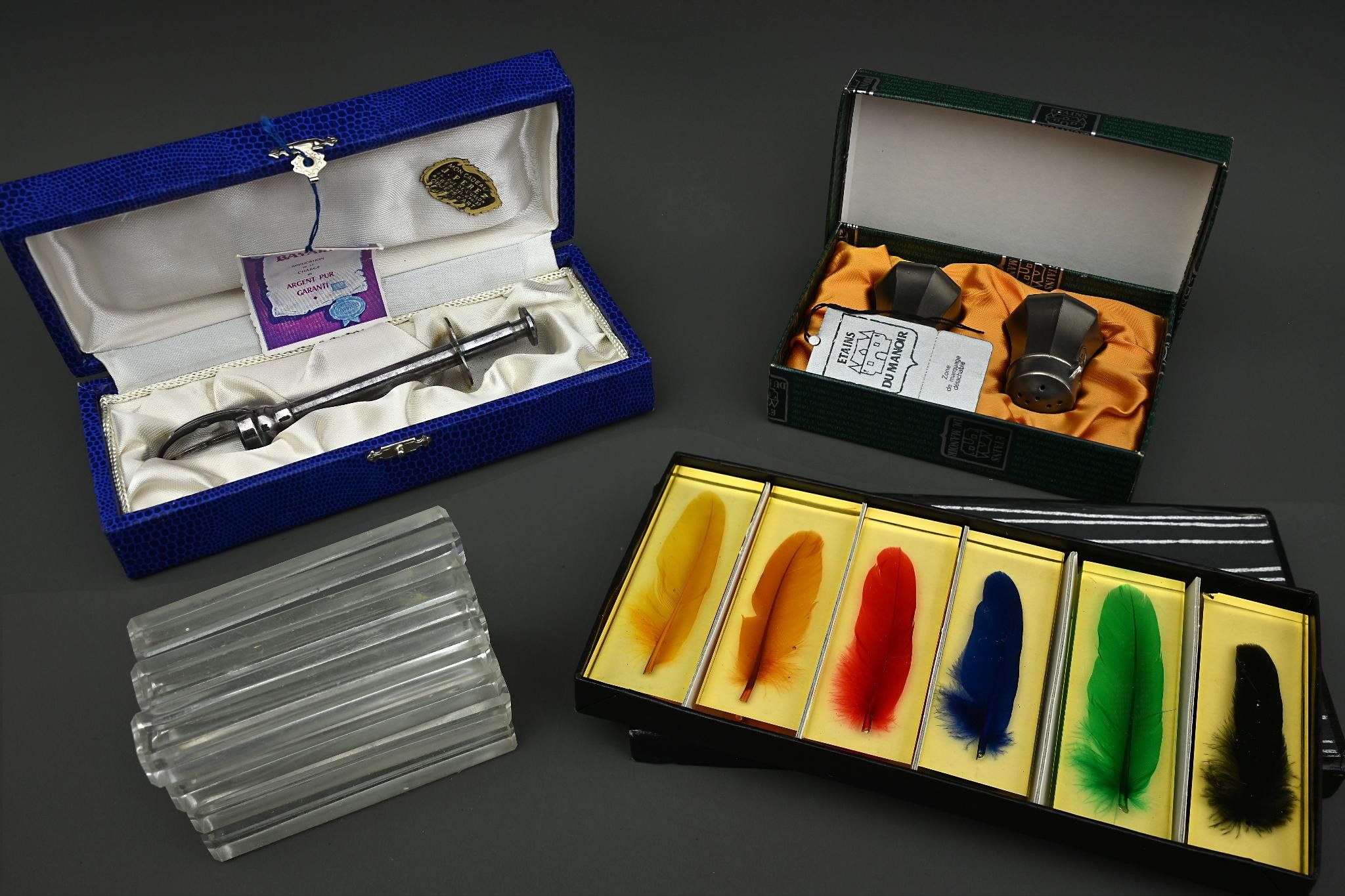 Two knife boxes, a pewter salt and pepper set and silver-plated sugar tongs.