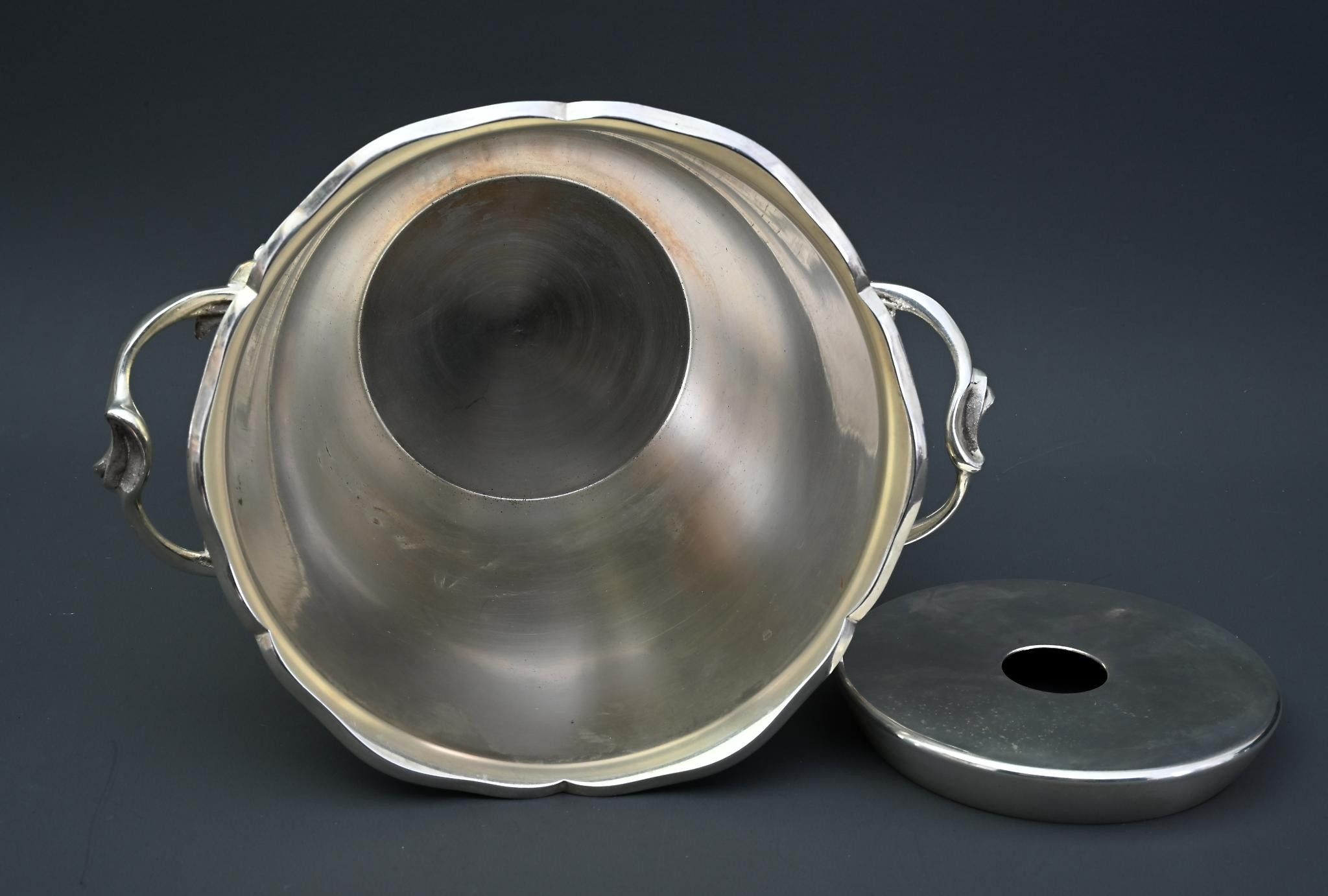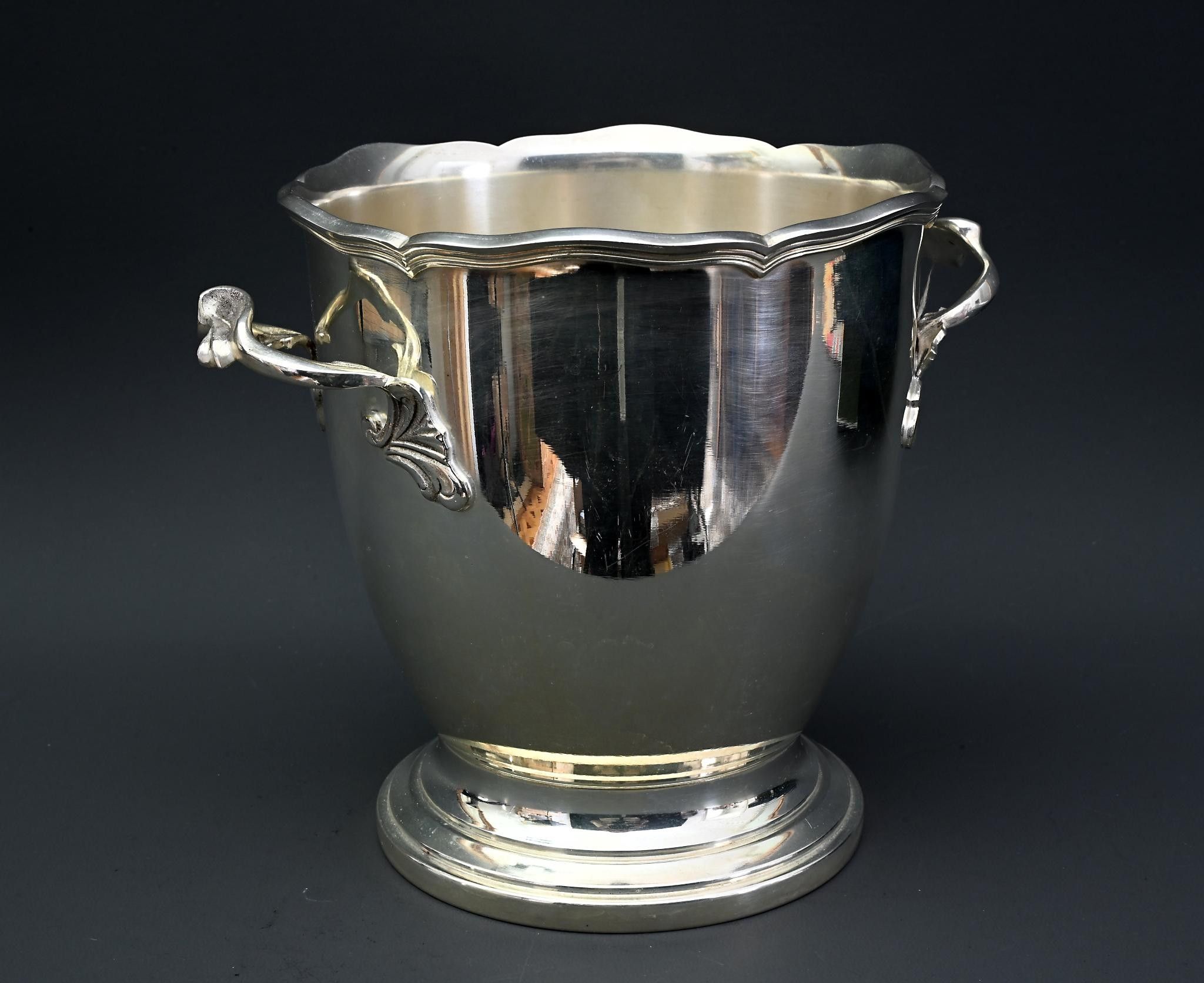A Medici-shaped silver-plated ice-cube bucket with a poly-lobed neck and handles in the form of leafy branches. Height 14.5 cm.