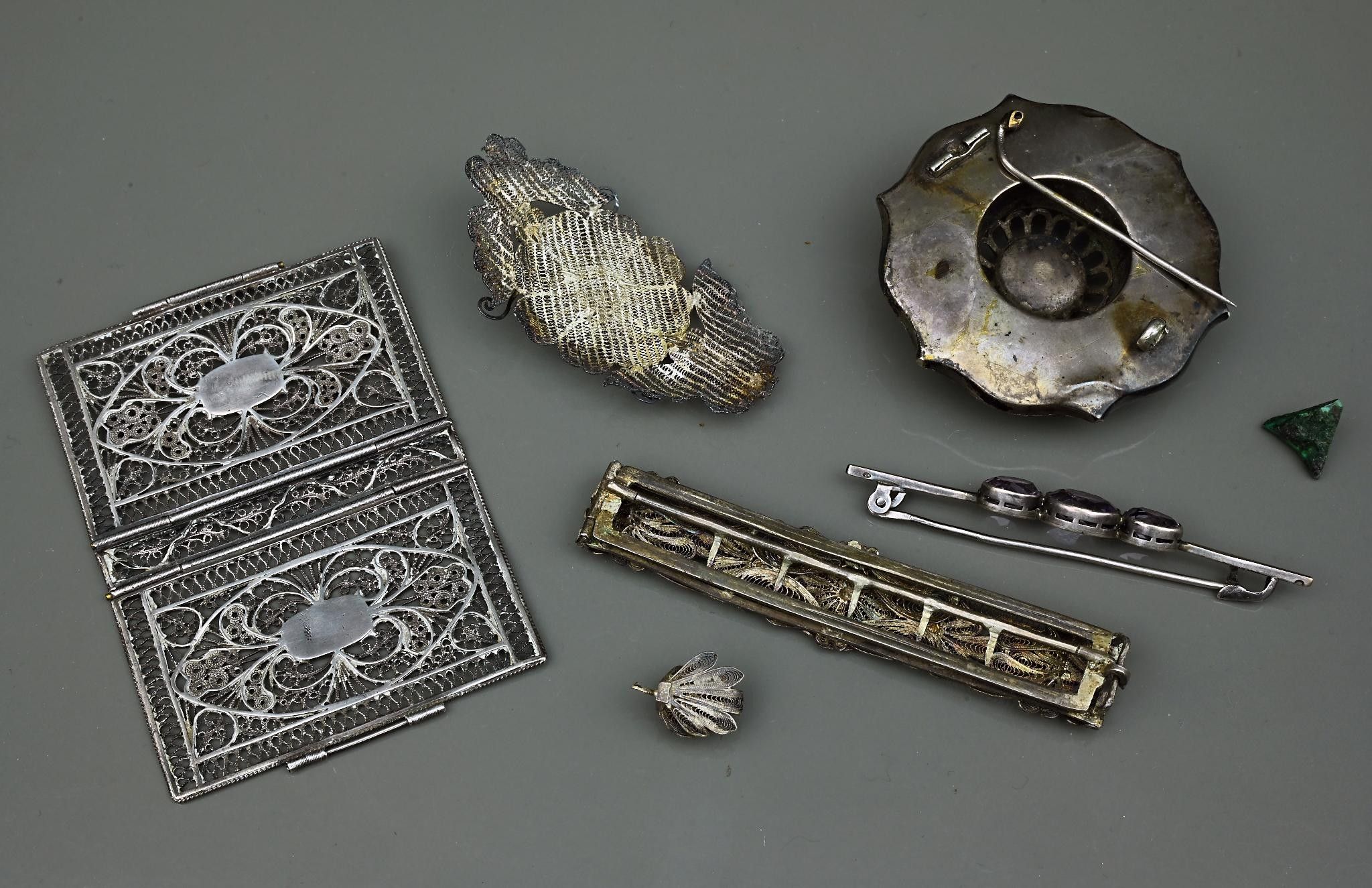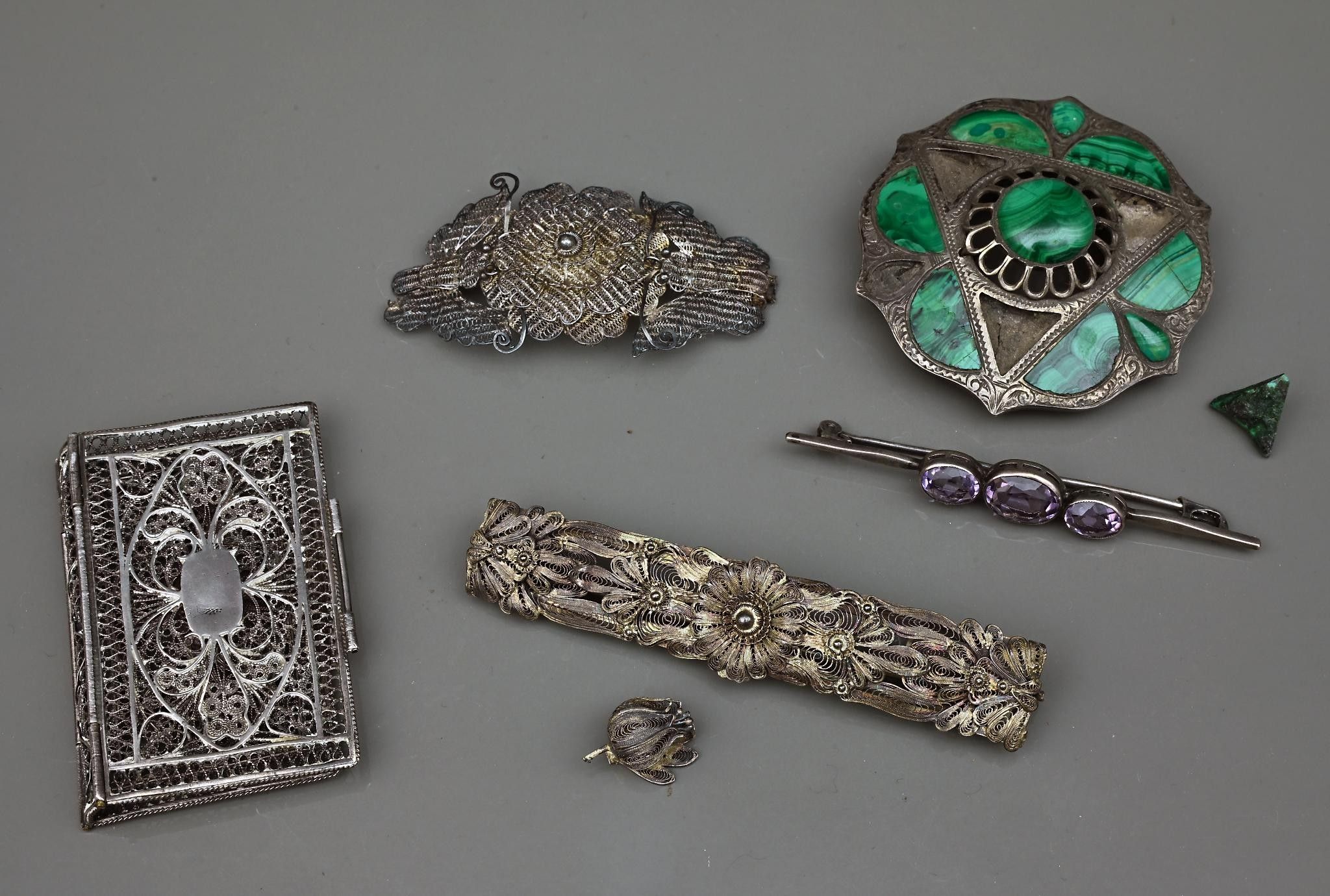 Small lot comprising: antique filigree metal hair clip and various filigree silver items, brooch adorned with malachite (missing and damaged), hair clip brooch adorned with violet stones.