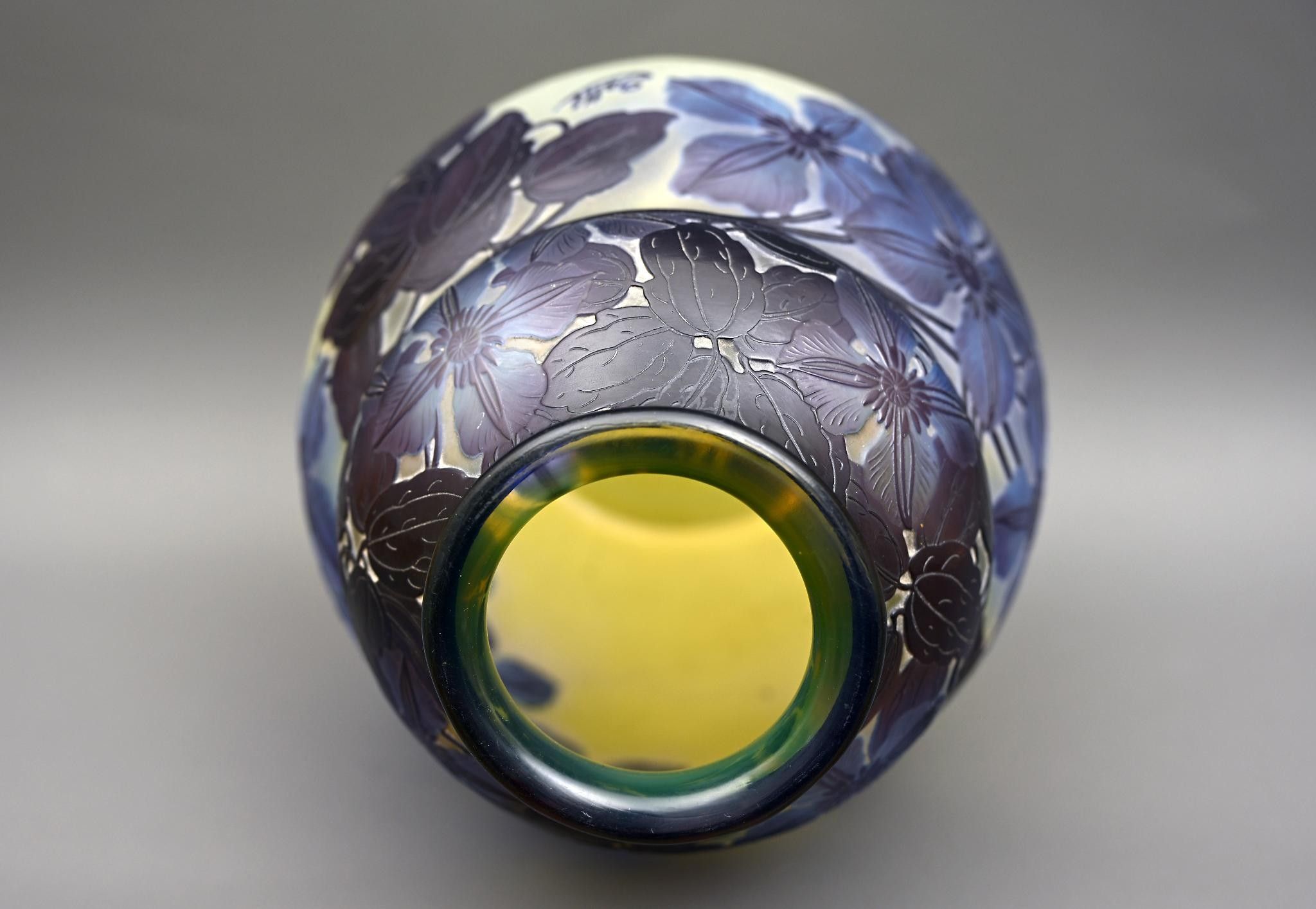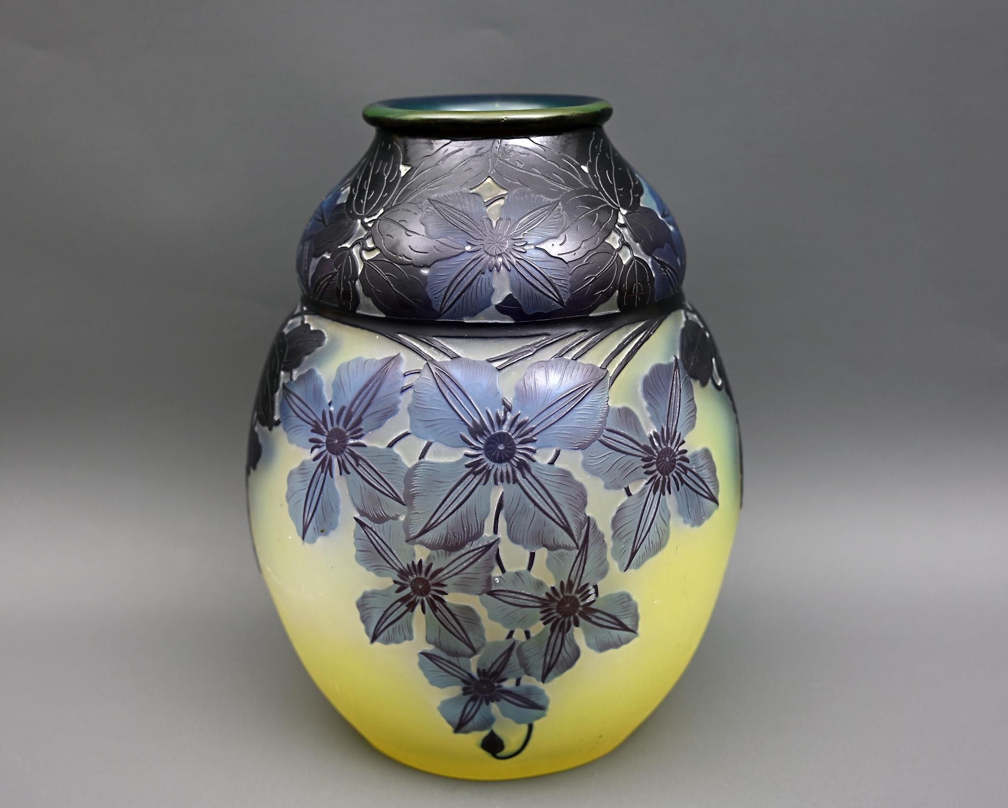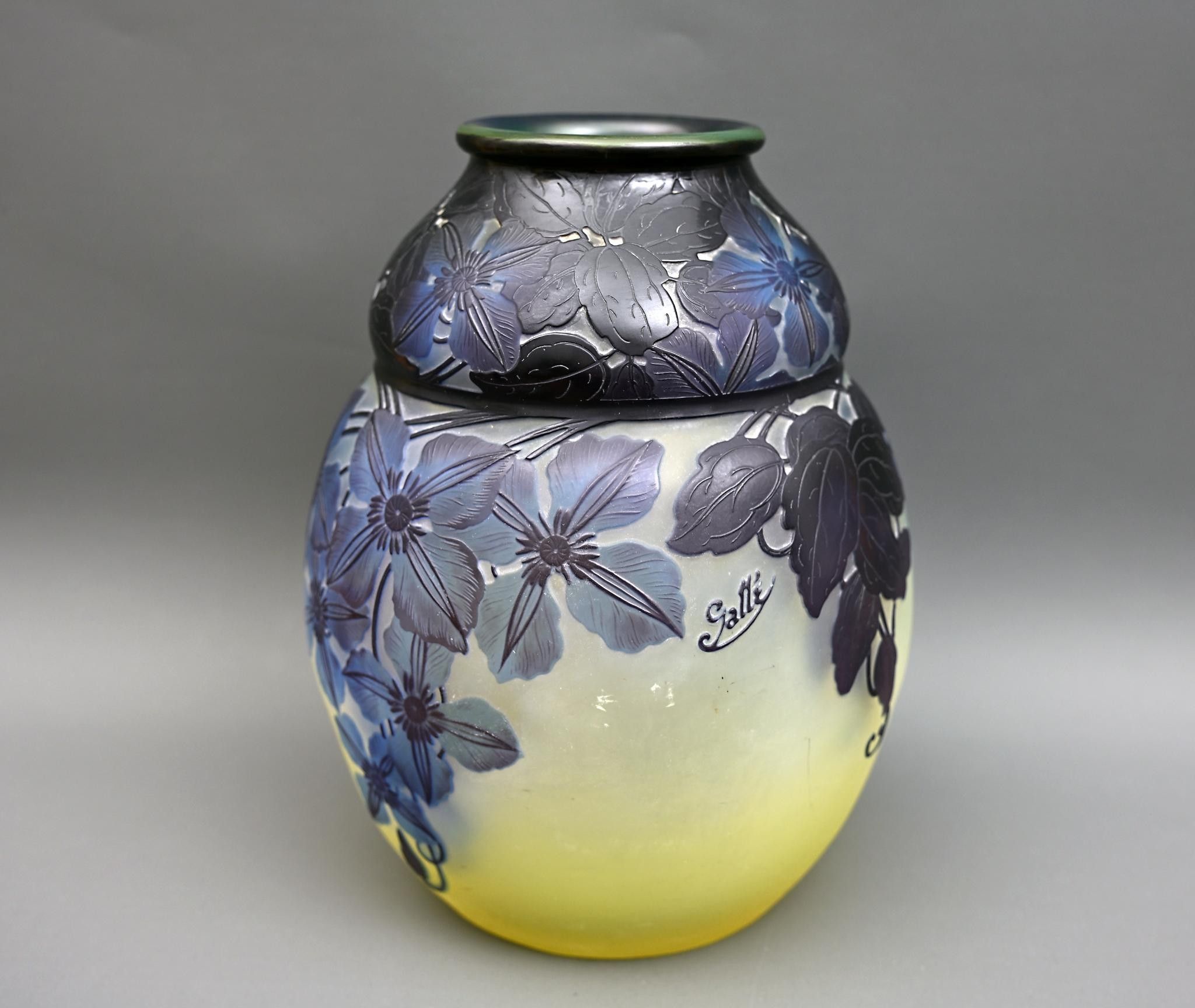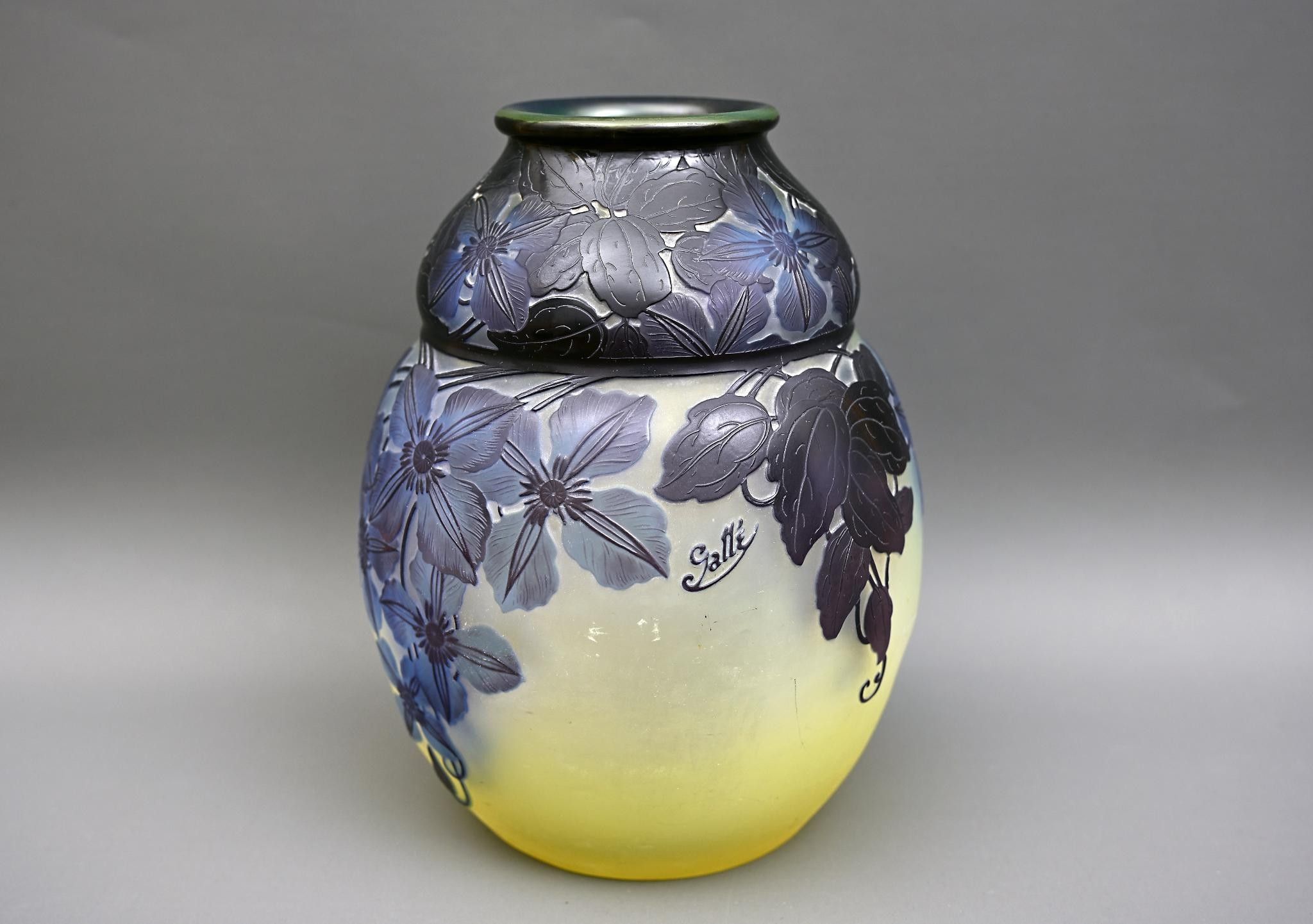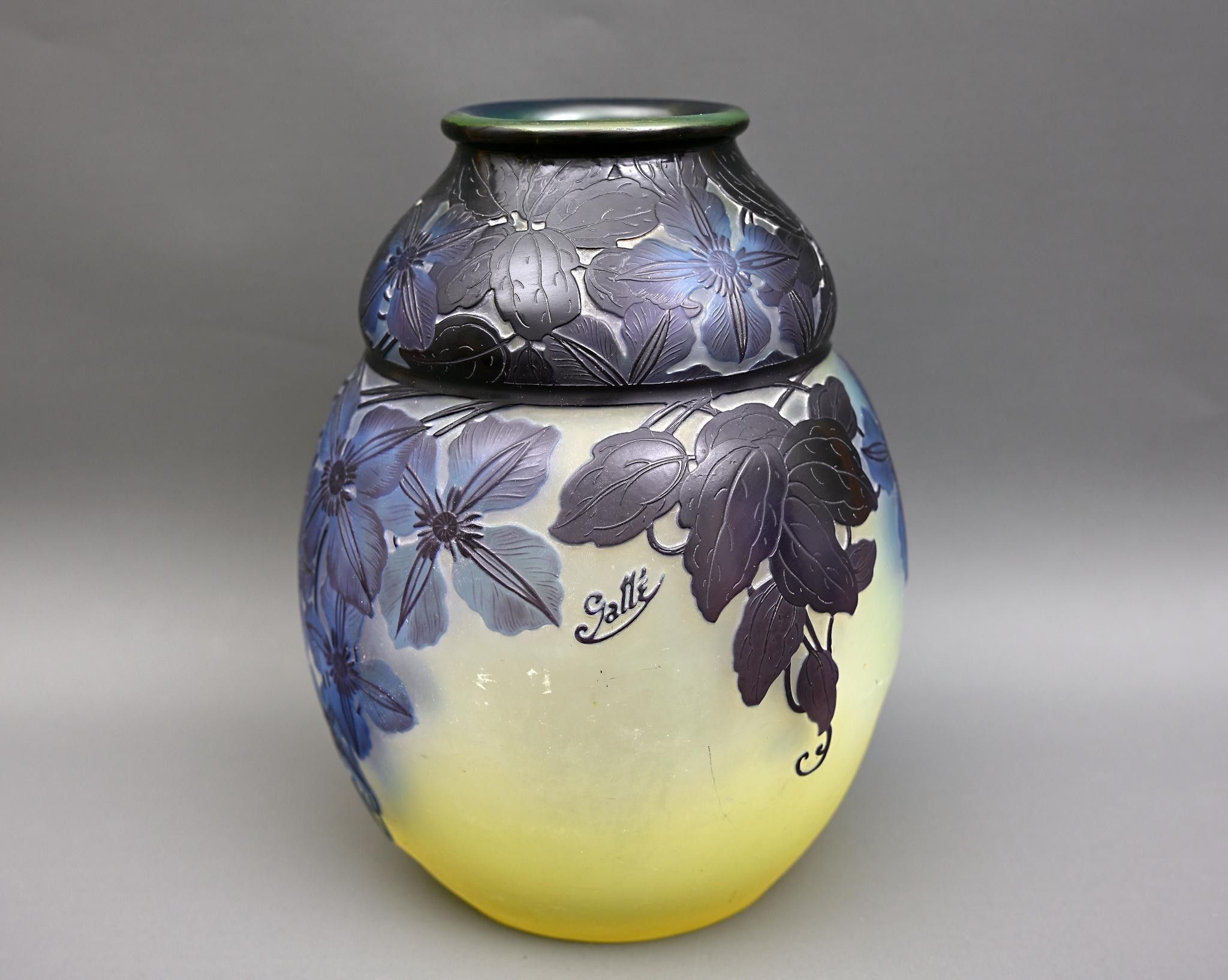 GALLÉ - Double-bowed acid-etched glass vase decorated with clematis. Signed on the body. Height 27 cm. A few marks of rubbing.