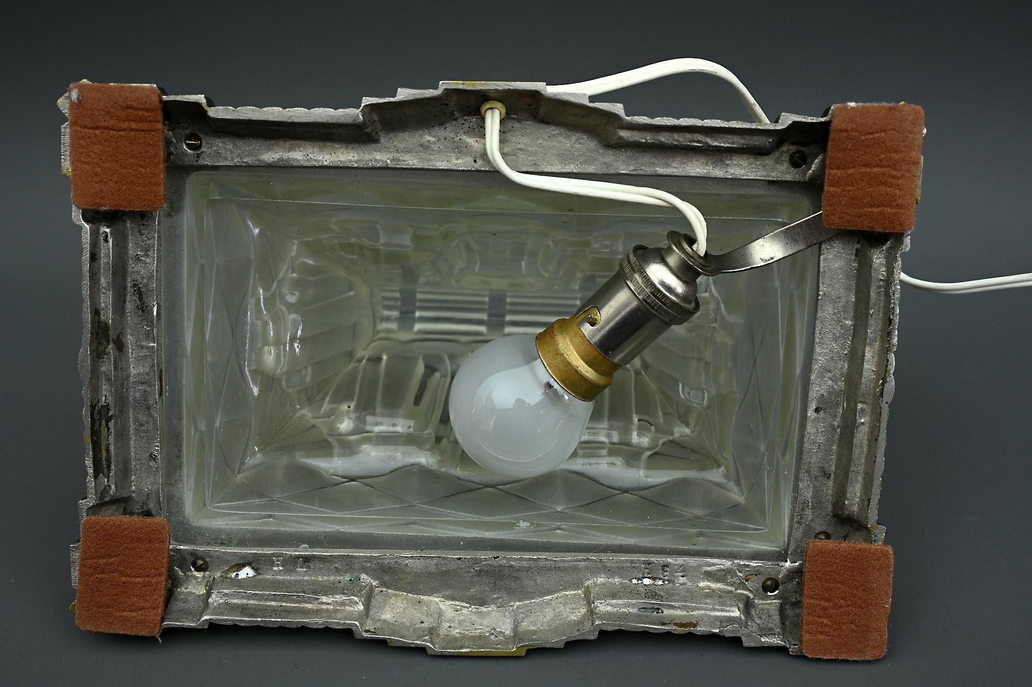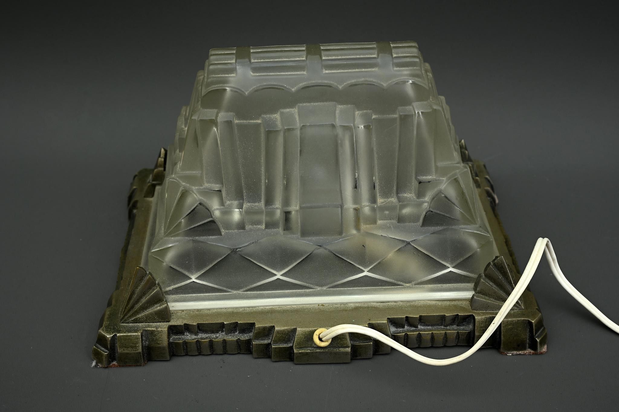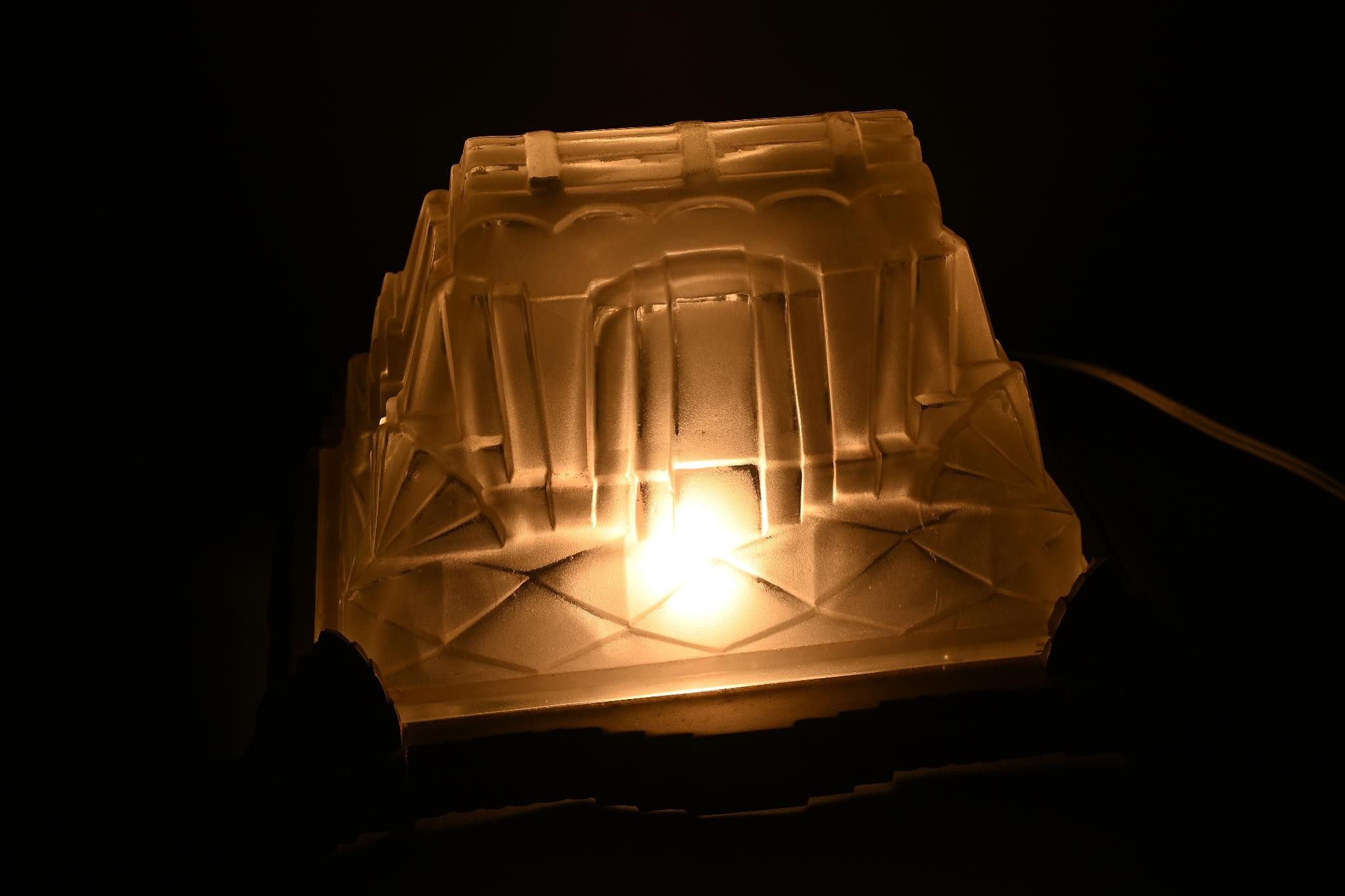Attributed to Léon HUGUE . Night-light in satin-finish pressed glass mounted with electricity and metal structure. Art Deco period. Dimensions 24 x 15 x 14 cm.