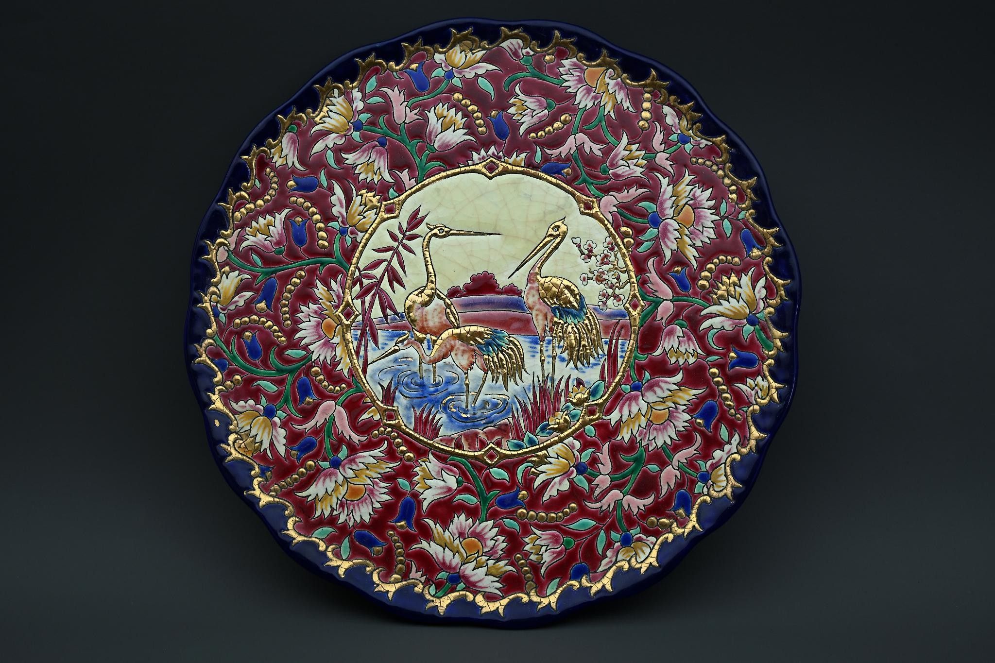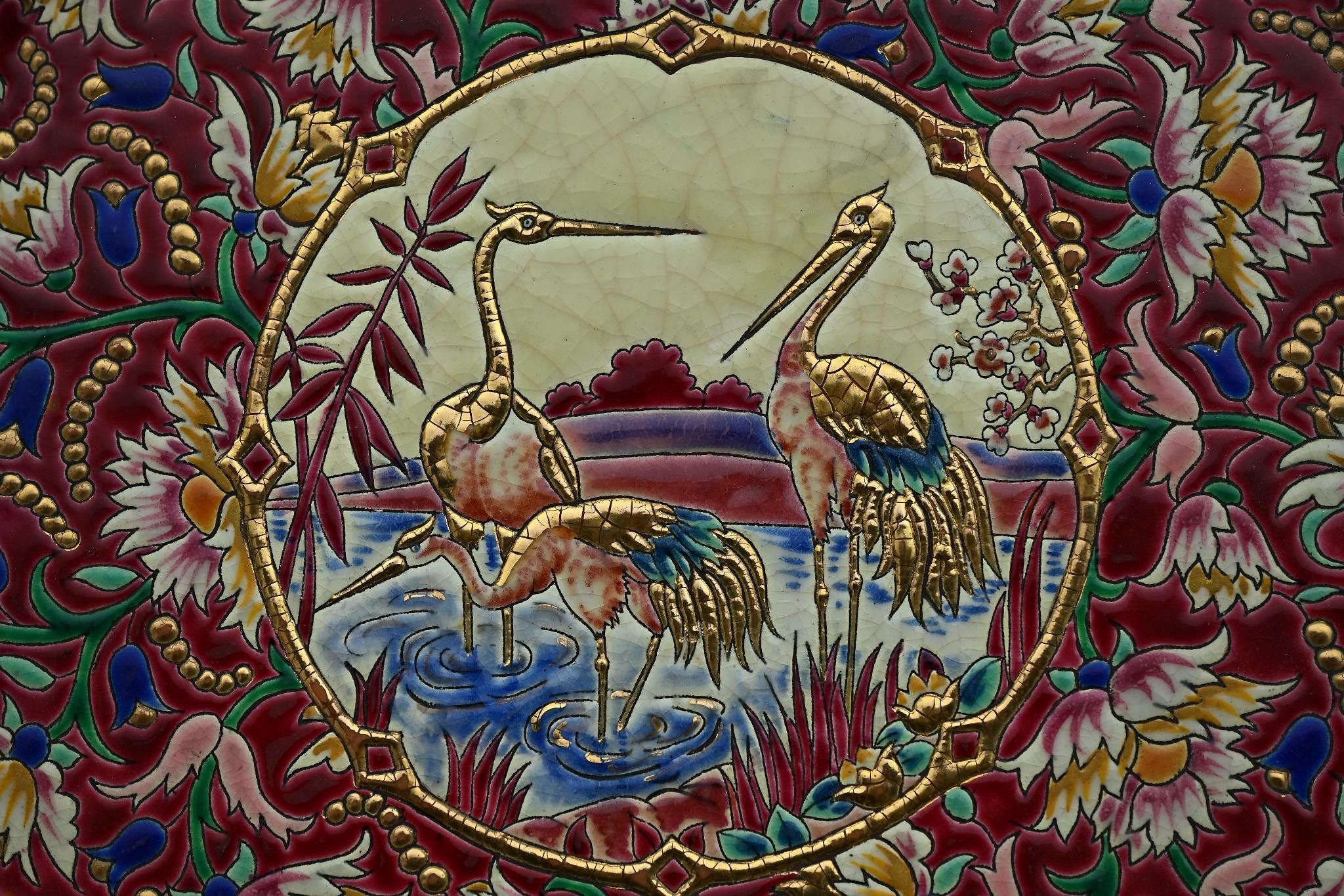 LONGWY - Fine earthenware cheese or pie plate with enamelled decoration of flowers and a scene of three herons in a lakeside landscape. Diameter 34 cm.
