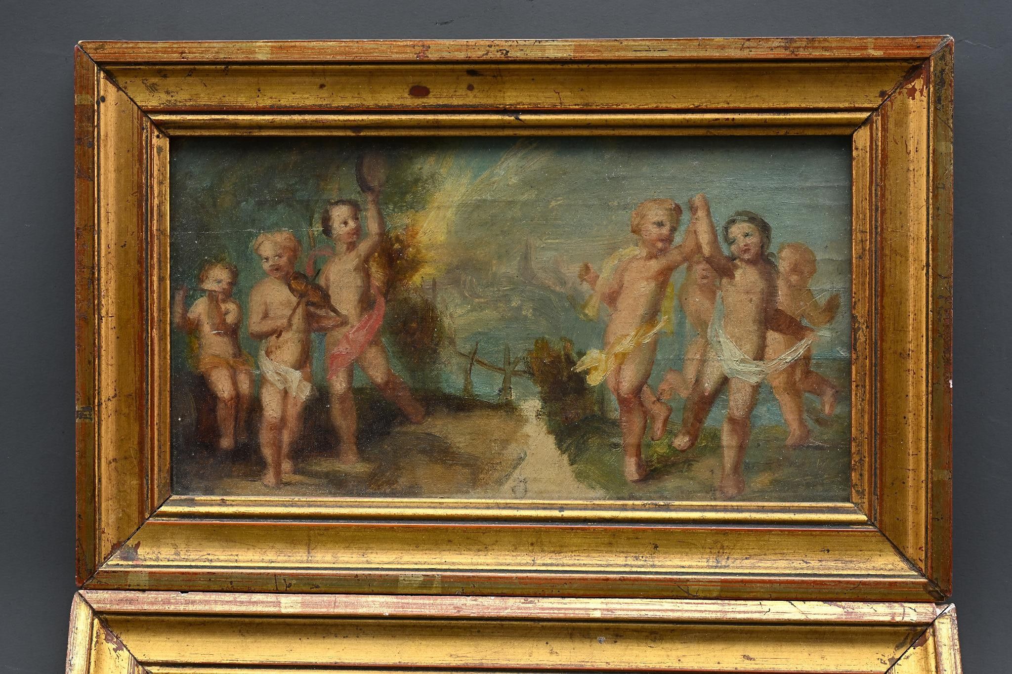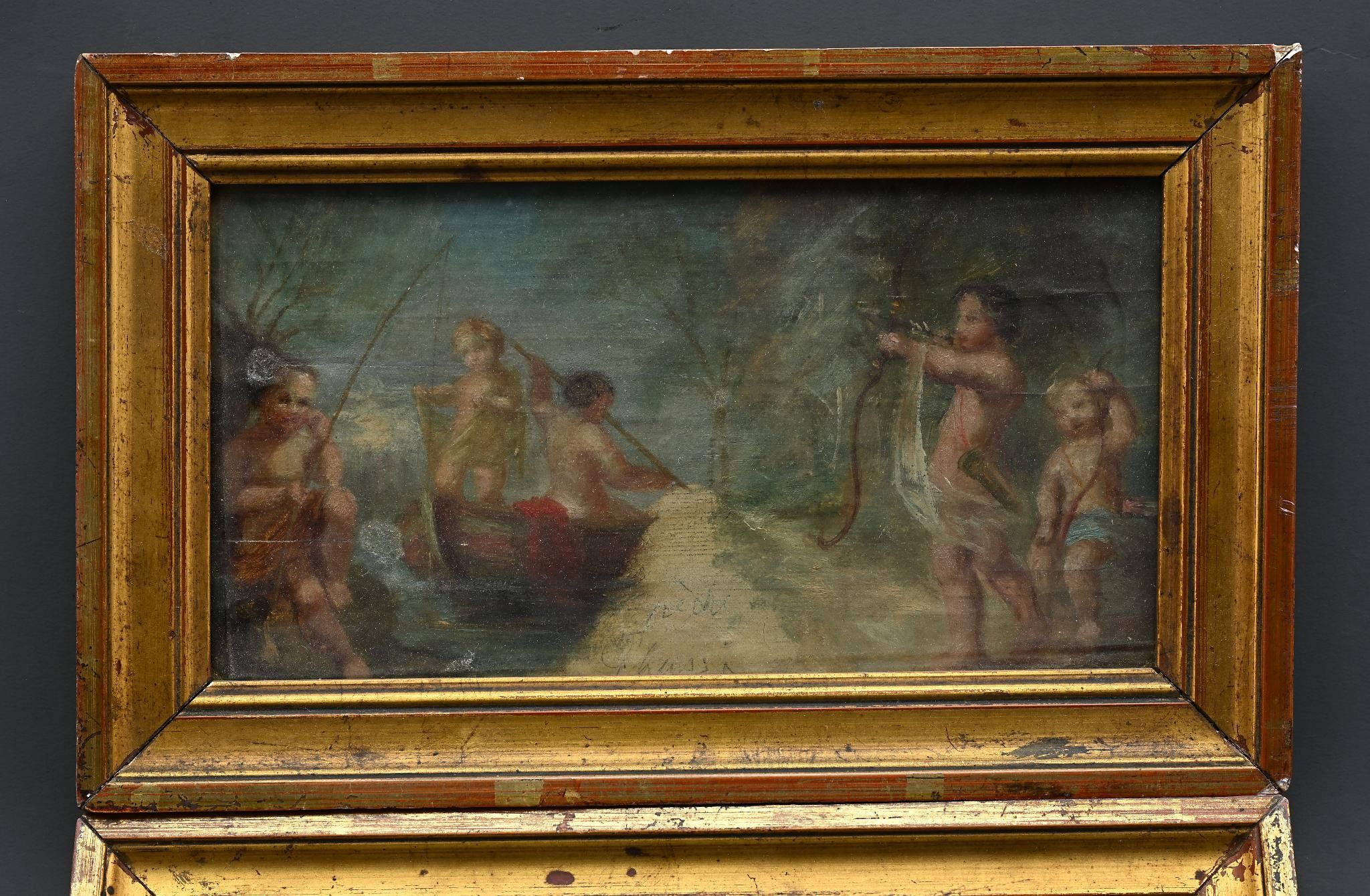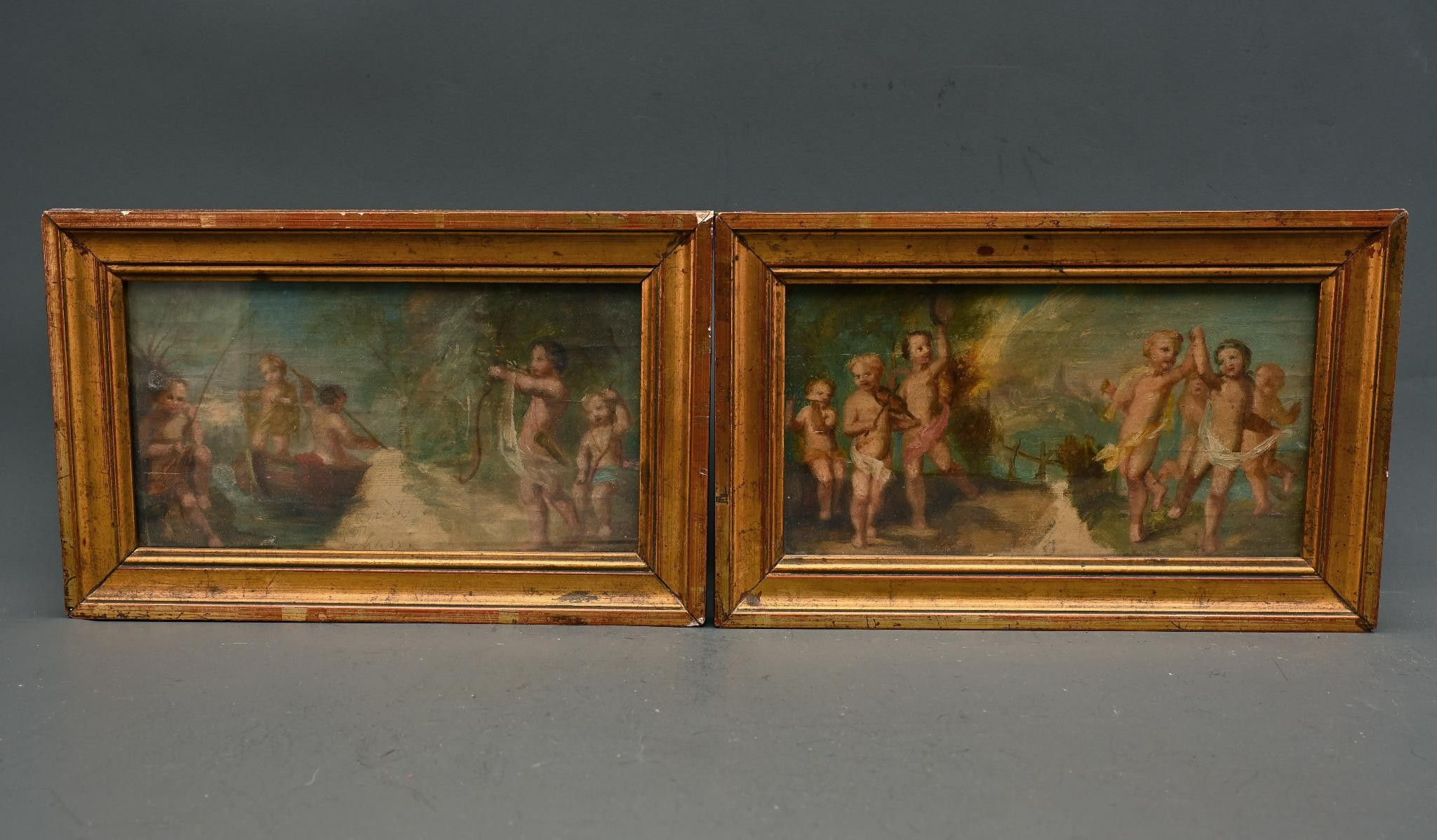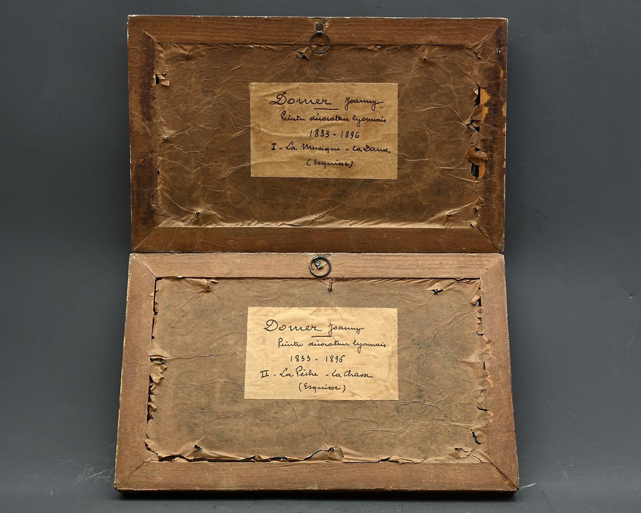 Joanny DOMER (1833-1896) Music, Dance and Fishing, Hunting. Pair of framed paintings, titled and inscribed with the author's name in ink on the back. 12 x 22 cm