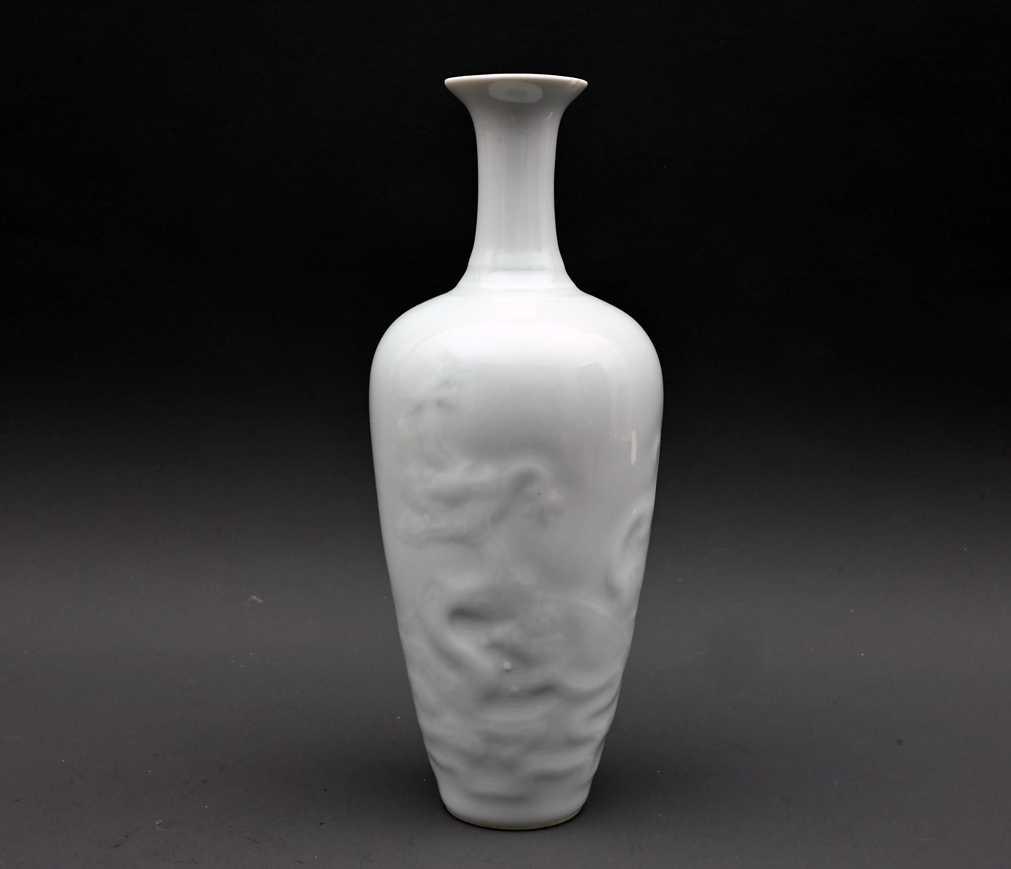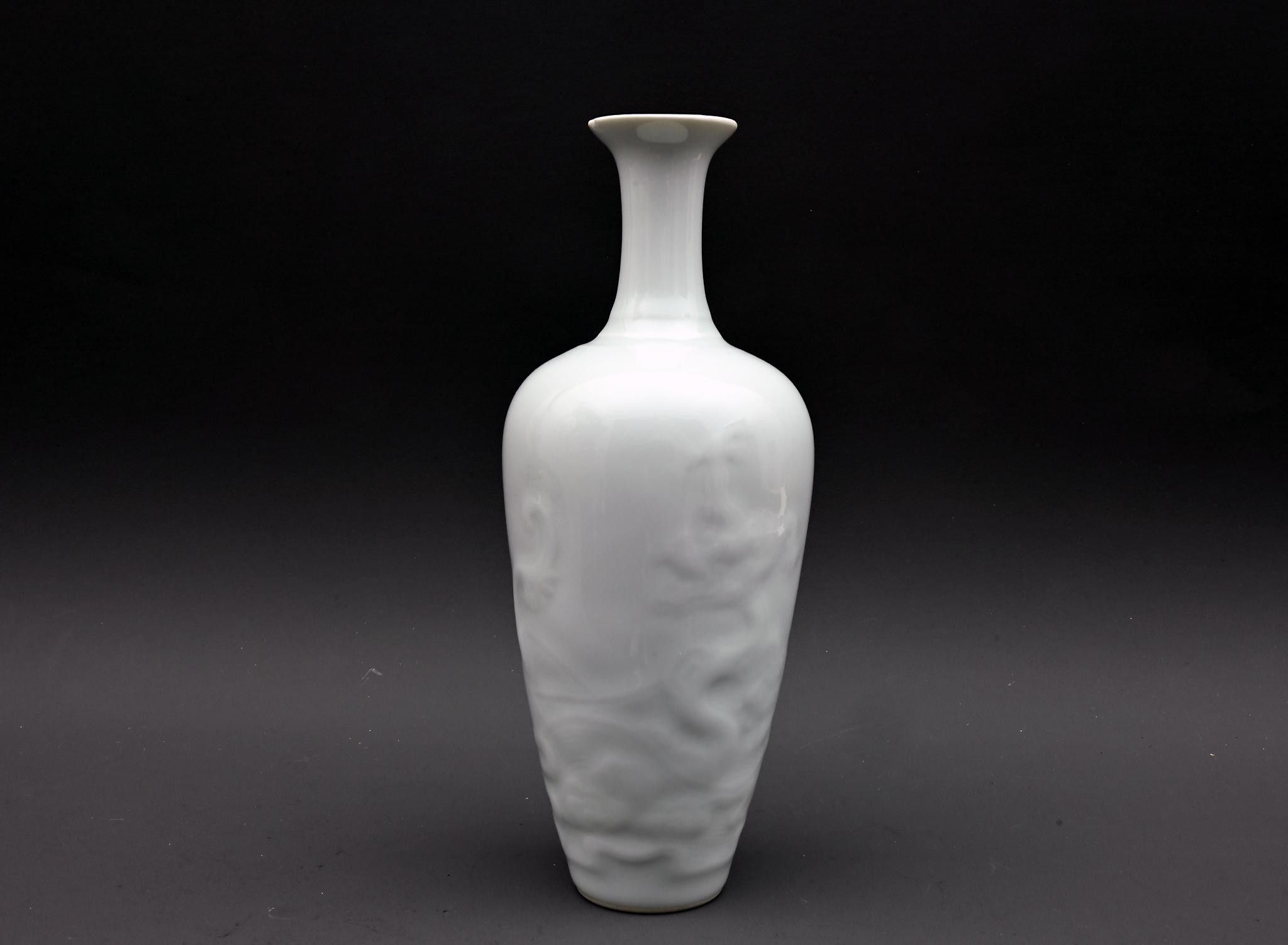 A white porcelain vase decorated in relief with dragons.