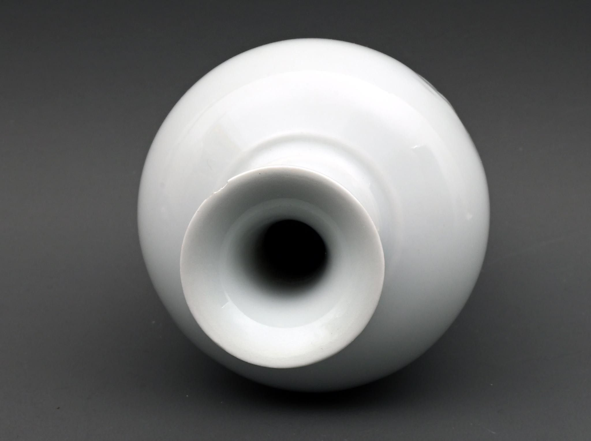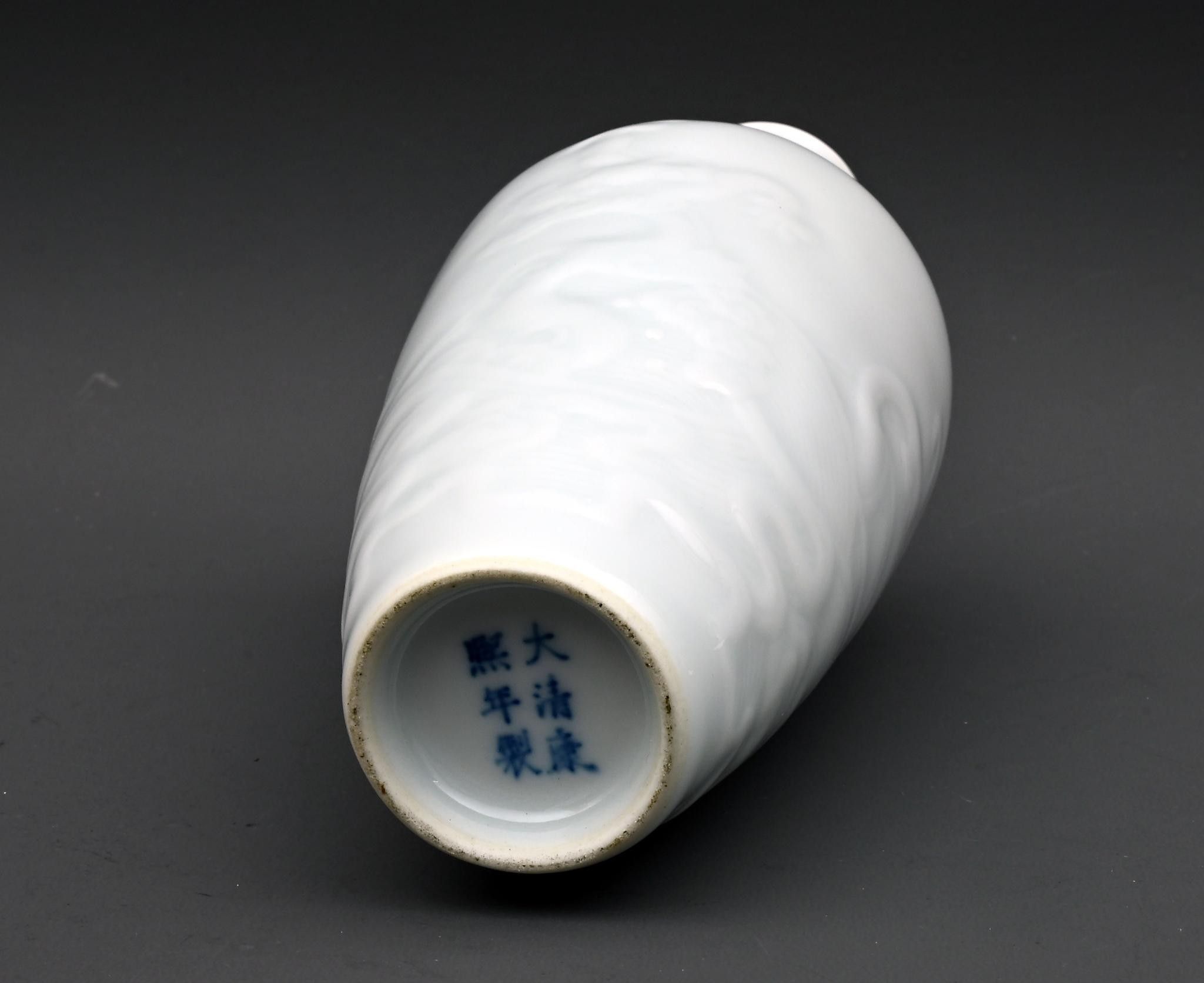 A white porcelain vase decorated in relief with dragons. China, Kangxi period. Height: 19.5 cm. Mark under the base. Small chip to the neck.