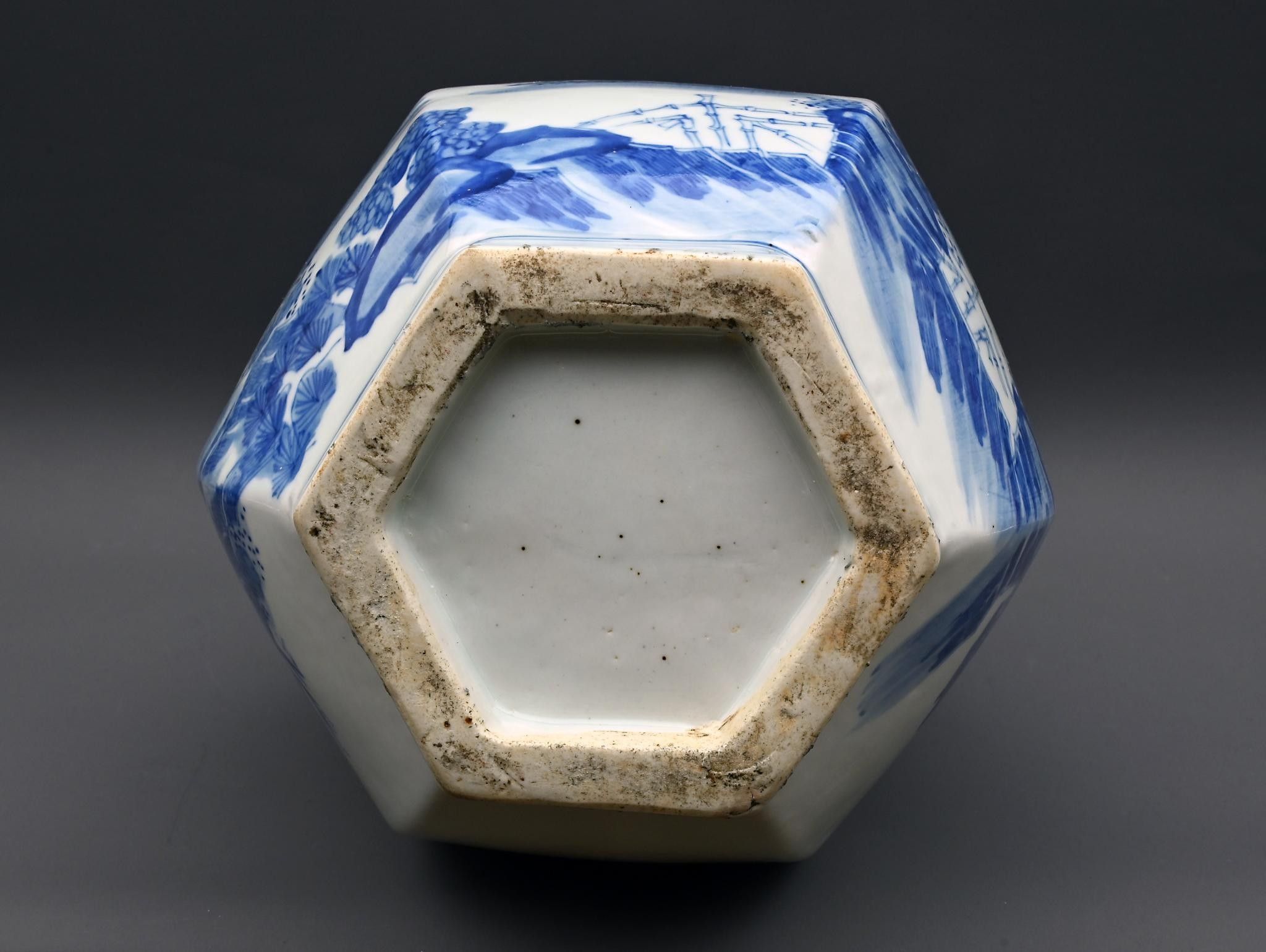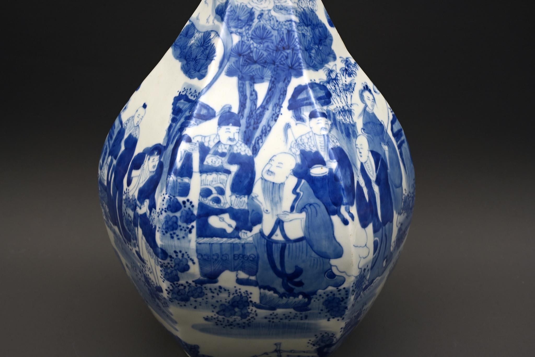 Large white-blue porcelain vase decorated with figures.