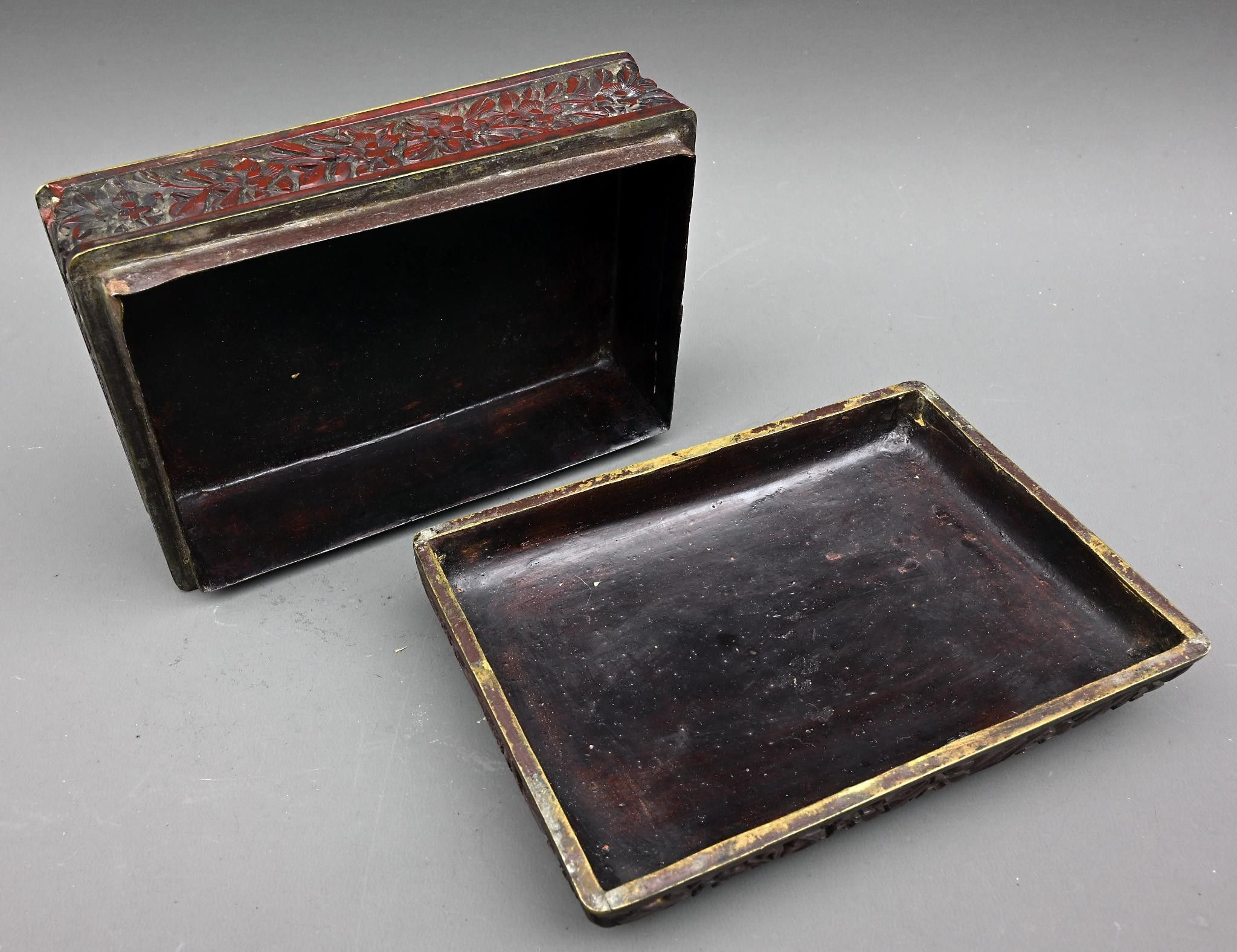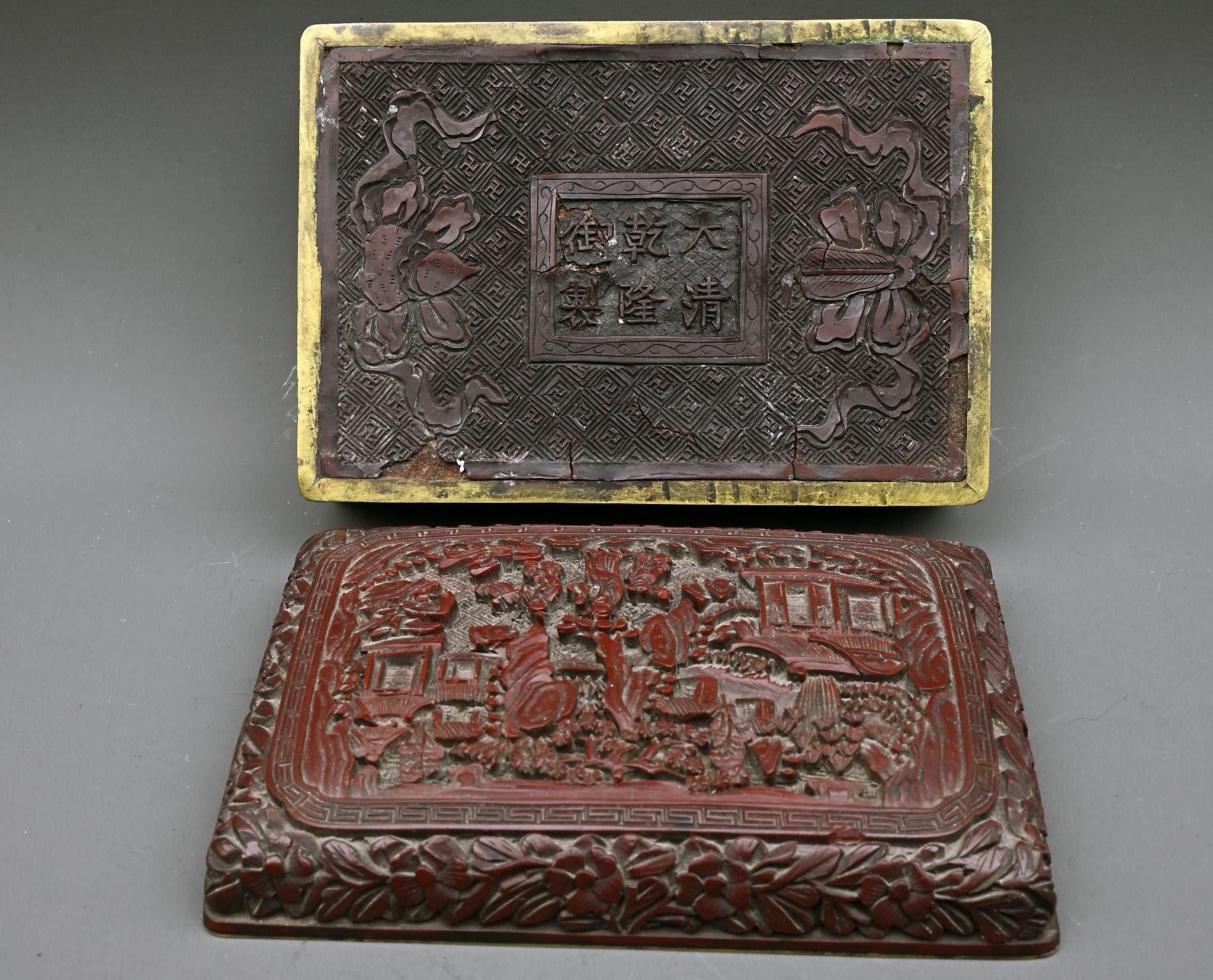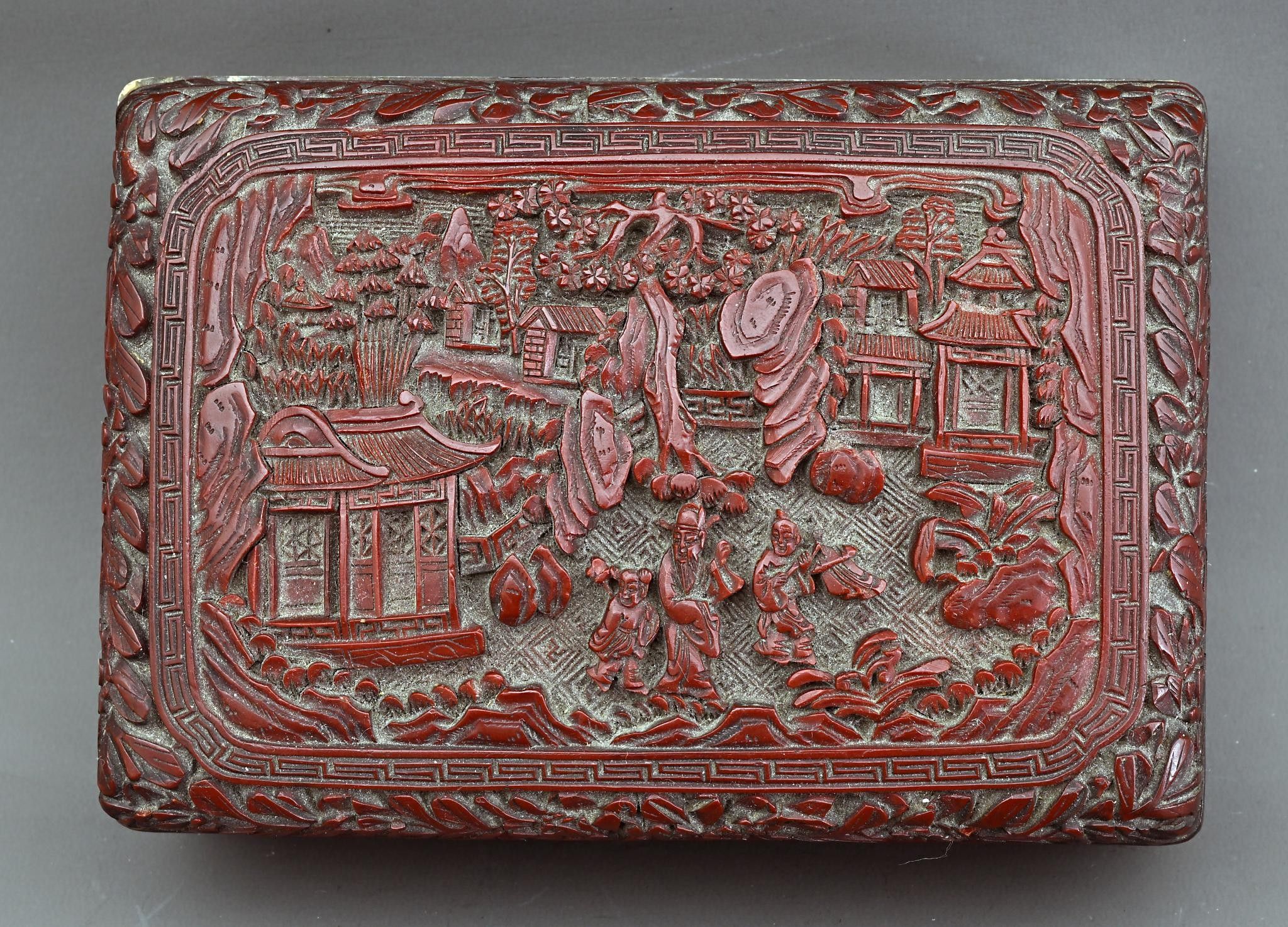 Cinnabar lacquer box with relief decoration of a palace scene. 14.6 x 10.3 cm.