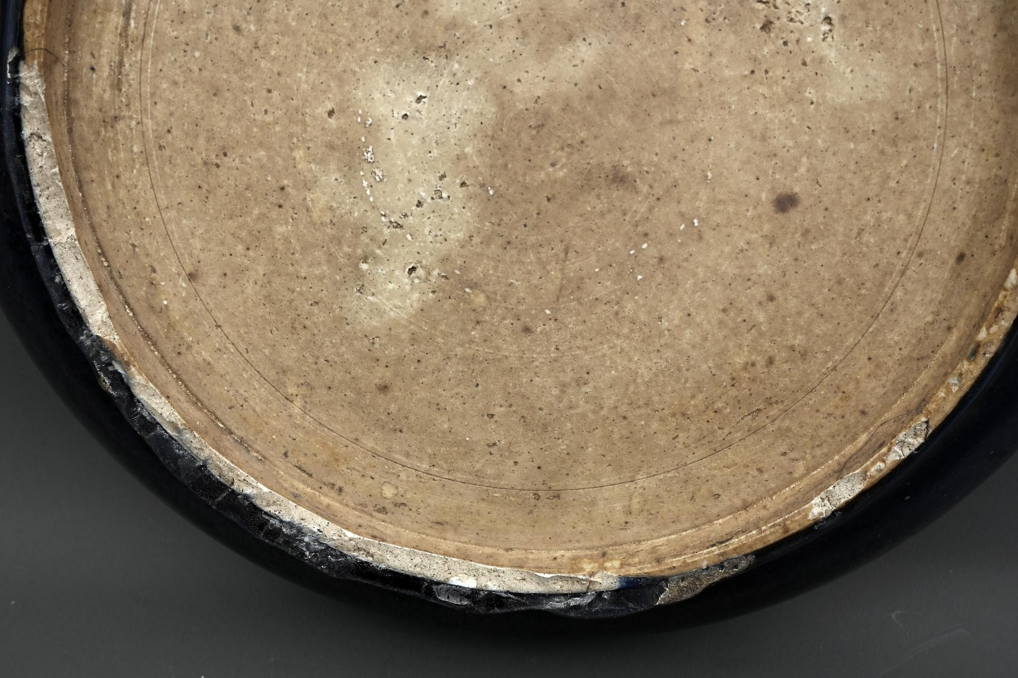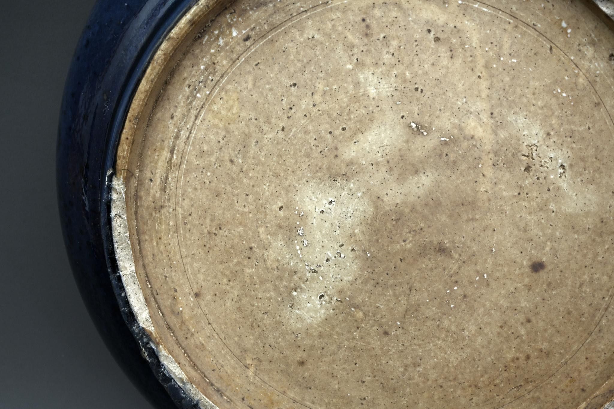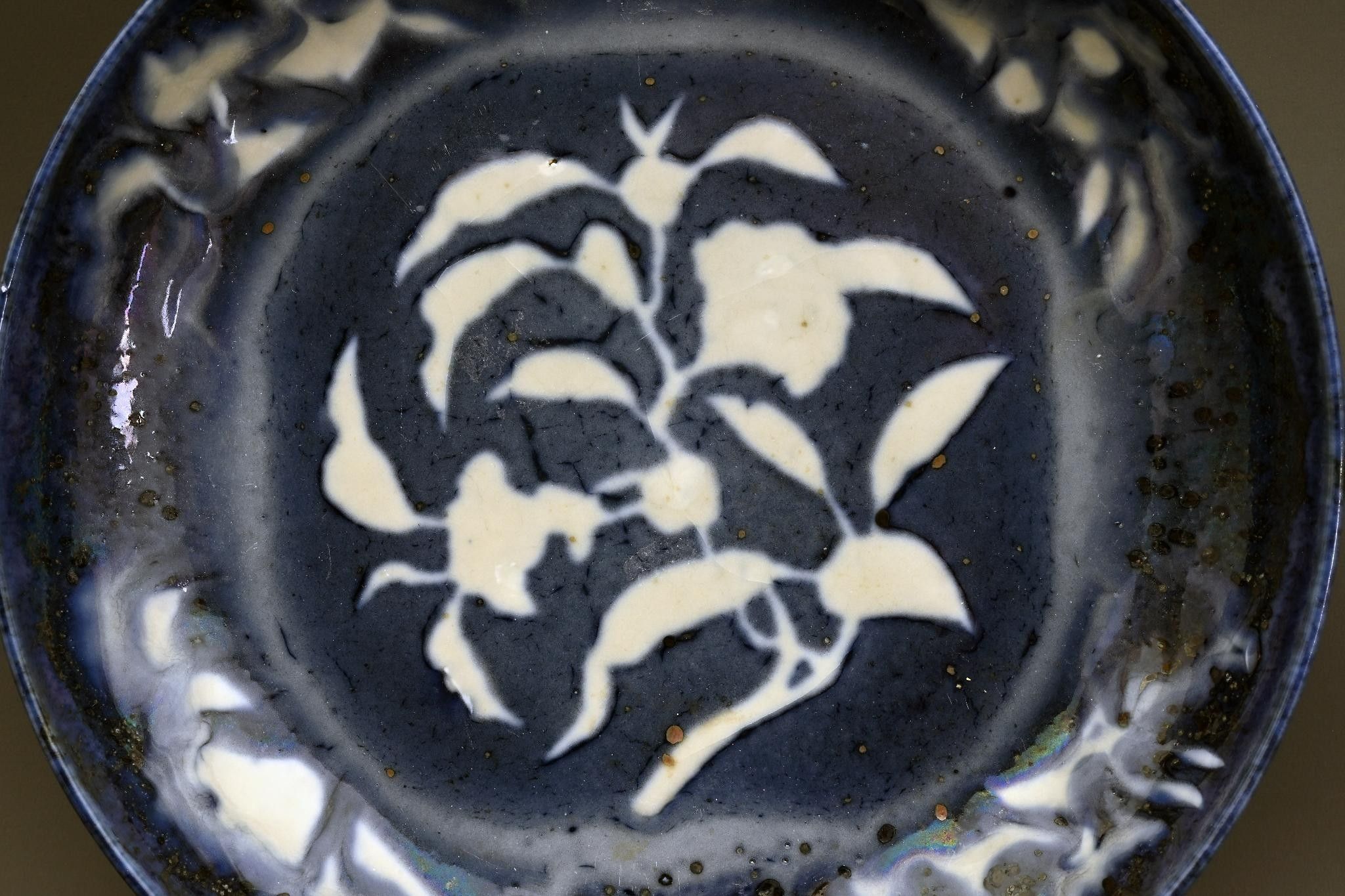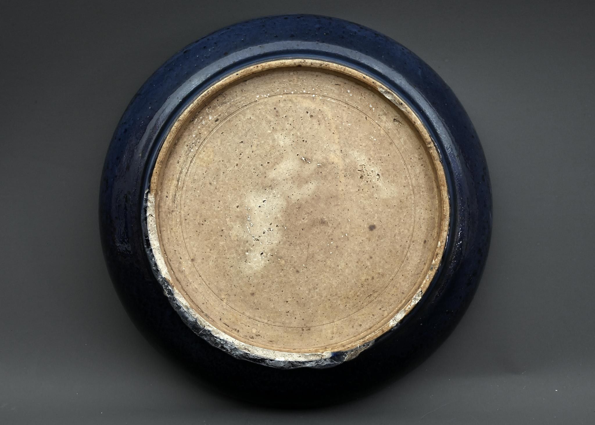 Large deep porcelain dish with blue glaze decorated with white flowers. Diameter 27 cm. Height 5.5 cm. Wear under the base. China Ming period.