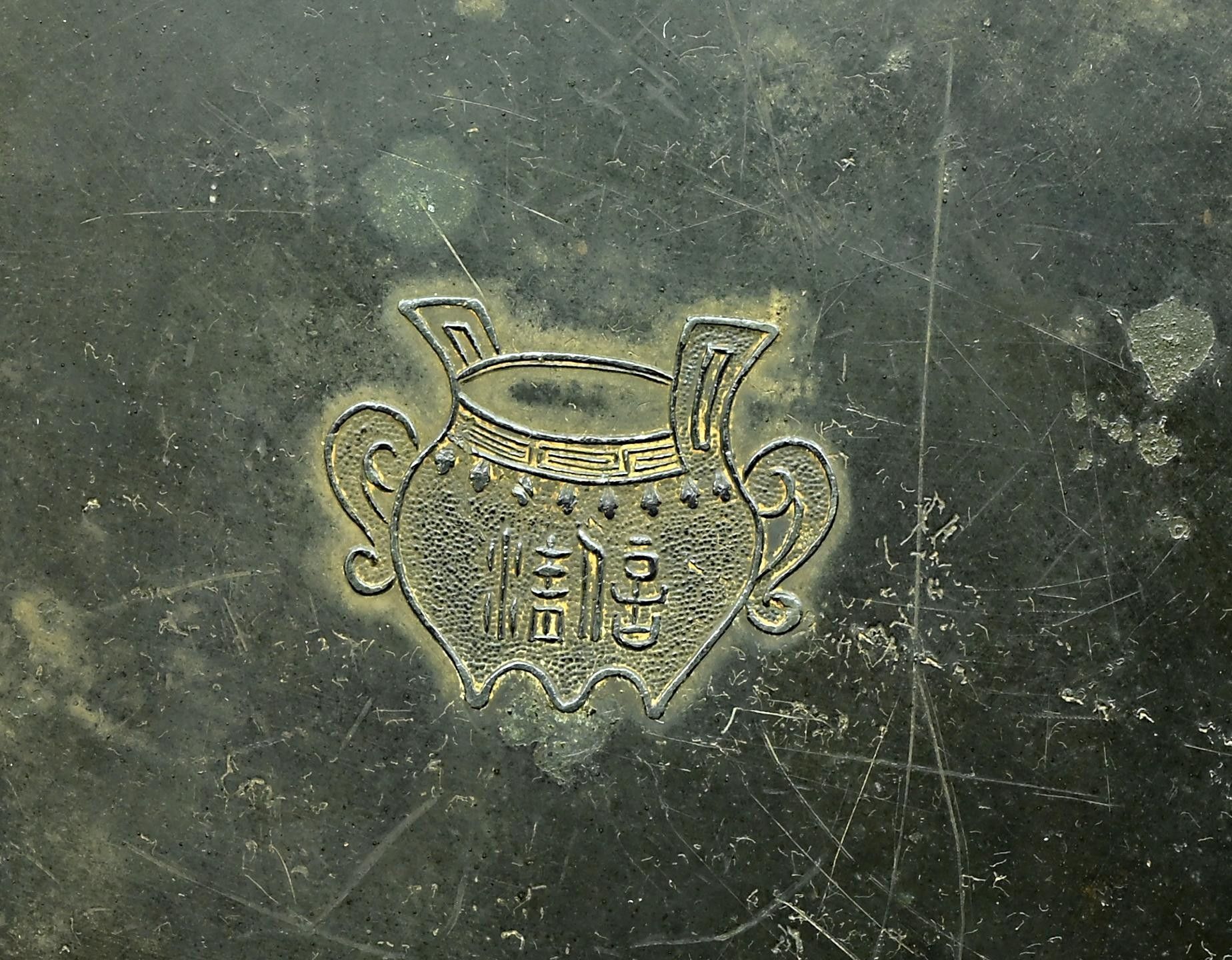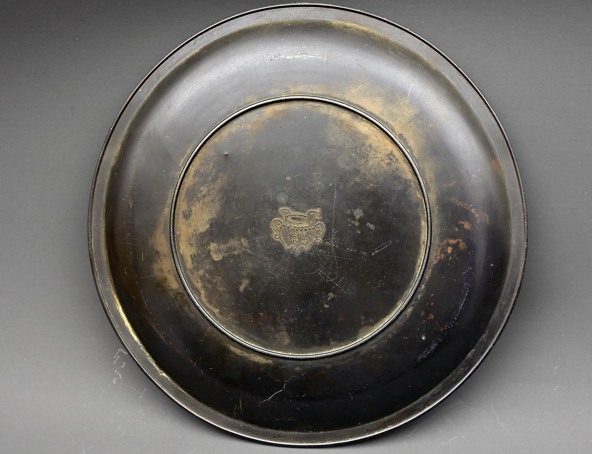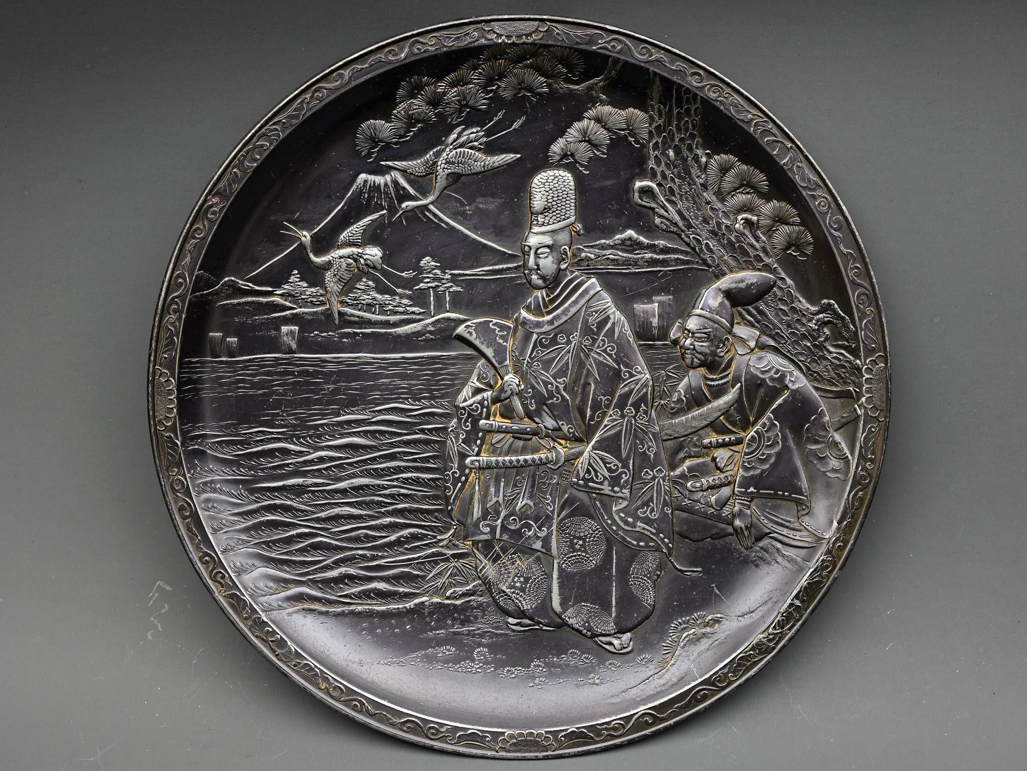 Metal plate with relief decoration of samurai and cormorants in front of Mount Fuji. Diameter 22 cm.