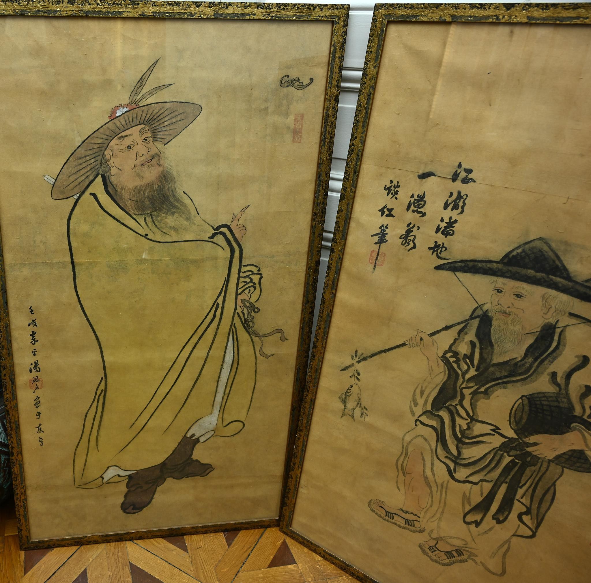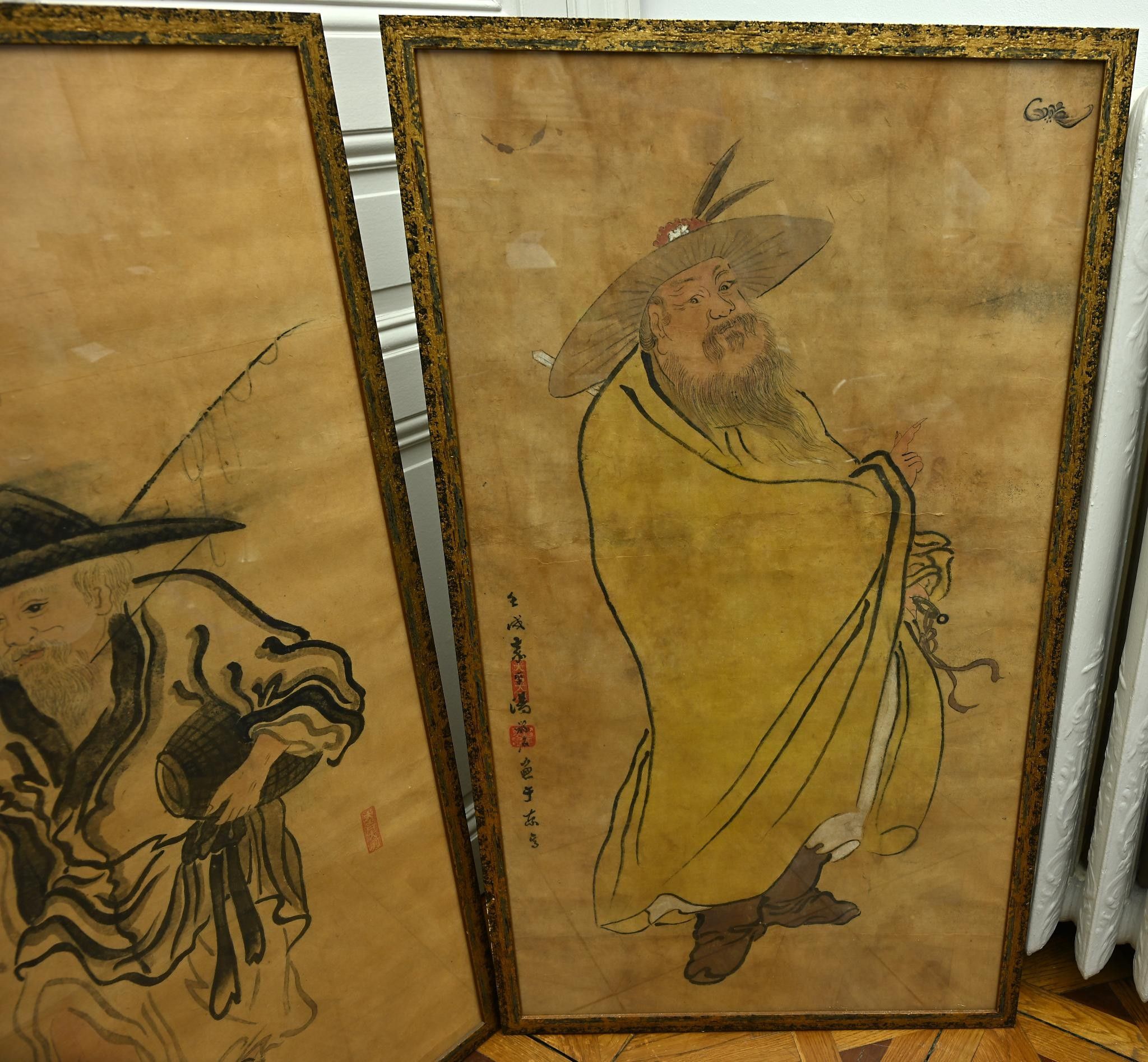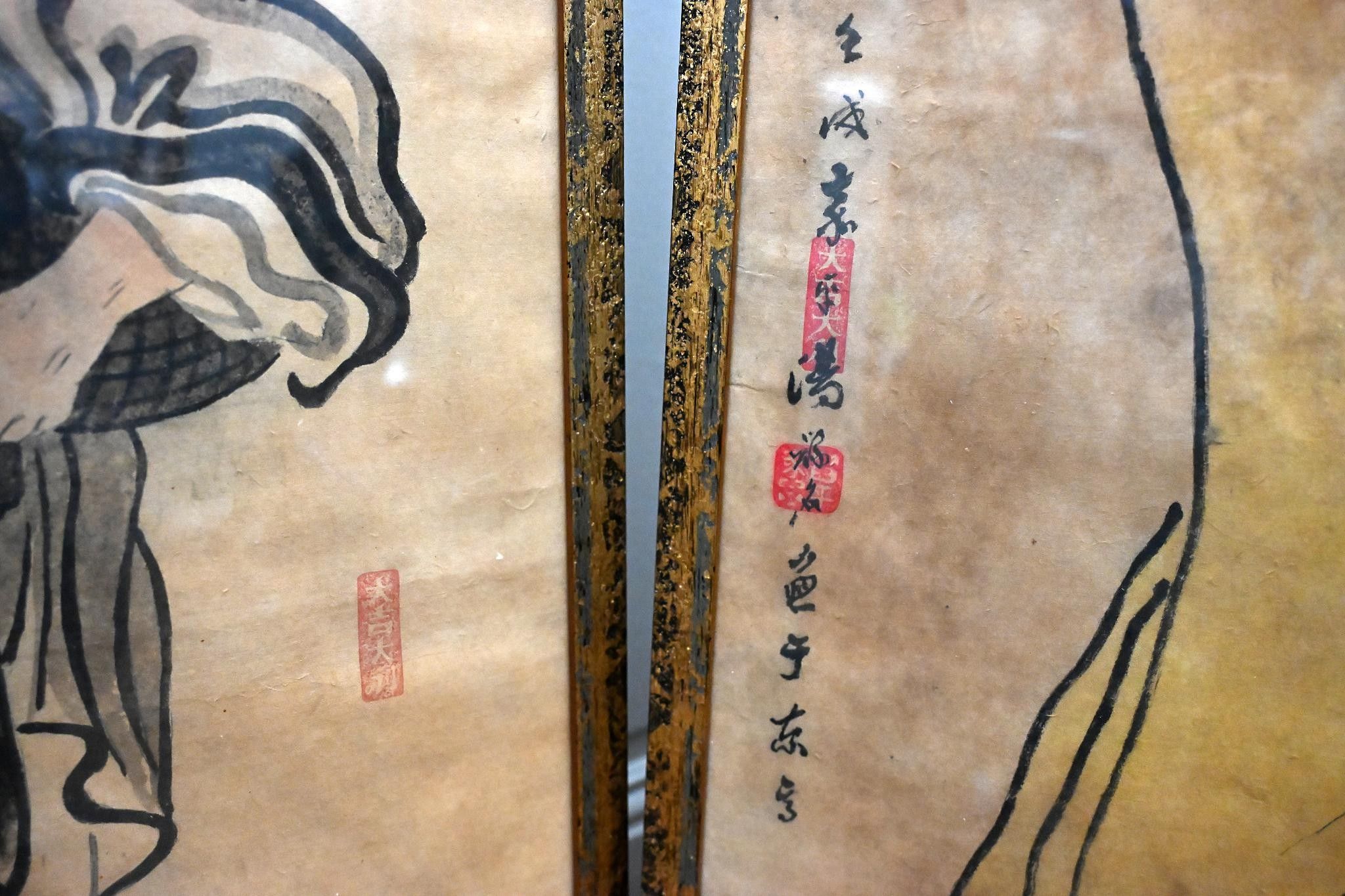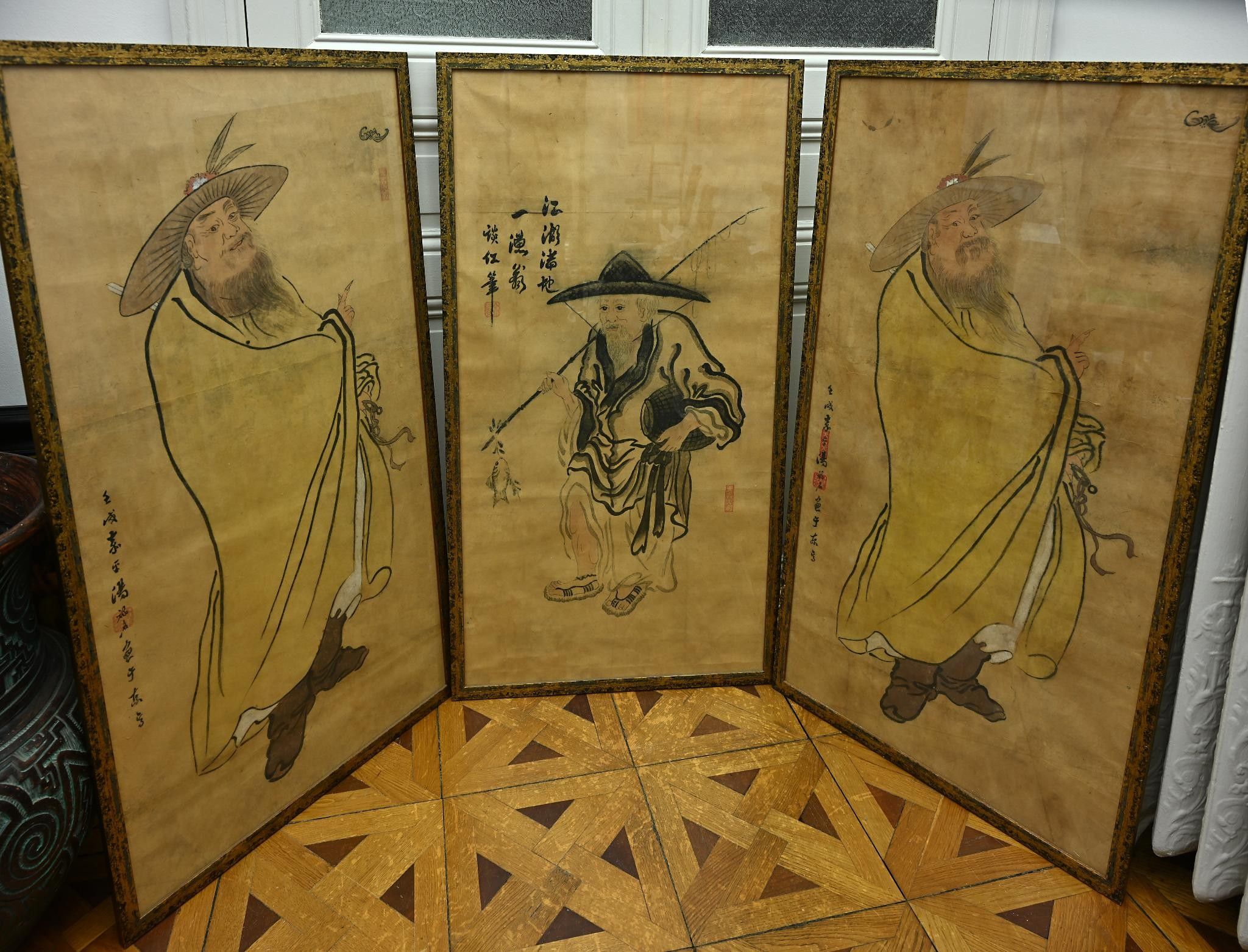 China - Characters suite of three drawings in ink and colour on paper Dimension 104 x 56 cm on view.