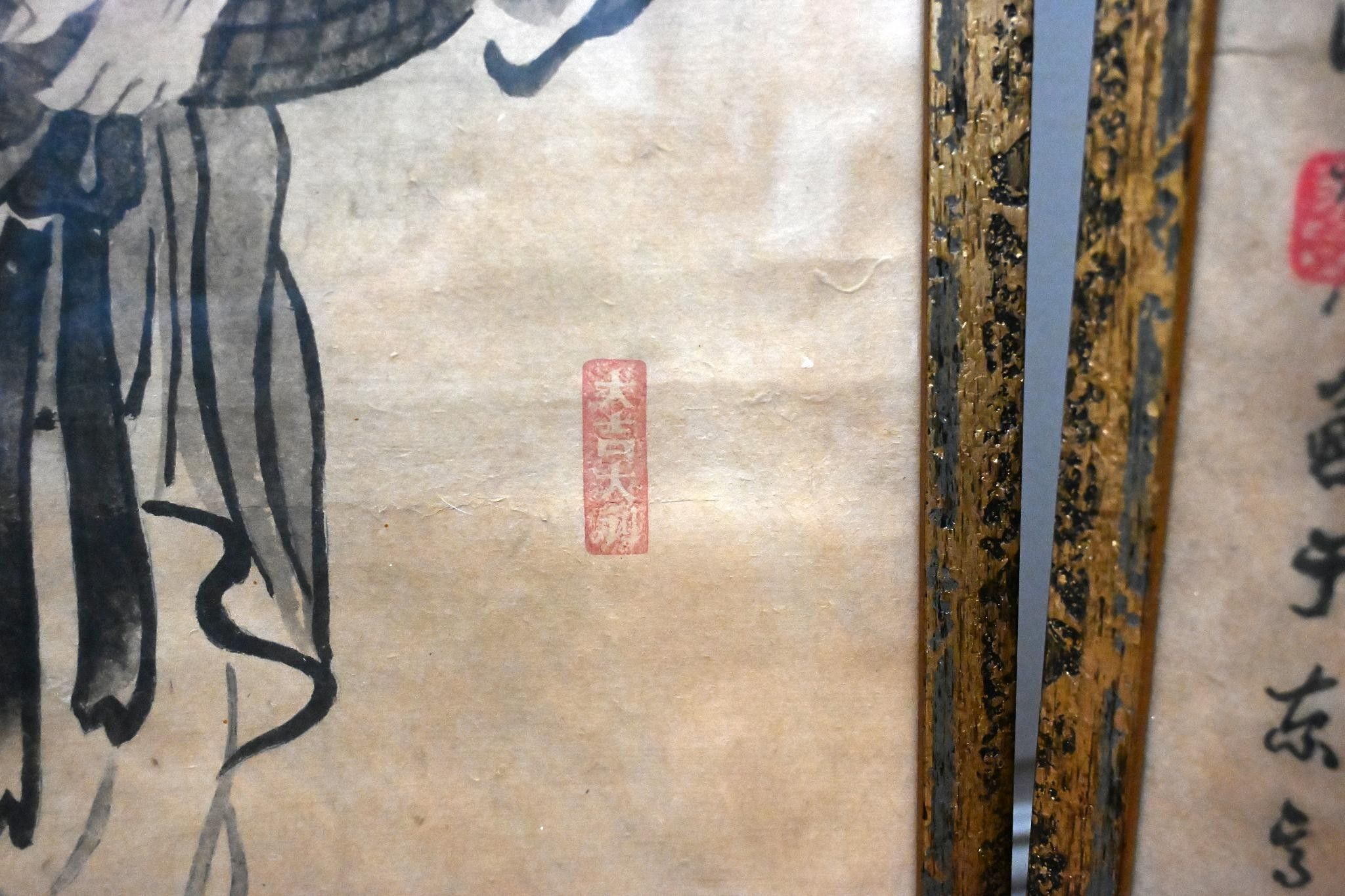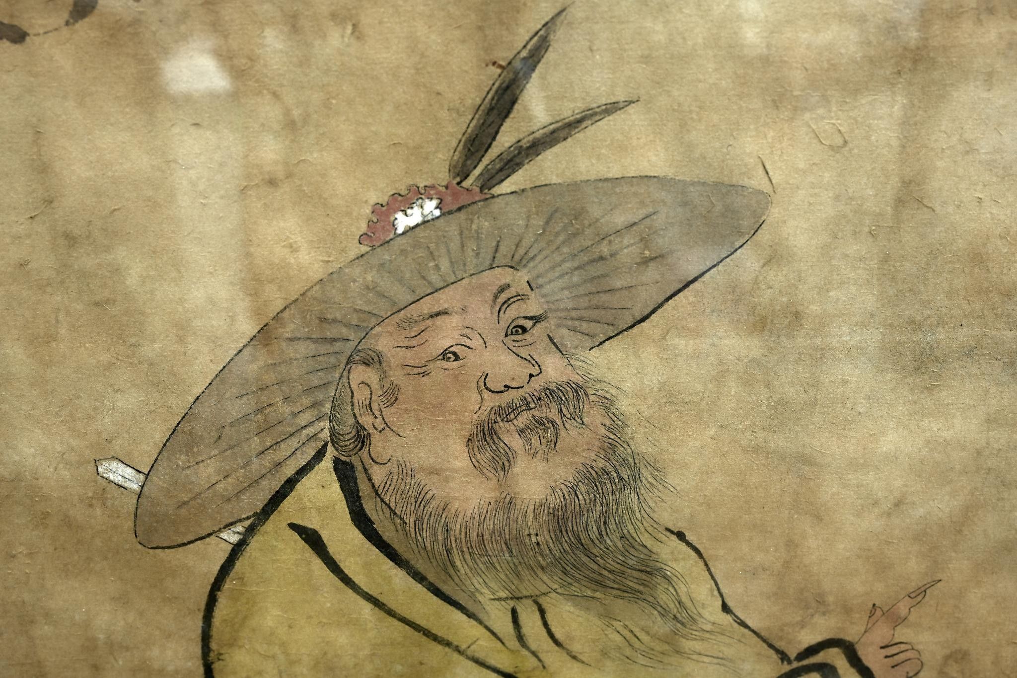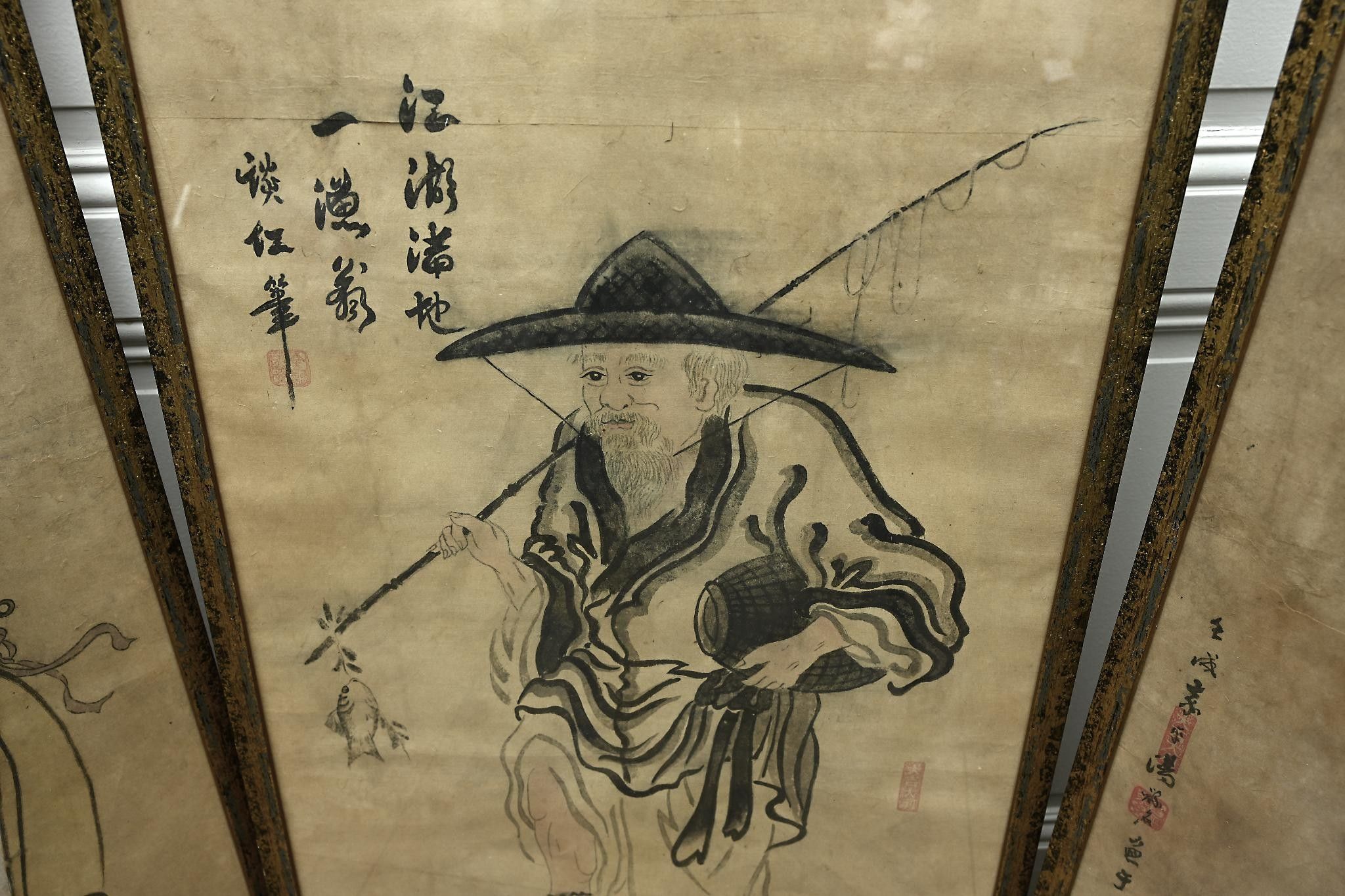 China - Characters suite of three drawings in ink and colour on paper Dimension 104 x 56 cm on view.