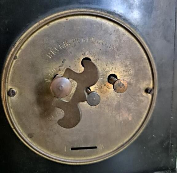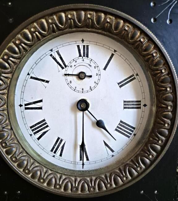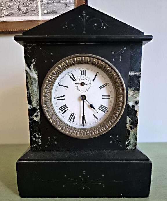 Black marble and sea green "perfected alarm" clock in the Antique style, with enamelled dial, surrounded by a frieze of bronze ovals and hearts. 25 x 18.5 x 10 cm. Late 19th century. Ref YY