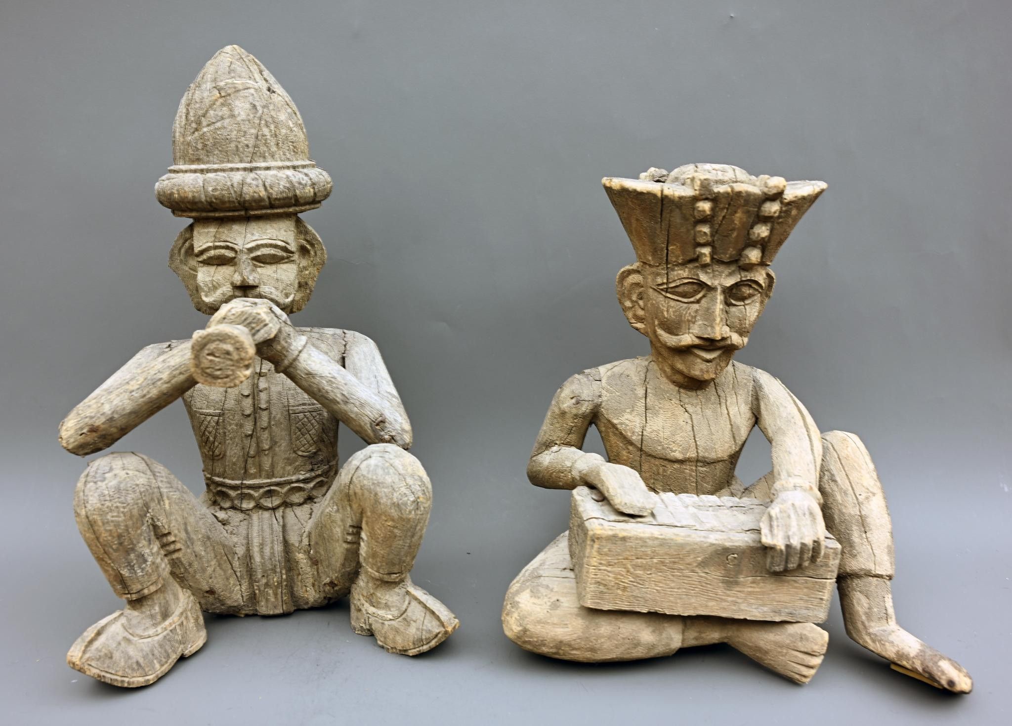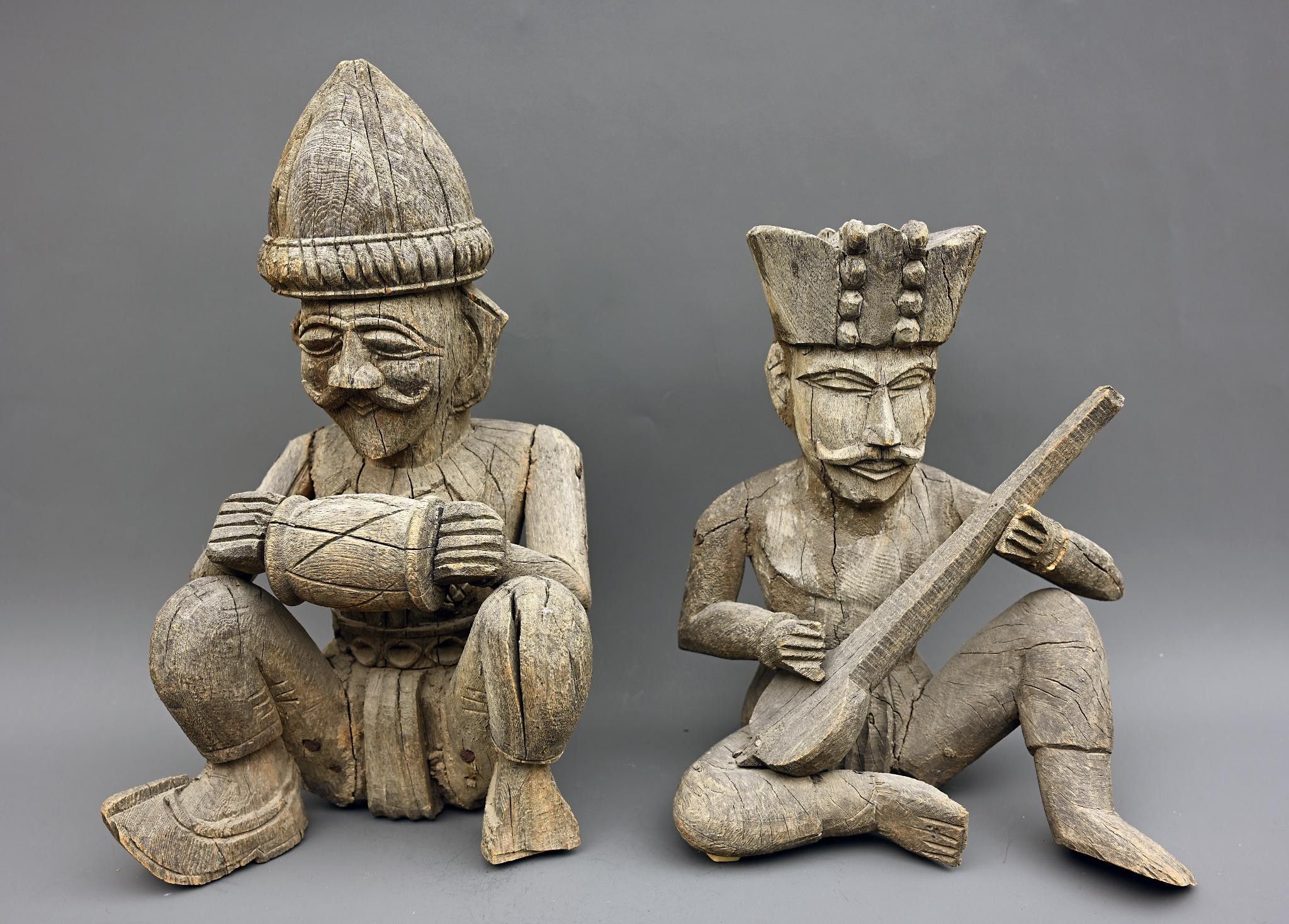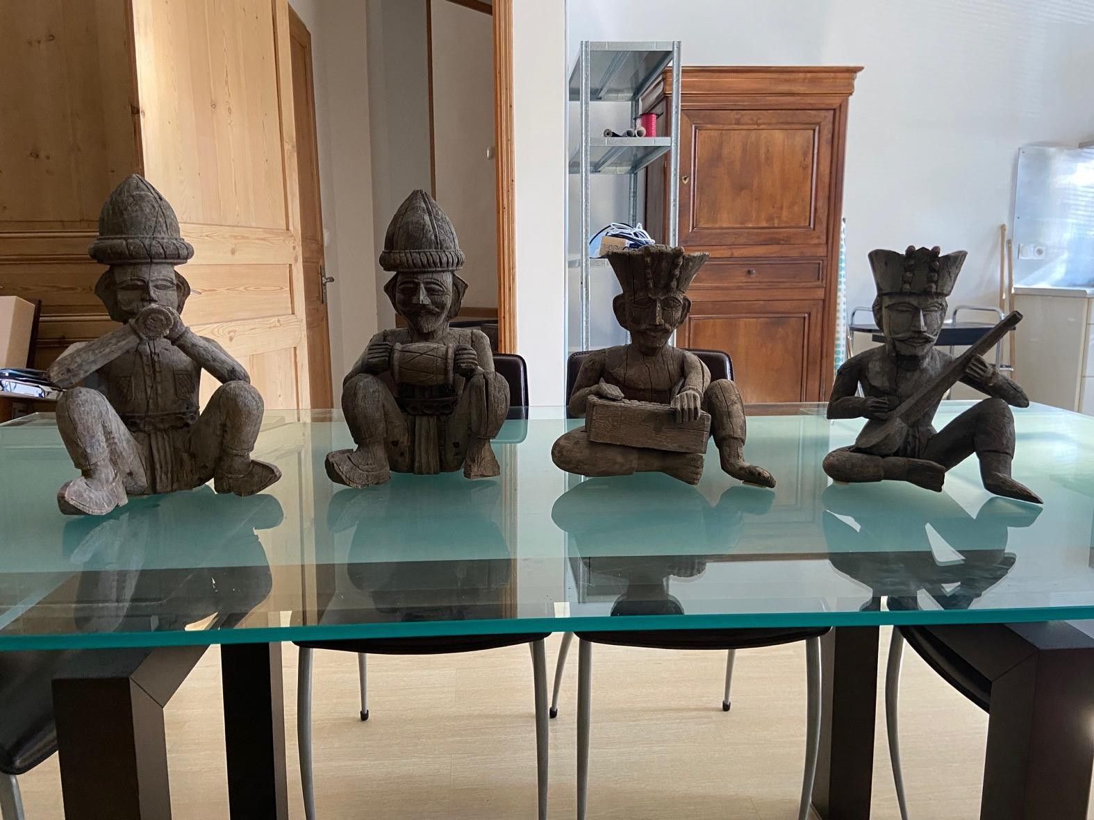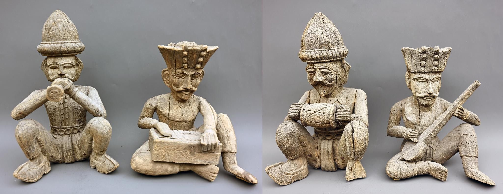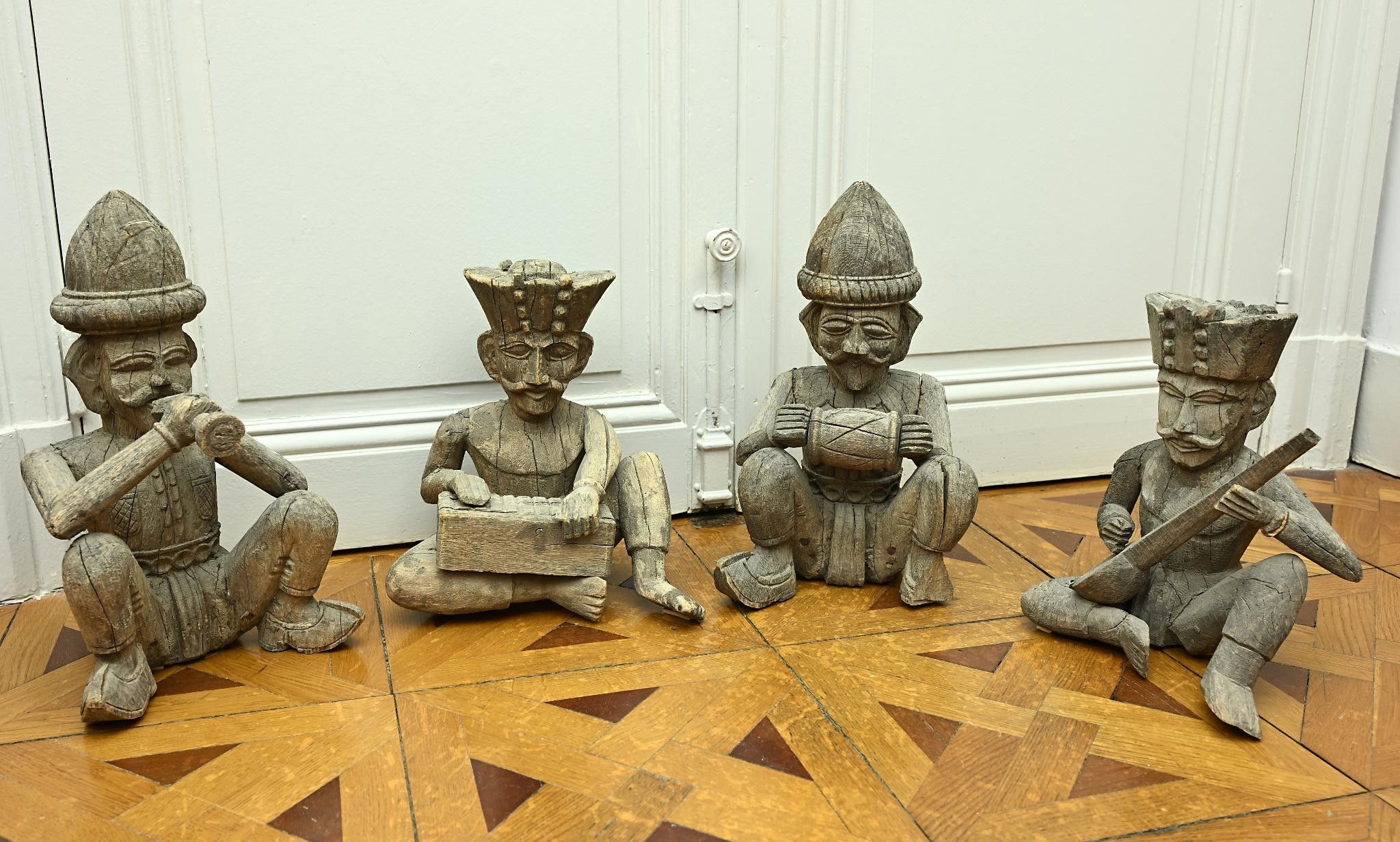 India Rajastan. Suite of four musicians in carved wood. Height from 29 to 38 cm.