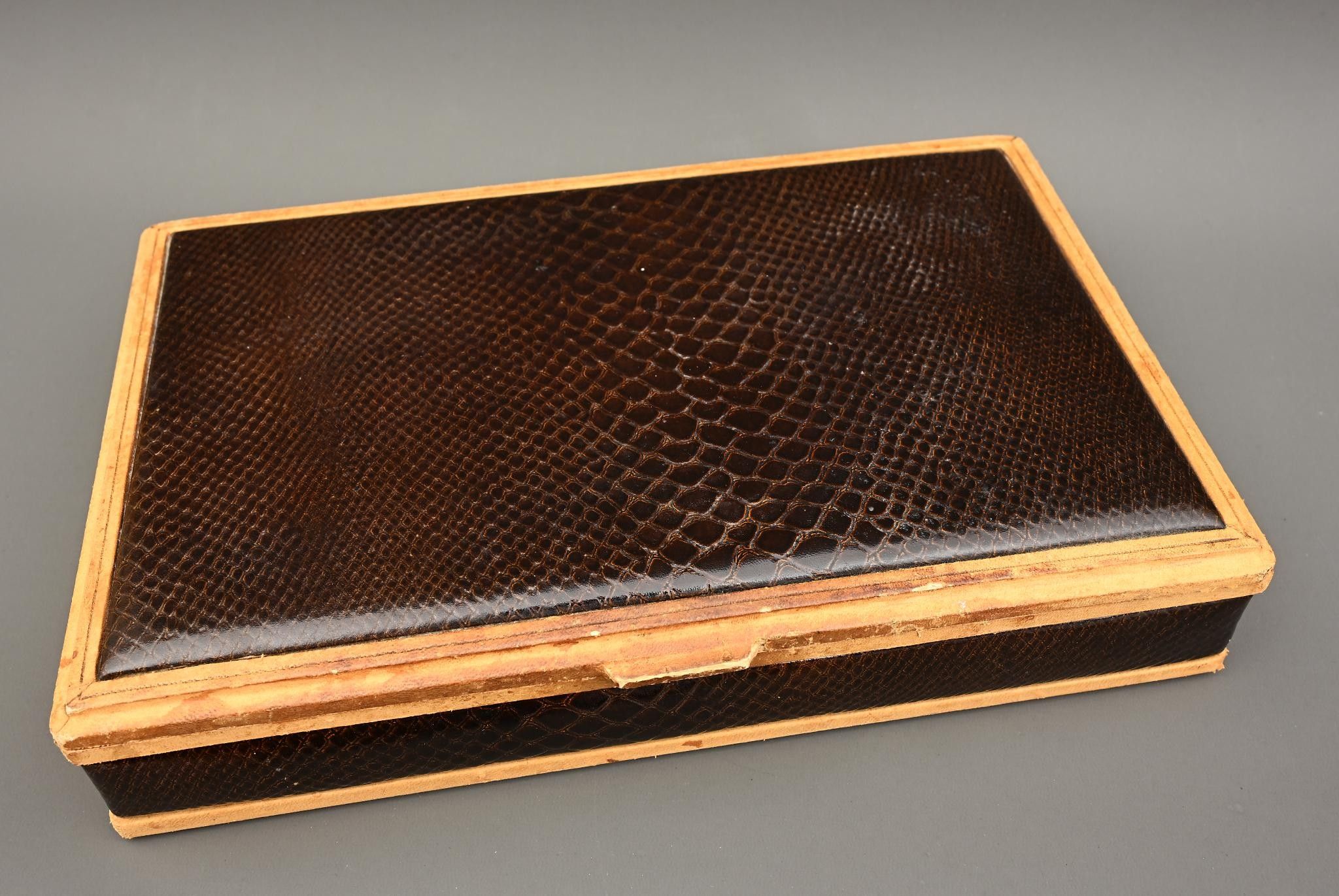 Jewellery box sheathed in buff suede and brown snakeskin.