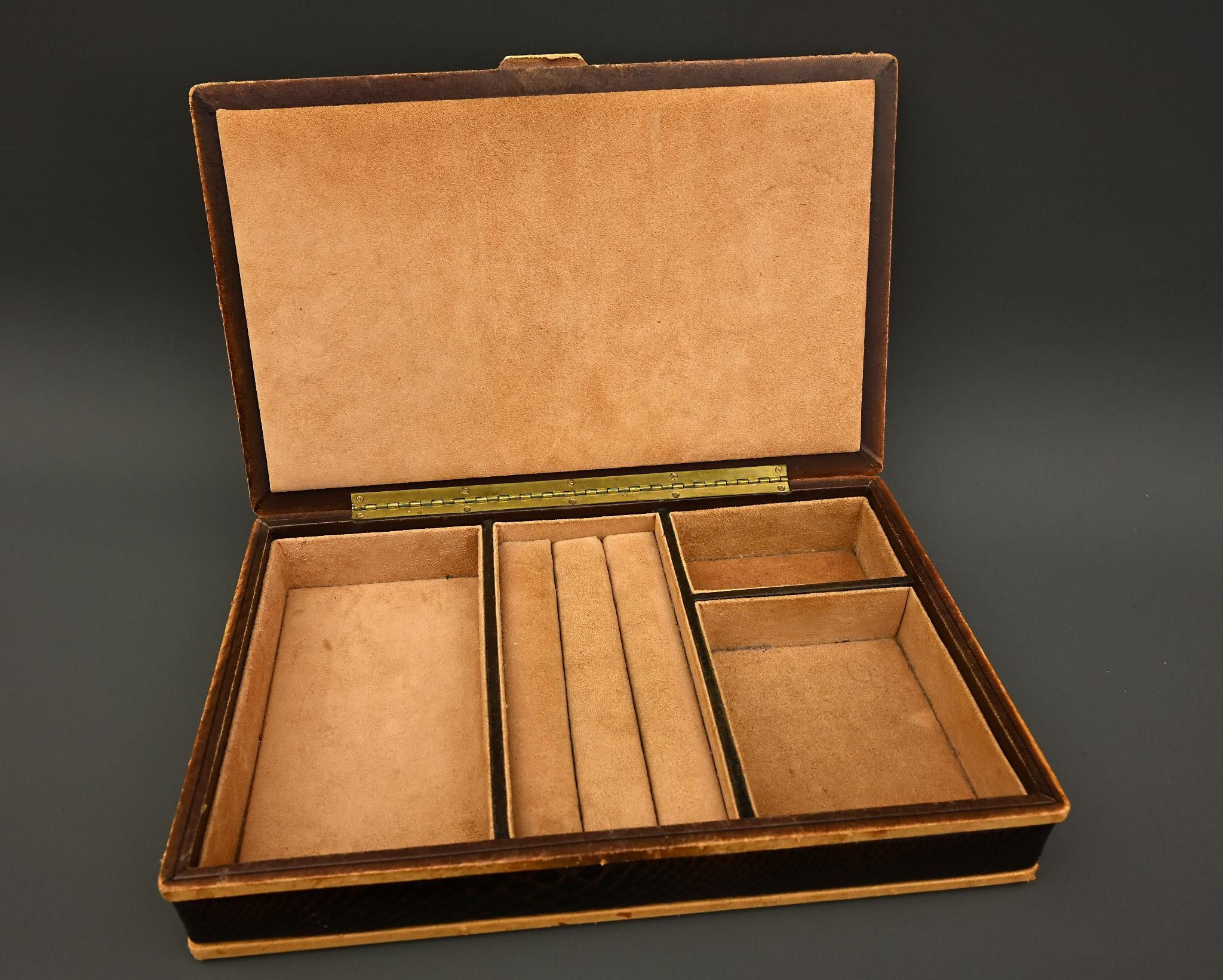 Jewellery box sheathed in buff suede and brown snakeskin. Dimensions 29 x 18 x 6 cm.