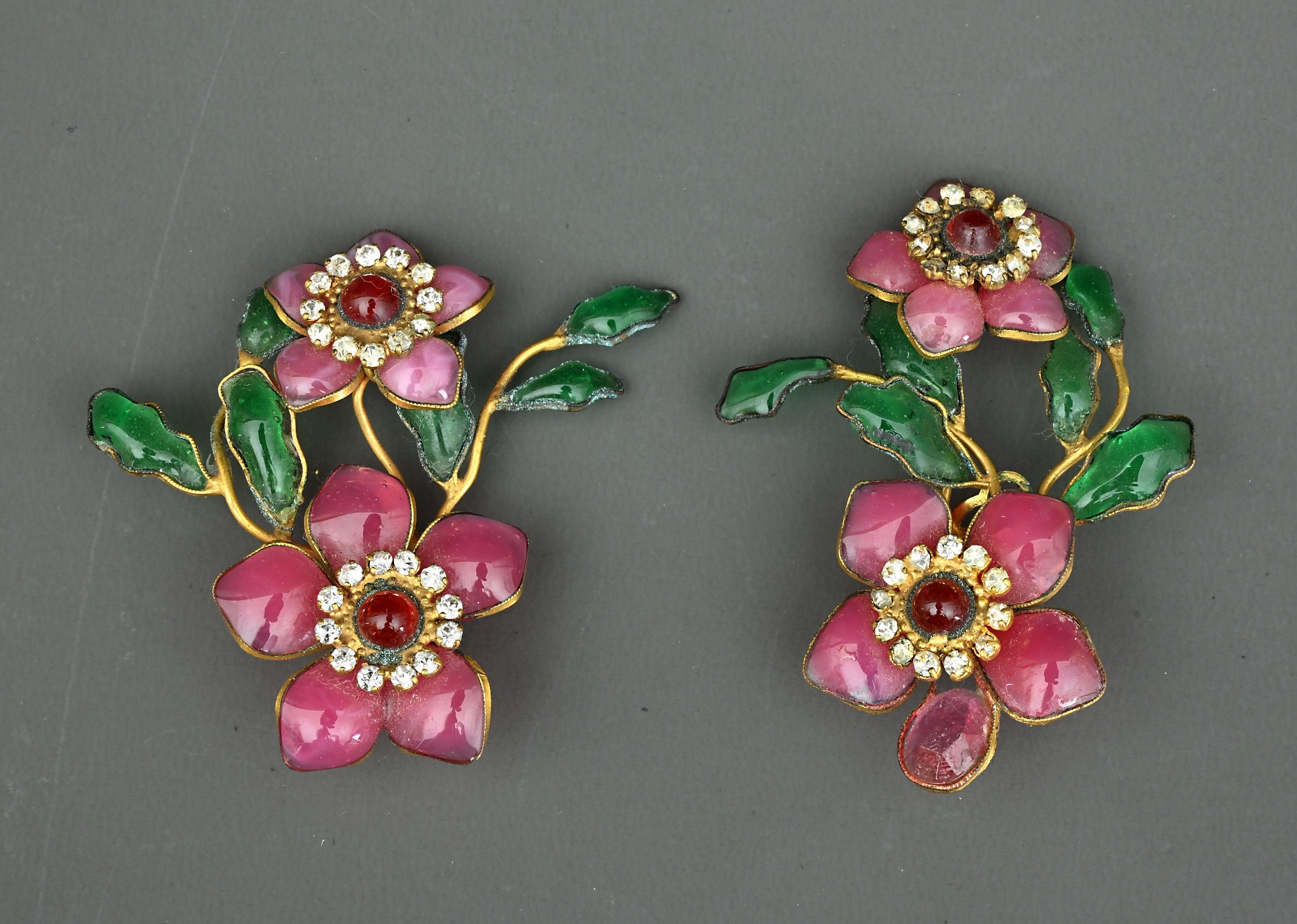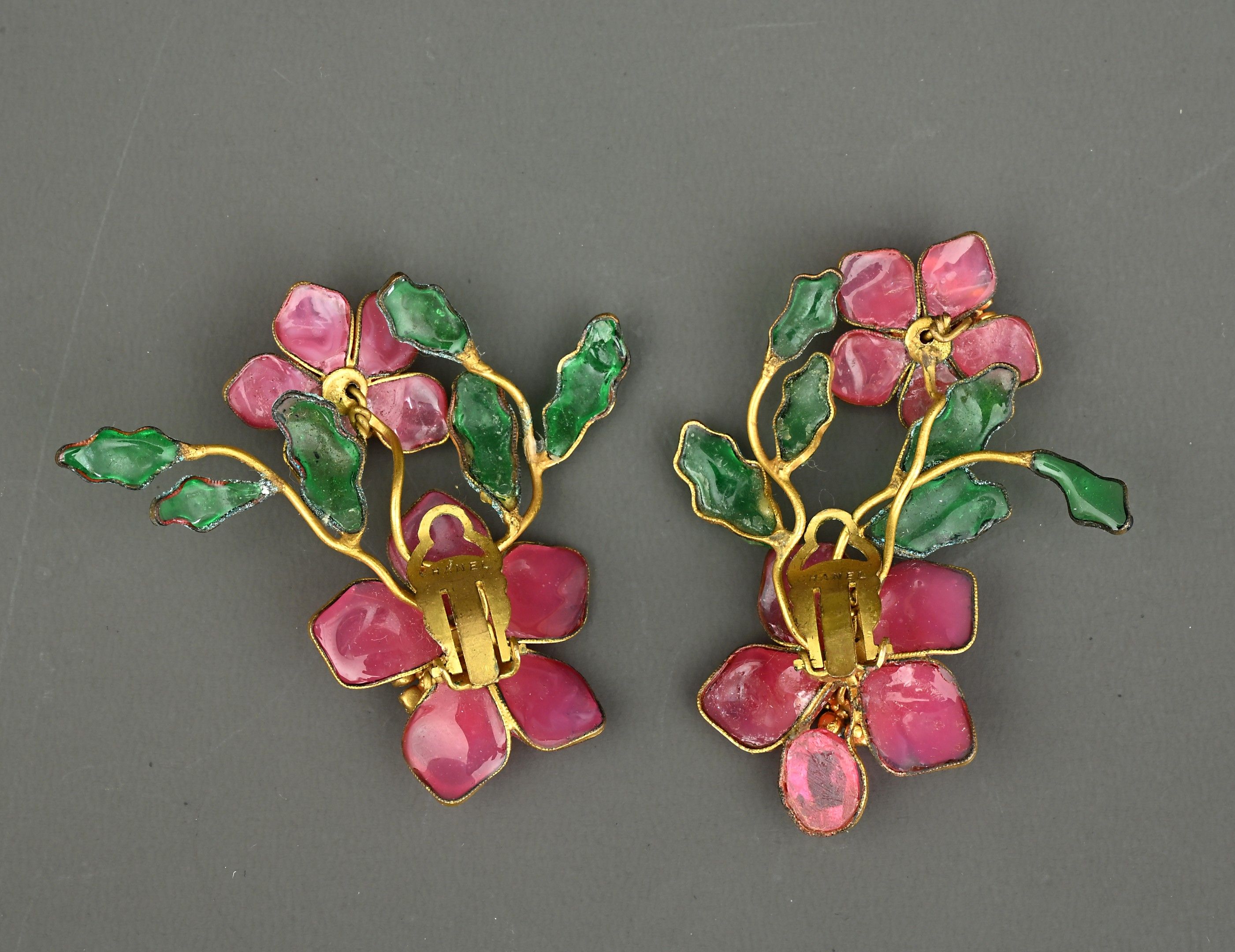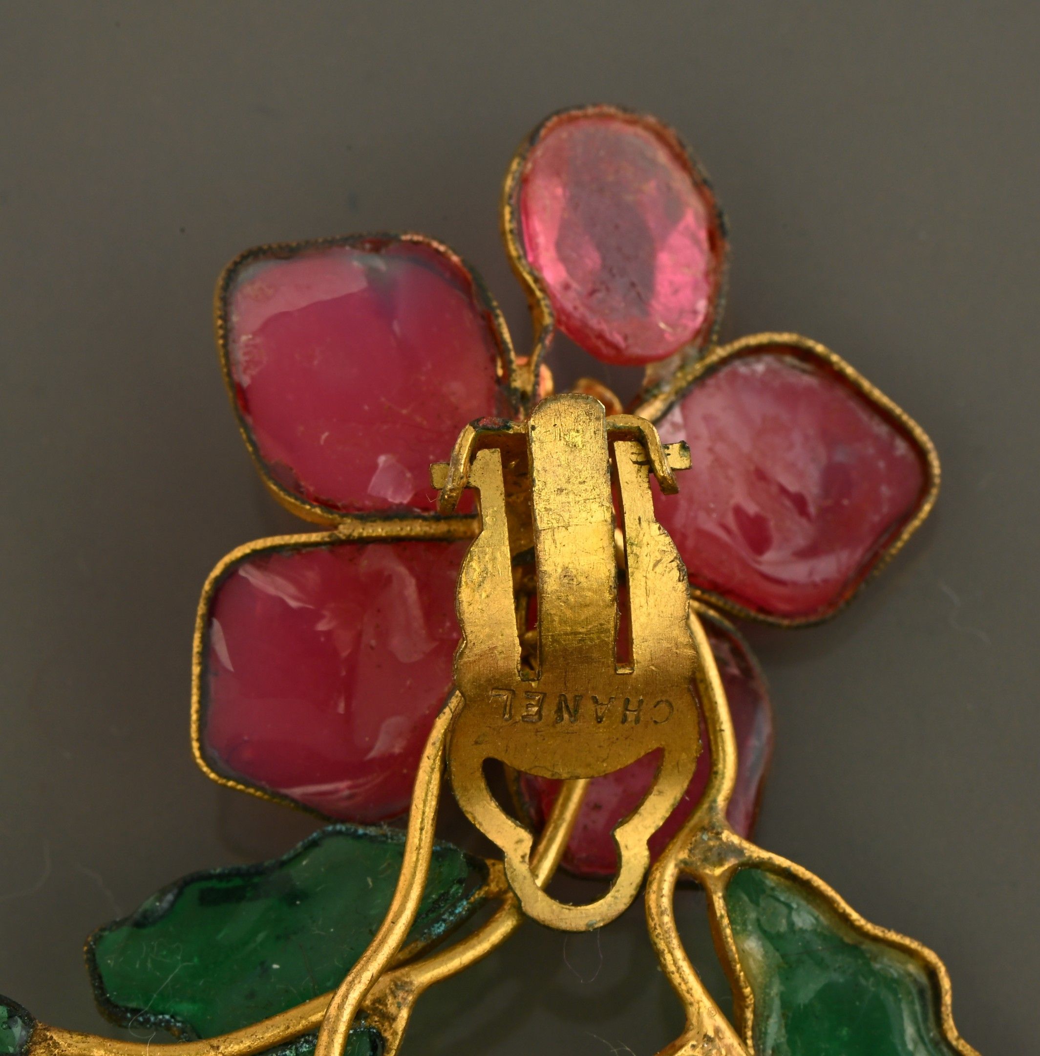 CHANEL - Pair of clip earrings with flower motifs in gilded metal and multicoloured glass paste. Signed Chanel on plate. Probably from the Atelier GRIPOIX. Good condition (one petal replaced by a stone) Height: 5.5 cm