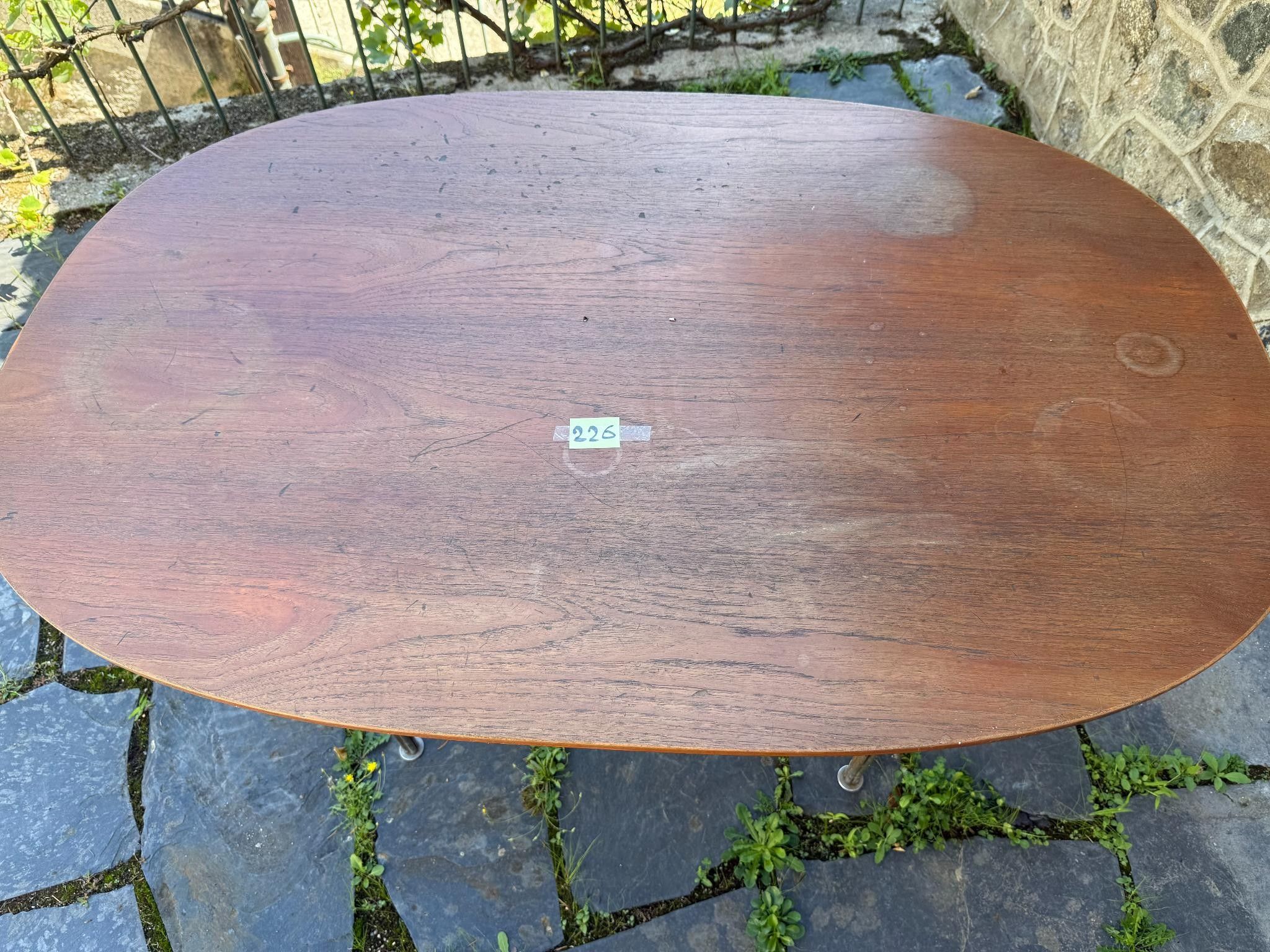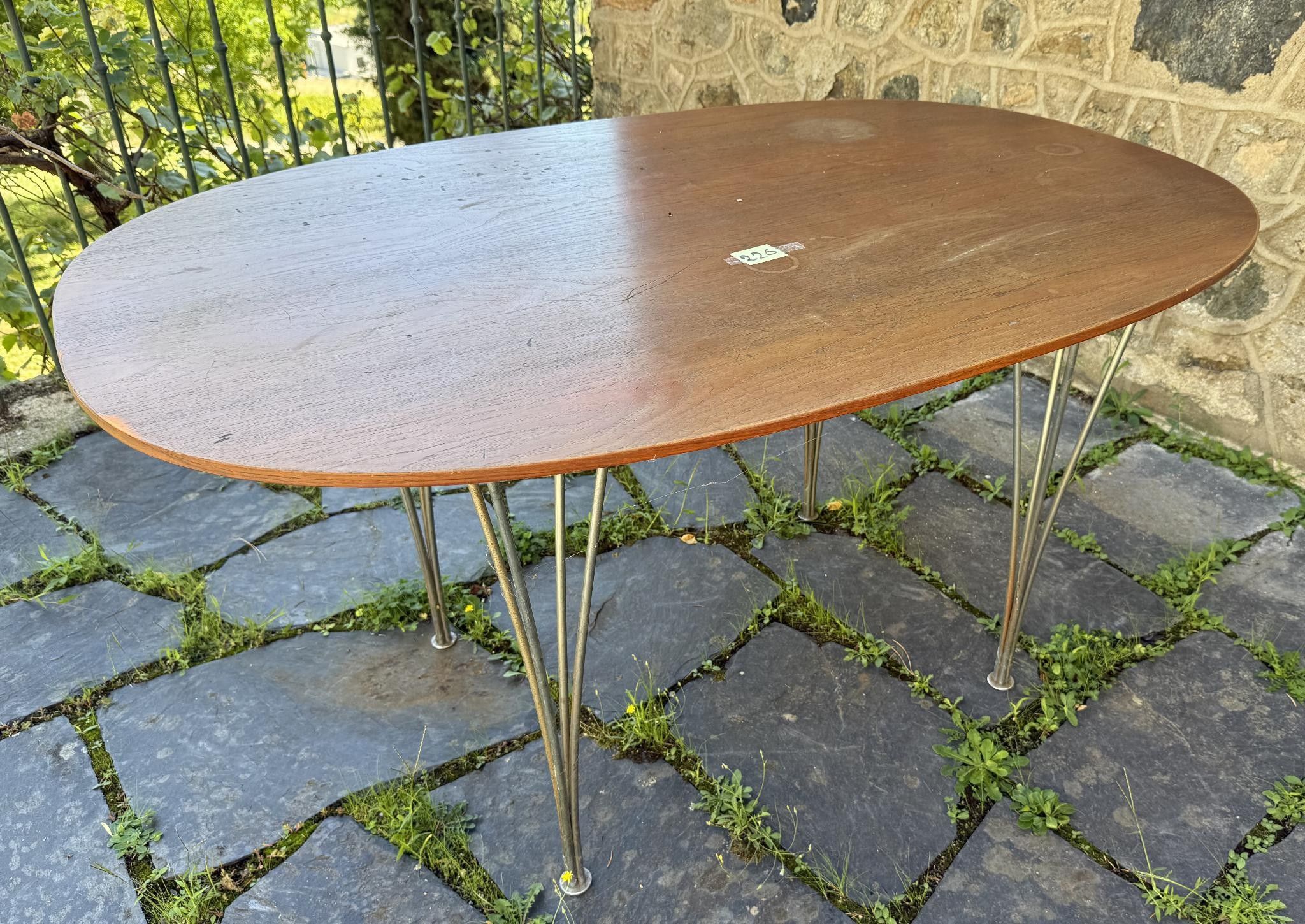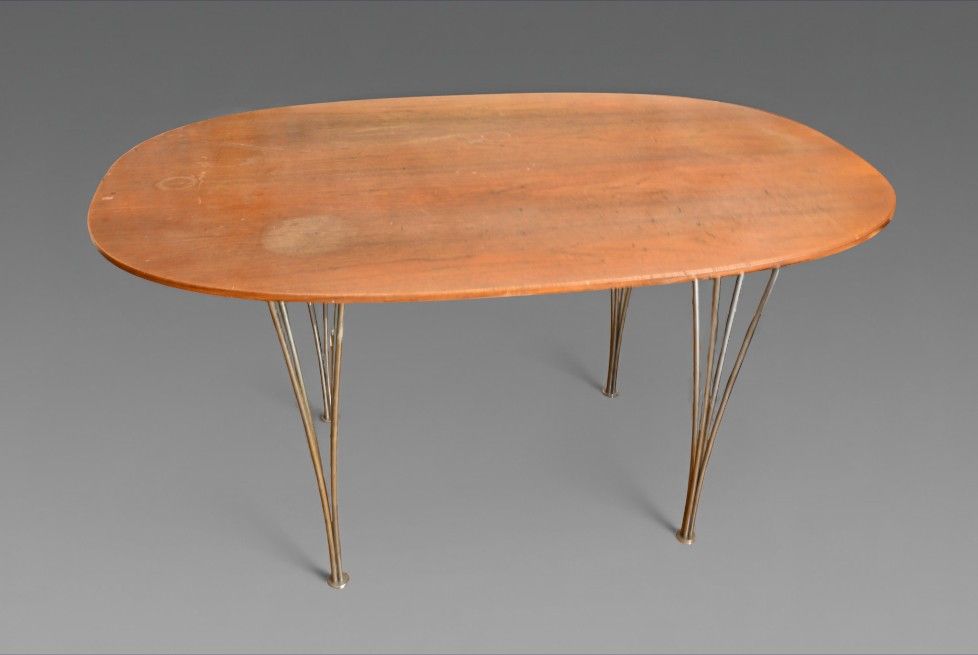 Piet HEIN, Editions Fritz Hansen. Elipse dining table. Oval wooden top resting on four chromed metal legs. Signed Fritz Hansen Denmark. Label. Dimensions 70 X 135 X 90 cm. Scratches, traces of glass.