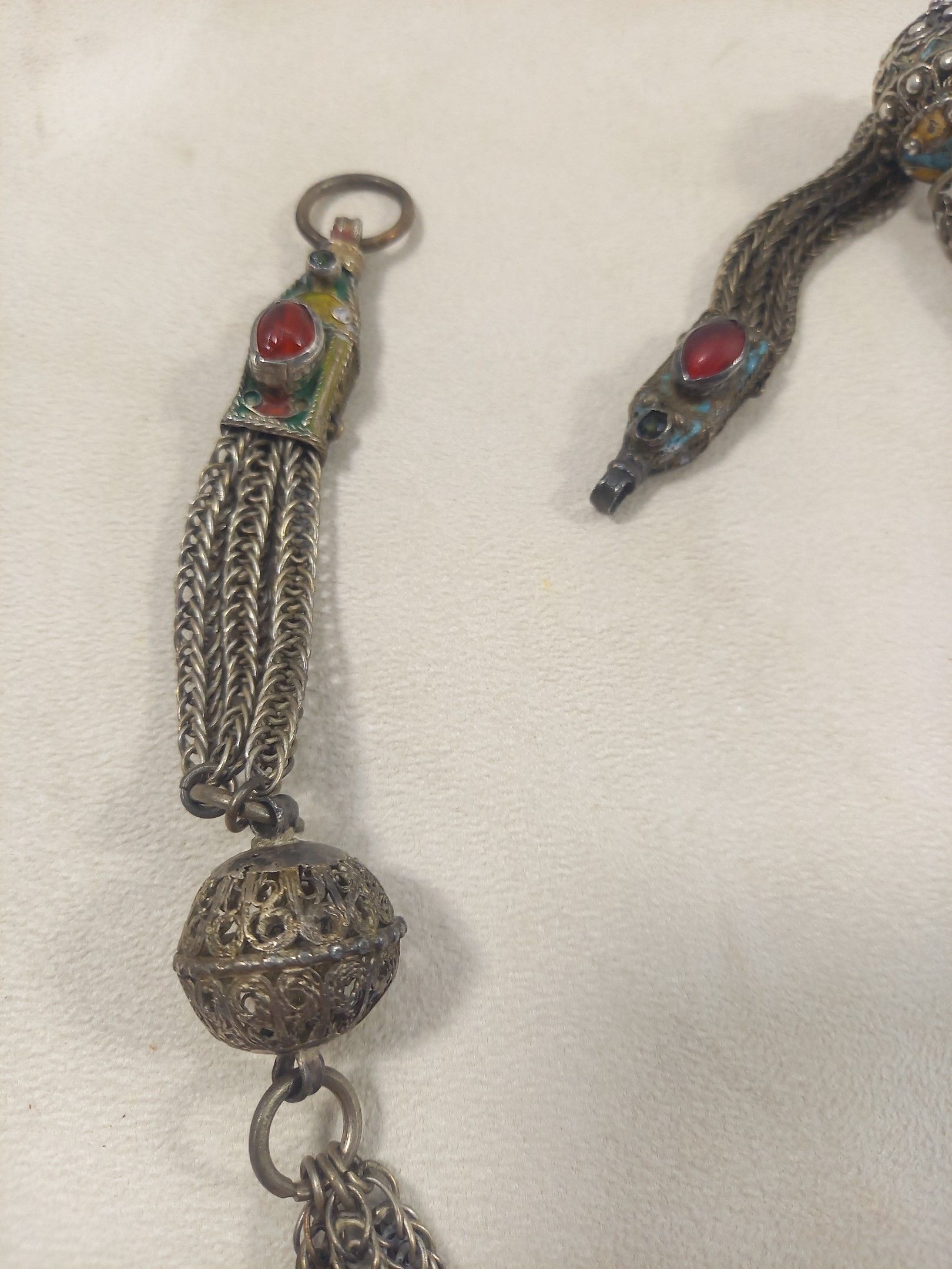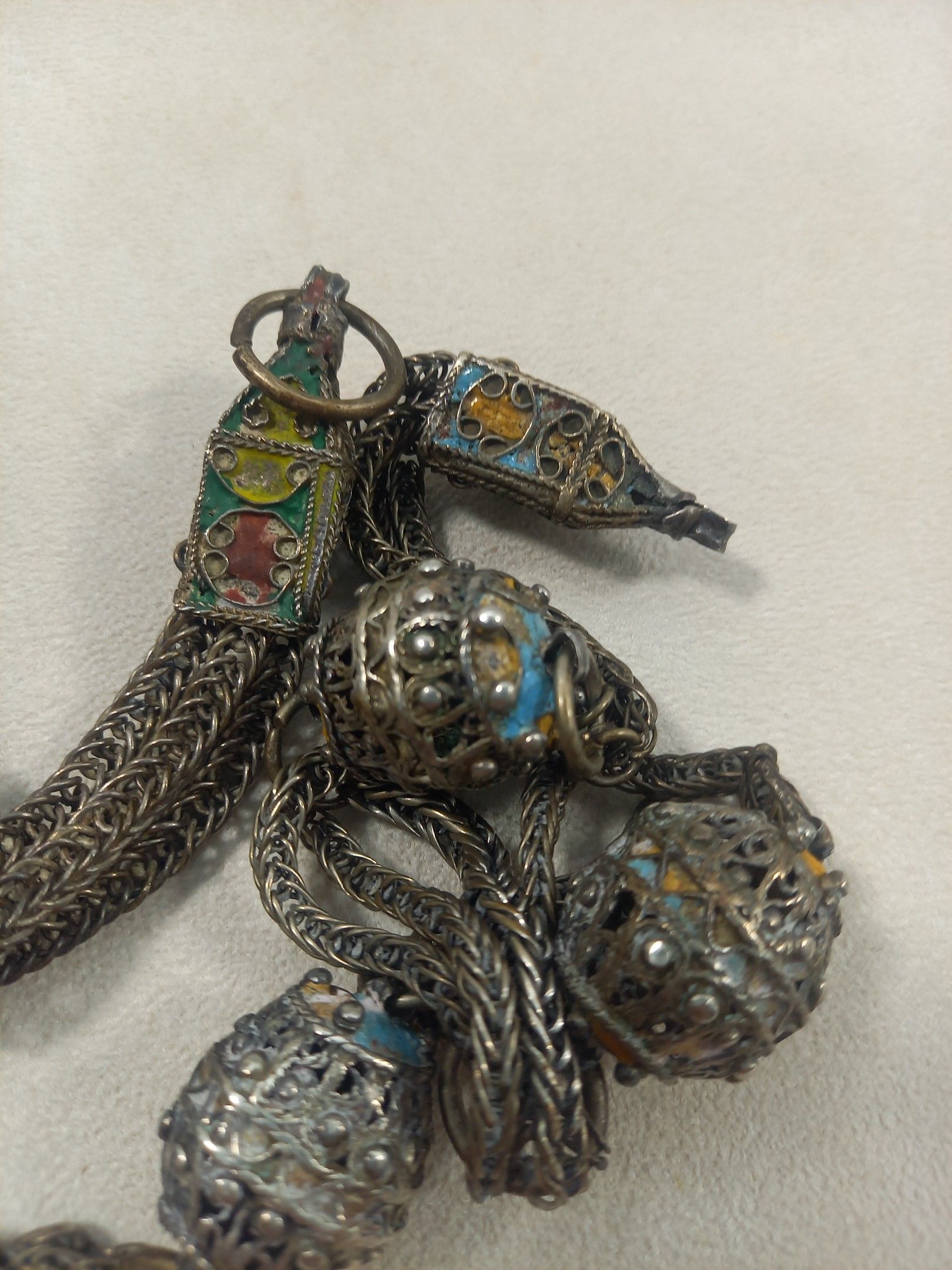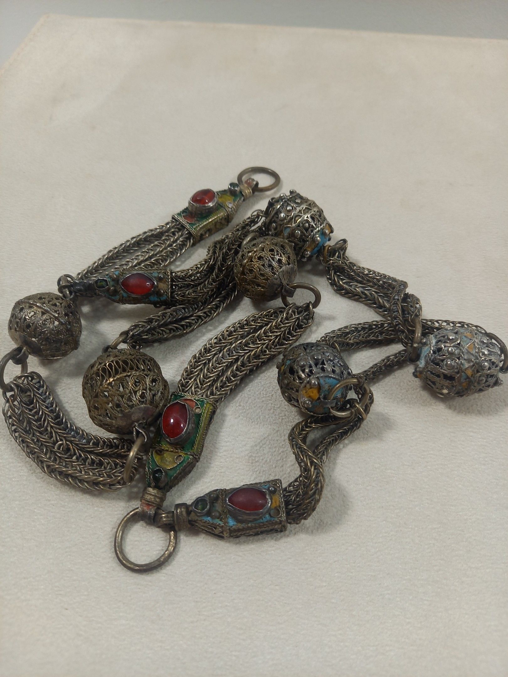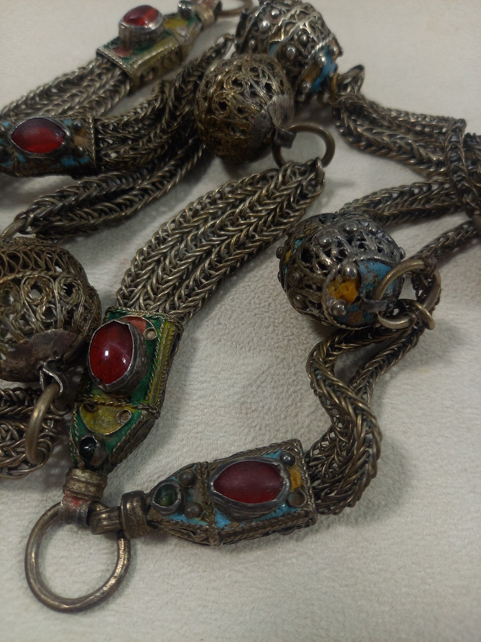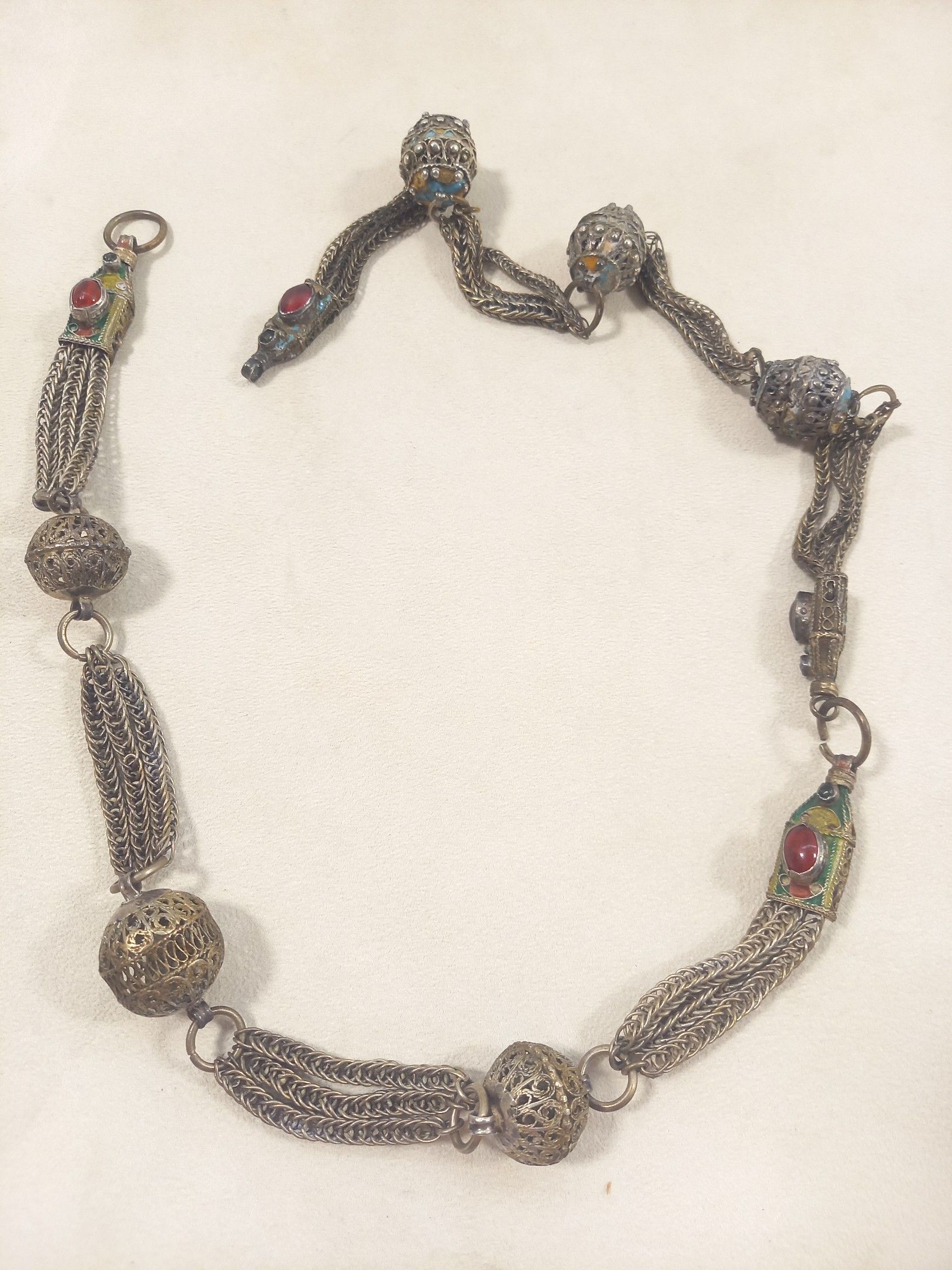 Foreign work, Morocco, Asia? Belt or necklace probably in poor silver and metal, decorated with pearls enhanced with polychrome enamel. Length: 92 cm, weight 167.80 gr. As is.