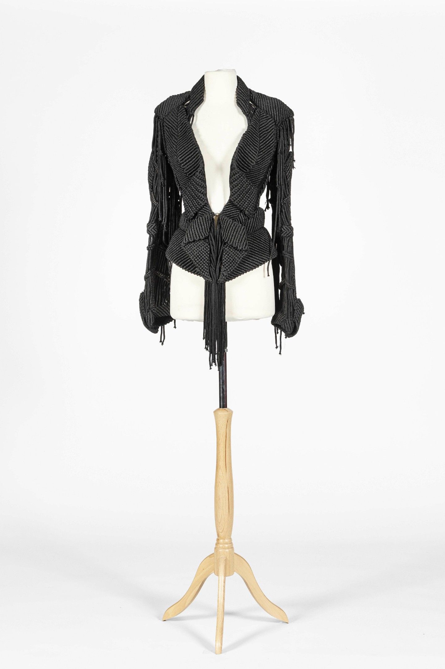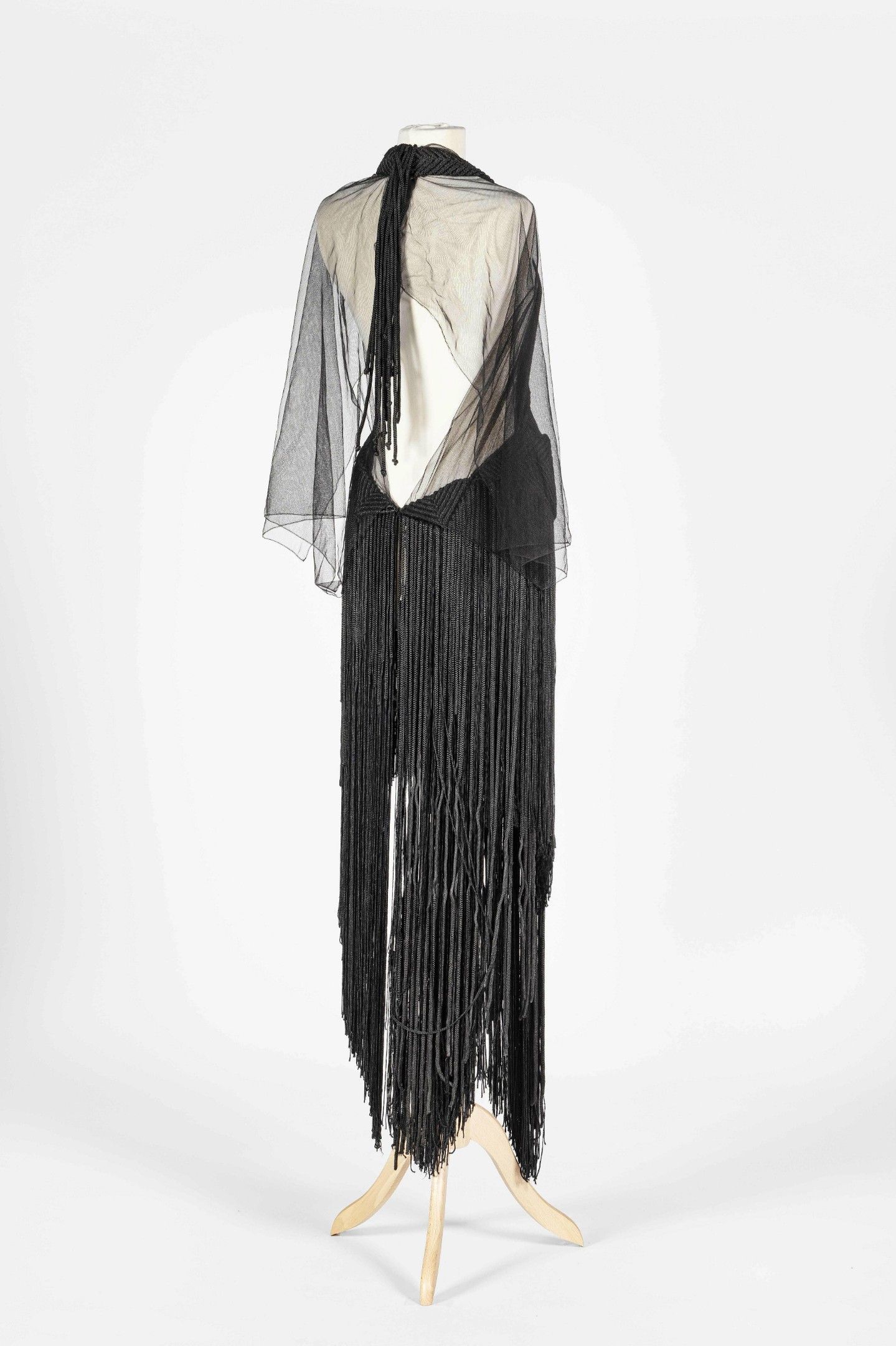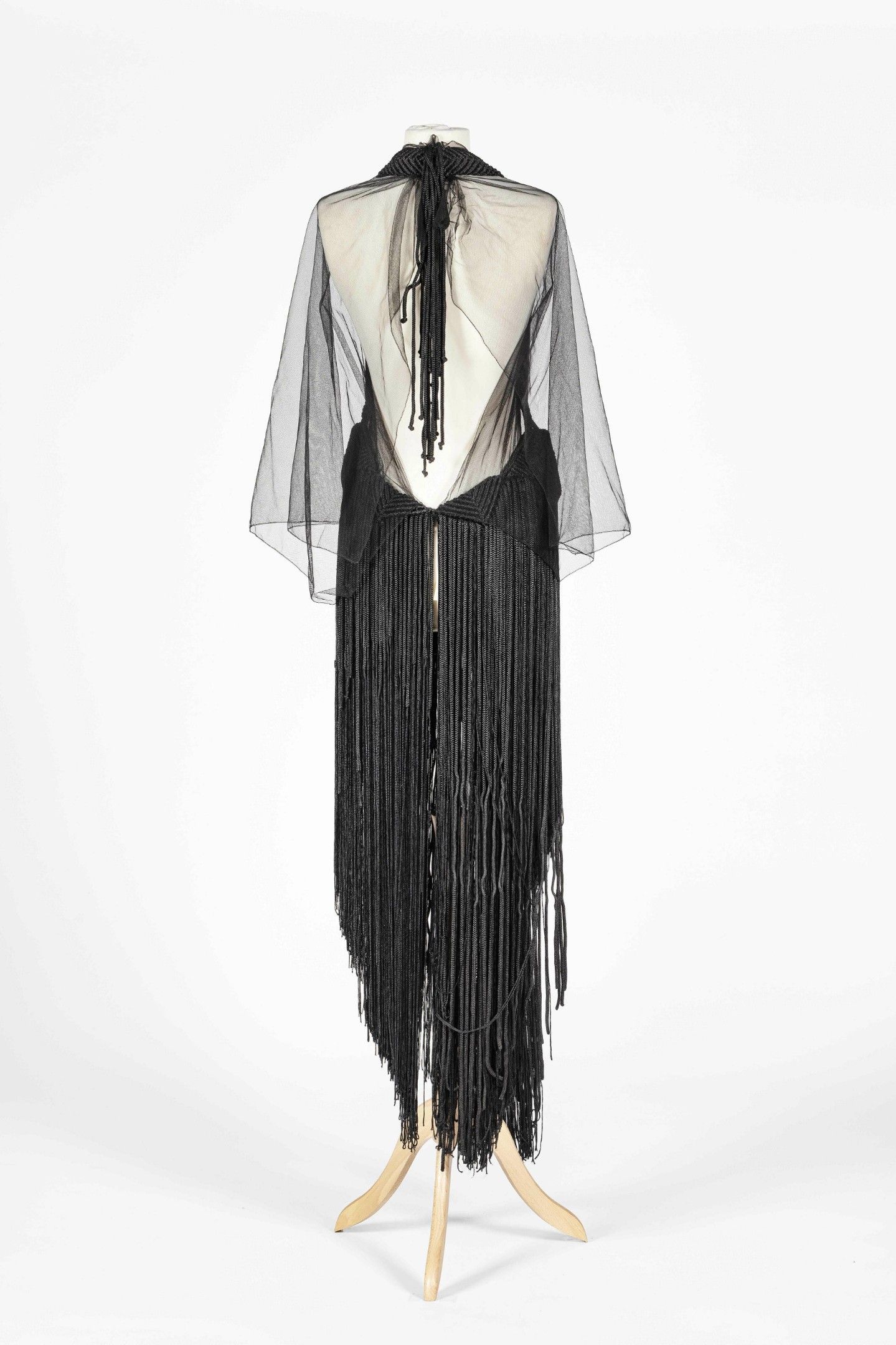 A sleeveless black cotton and fishnet evening dress with wide V-neck, mesh-style embroidered bib, long fringes of passementerie at the bottom, hook fastening at the back. No bottom. Size XS / S Good condition.