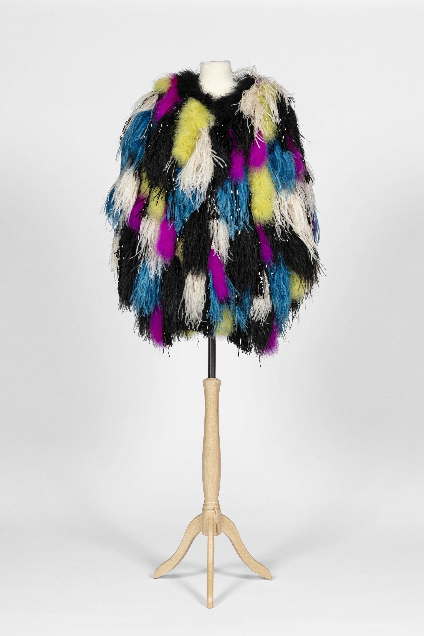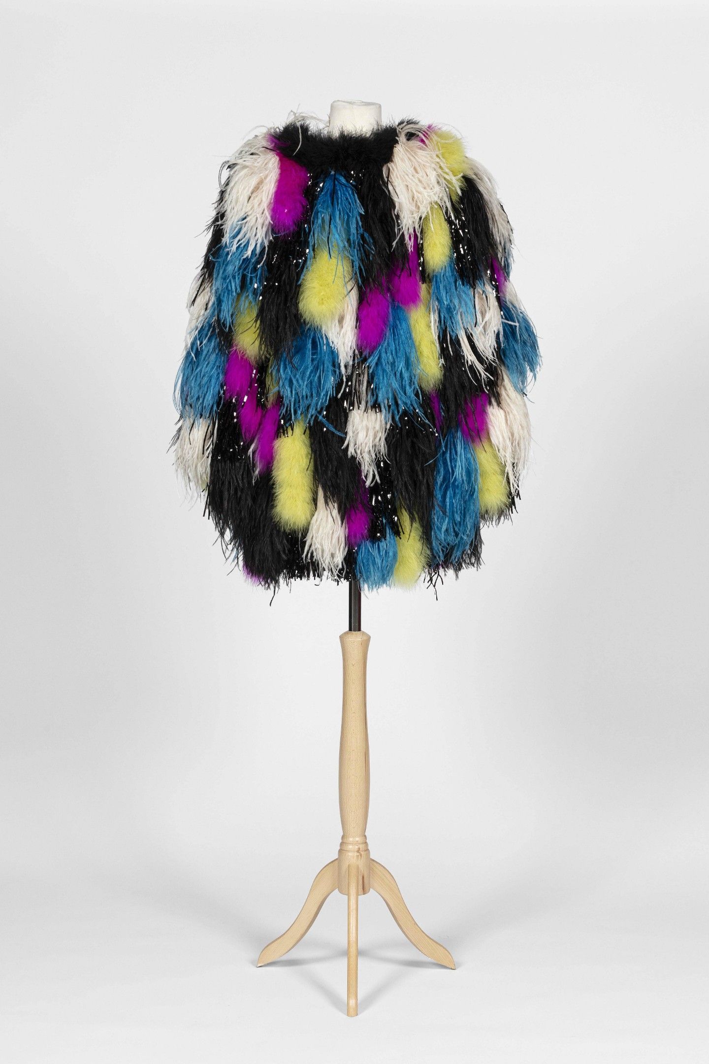 Long black organza jacket embellished with multicoloured ostrich feathers and black PVC fringes, long sleeves, round neck, five hook front fastening. Size S / M Good condition.