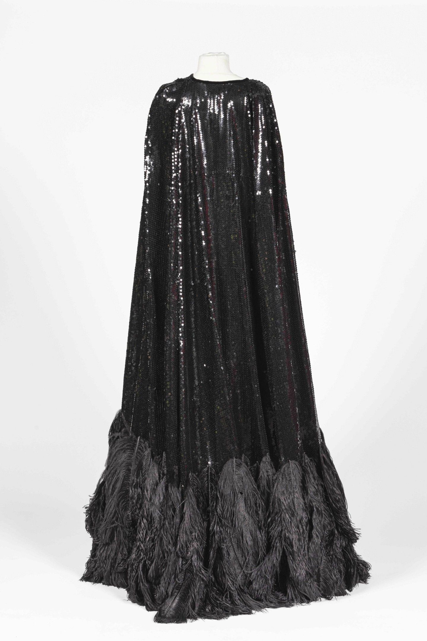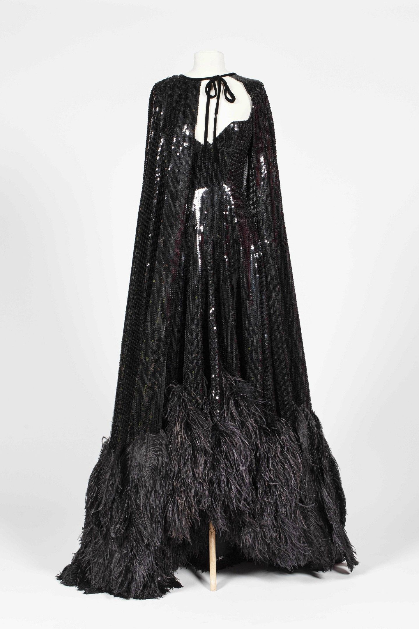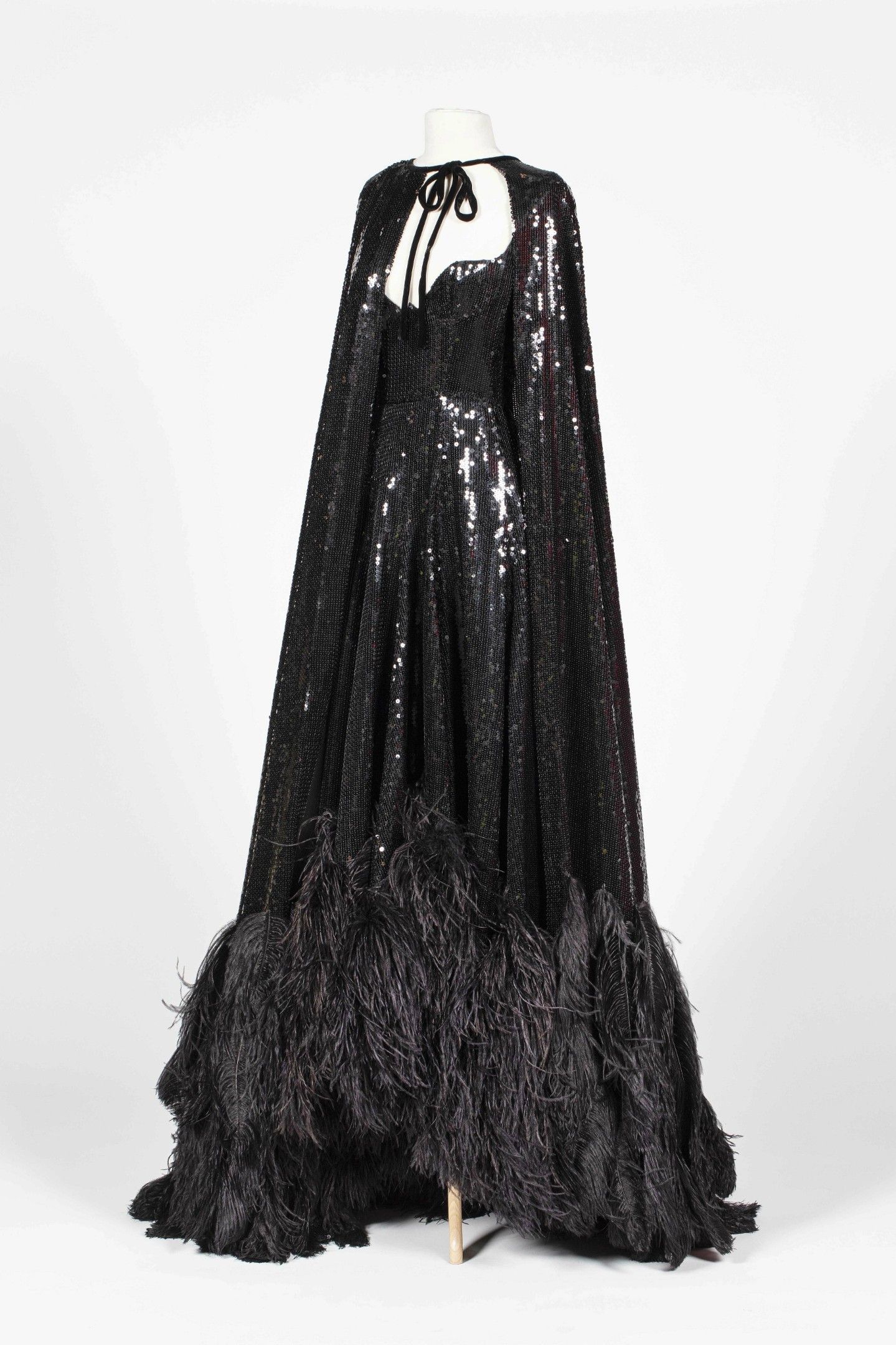 A long sleeveless dress, entirely covered in black sequins, ruffled bottom with black ostrich feathers, fitted at the waist, large zip fastening at the back. Size S, used condition