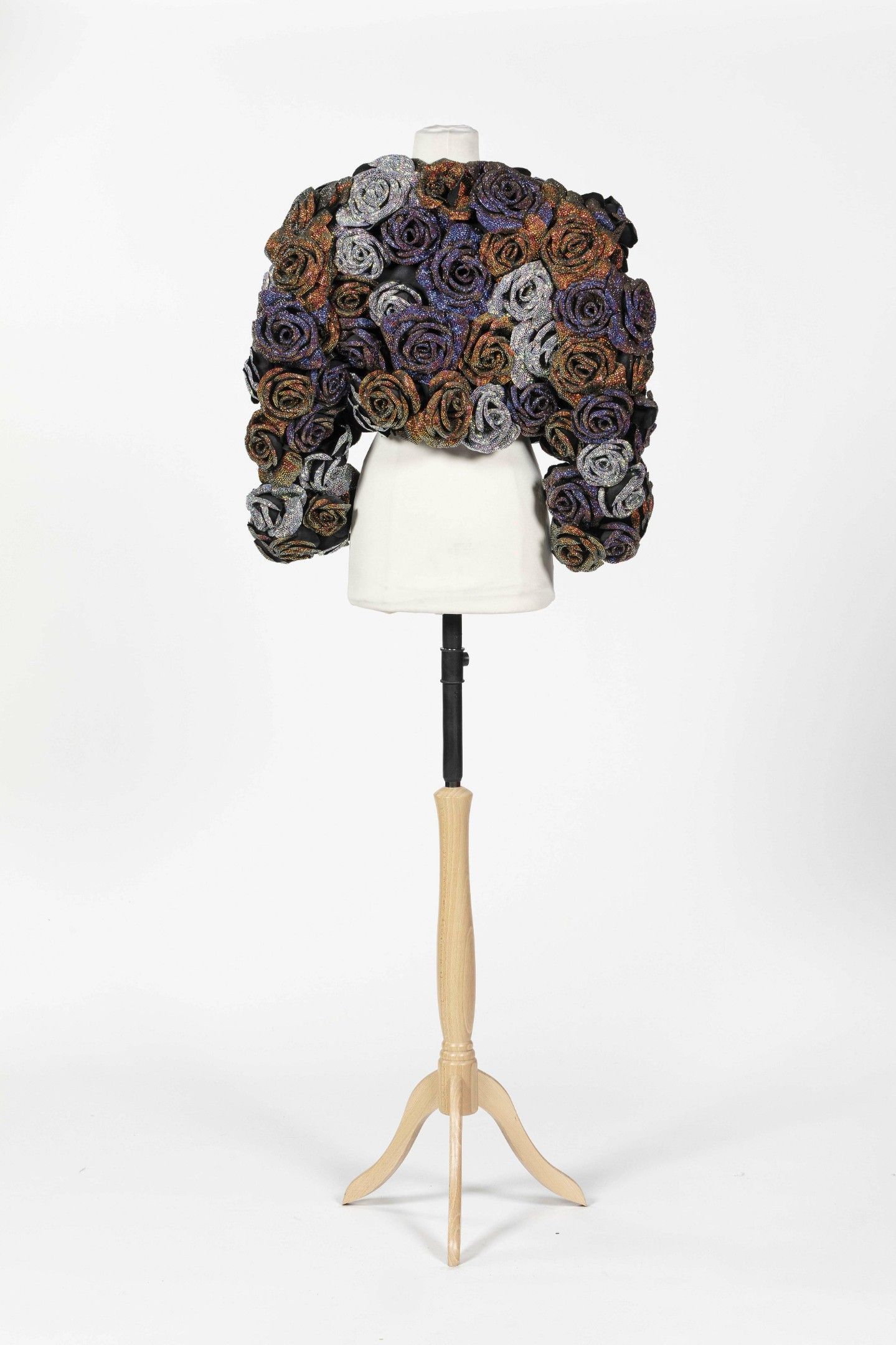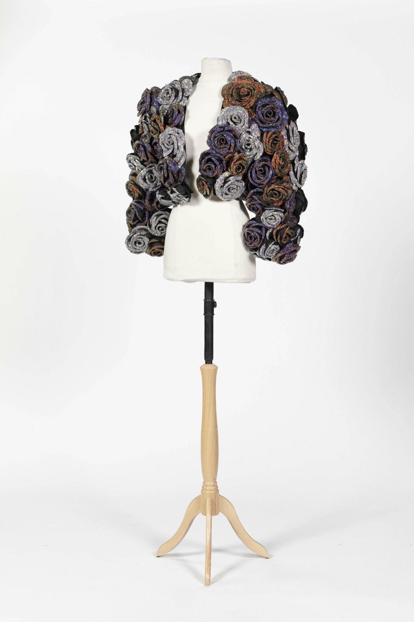 Spectacular bolero jacket in black satin embellished with embossed roses embellished with Swarovski rhinestone crystals in multicoloured tones, ¾ sleeves, round neck, no fastening. Size S Good condition
