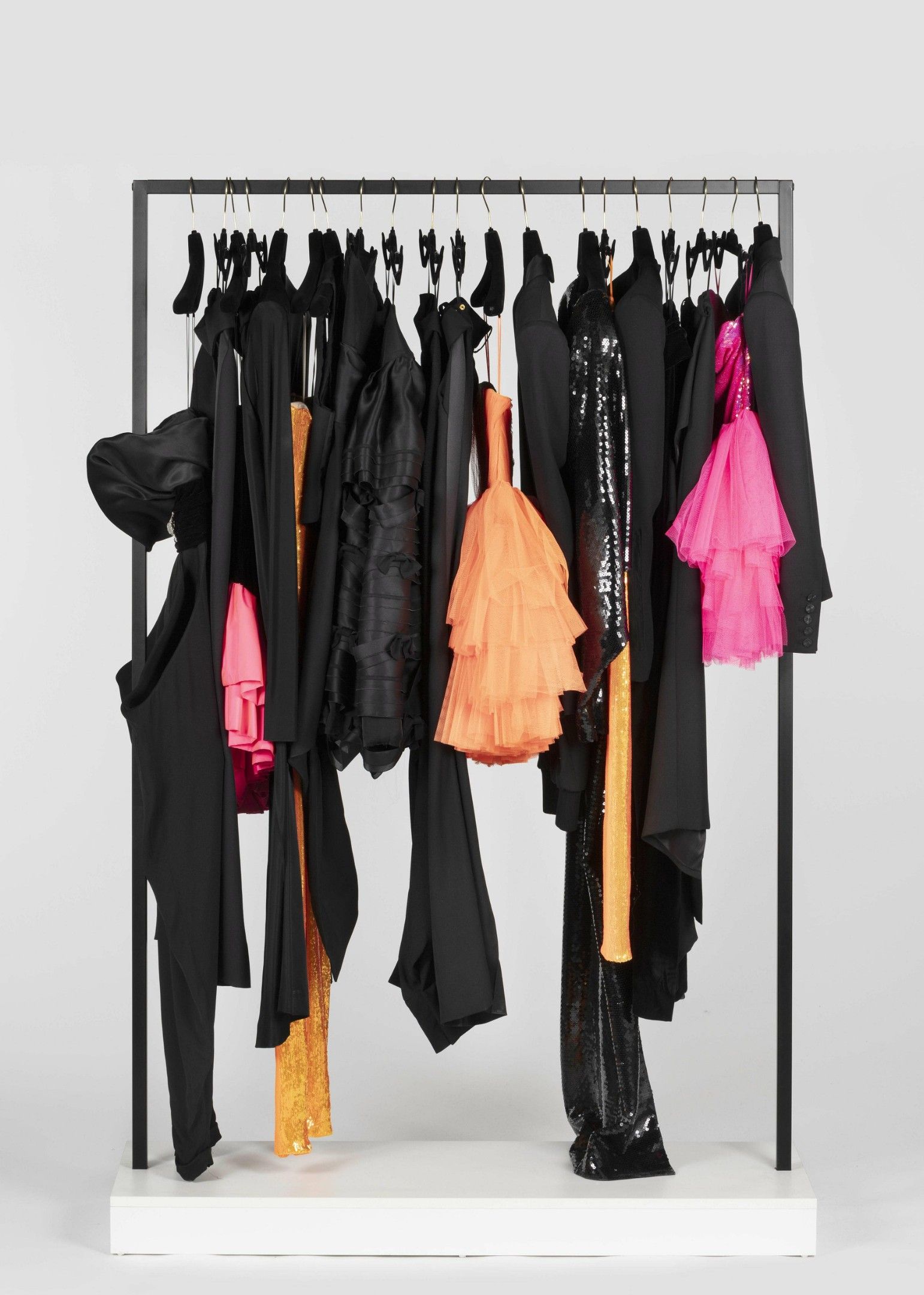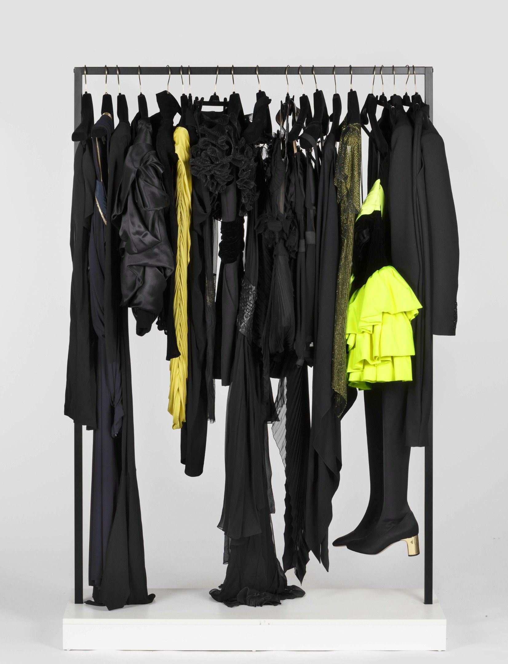 Wardrobe of 40 pieces including dresses, jackets, trousers and tops in shades of black, yellow, orange and flash pink for the 3 colours, made of precious materials (silk, crepe, velvet, satin, tulle, sequins, Swarovski rhinestones etc ) Size S and XS for the 40 pieces Good condition. See photos.