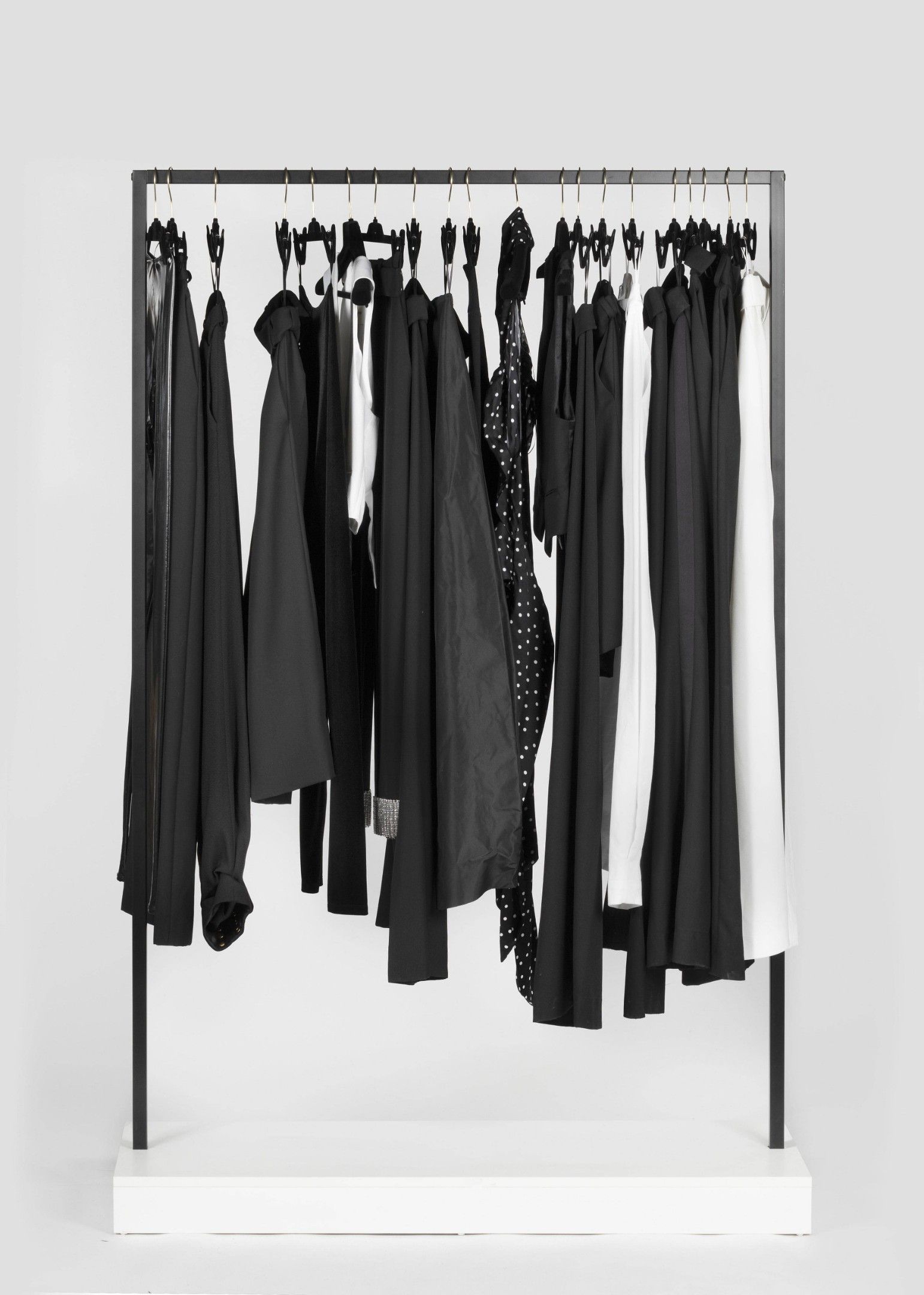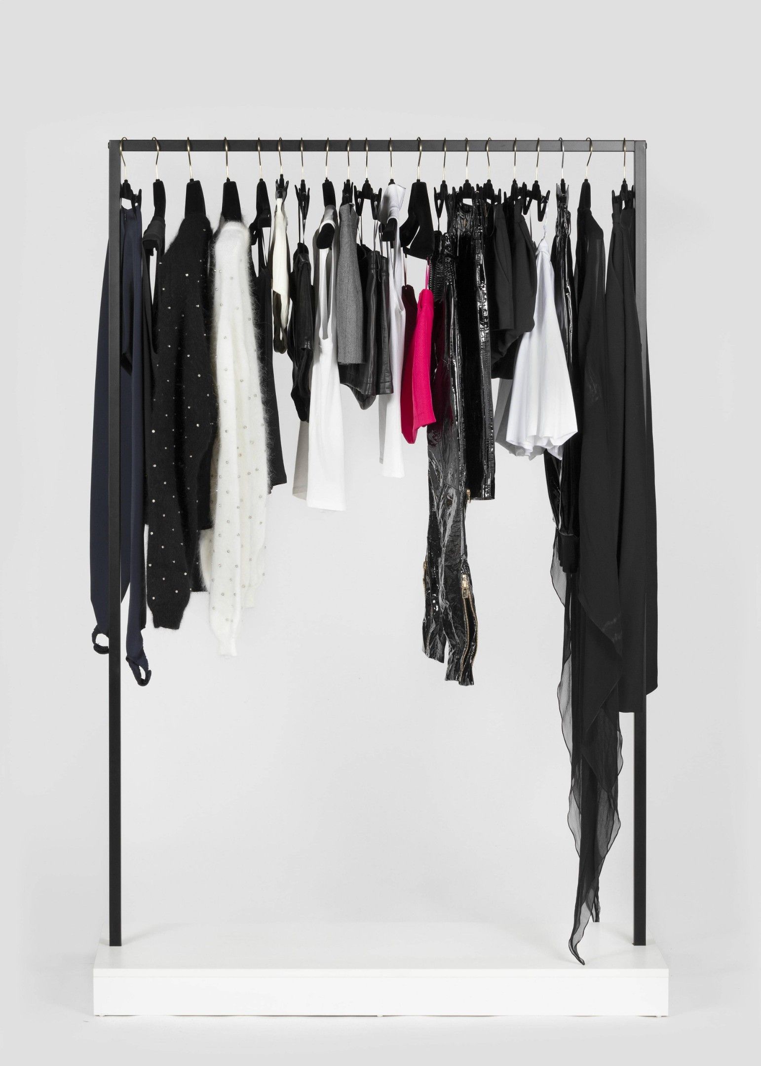 Wardrobe of 40 pieces including trousers, mini skirts, shorts, jumpers and tops in shades of black, white and pink made of precious materials (silk, crepe, velvet, satin, Swarovski crystals etc ) Size S and XS for the 40 pieces Good condition. See photos.
