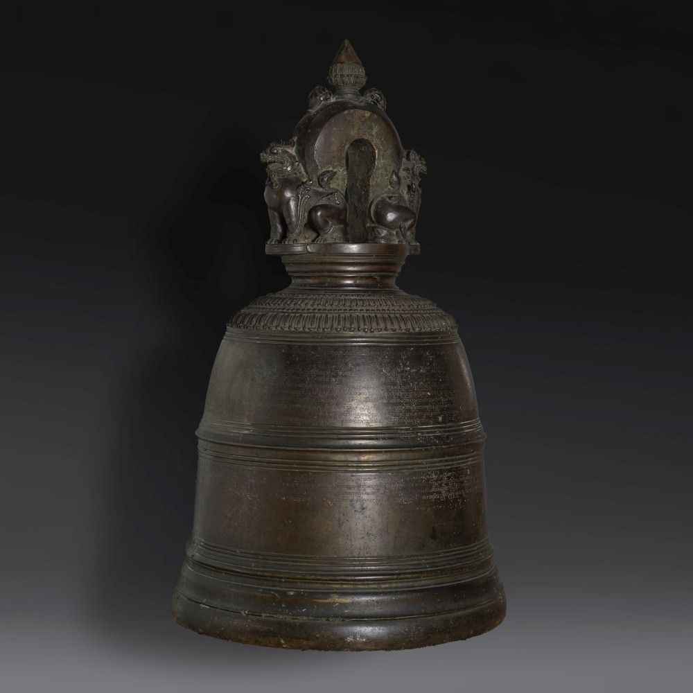 The body of the bell is encircled by multiple lines of the incised inscription, interspersed with moulded rings and culminating on the shoulder with two rows of lotus-petals. Two crouching guardian lions (simbas) form the structural supports of the suspension loop. The loop itself is surmounted by an exquisitely detailed lotus bud emerging from foliage, an emblem of the Buddha's purity and enlightenment. The suspension bracket takes the form of addorsed rearing mythical creatures (makara), rendered in high relief. It does not incorporate a clapper because it would have been struck on the outside with a striker.