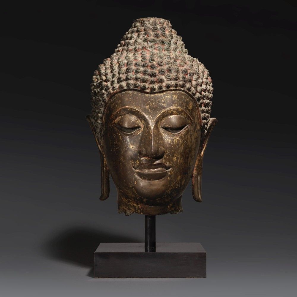 20. A COPPER ALLOY HEAD OF BUDDHA Thailand, Ayutthaya, 15th–16th century 33 cm (13 in.) high This head of the Buddha originally belonged to a large standing or seated image and was separately cast and later attached. The almond-shaped eyes are gently lowered beneath finely arched brows that merge seamlessly into the long, pointed nose. A faint smile softens the full, outlined lips, and the defined chin combines softness and strength. The elongated, pierced earlobes indicate his princely origins, while the hair, arranged in neat rows of snail-shell curls, rises to form the usnisha, once topped by a separately cast flame finial. These attributes allude to the Buddha's renunciation of worldly life and attainment of spiritual perfection. Traces of red lacquer and gilding remain on the surface, hinting at the sculpture's original splendour. Religious texts prescribed strict definitions as to how the Buddha should be depicted, and these rules were firmly adhered to. At the same time, artists maintained a fluidity of line. For a discussion of this, see A. B. Griswold, Dated Buddha Images of Northern Siam, Switzerland, 1959, pp. 22–23, where Griswold describes the gilded surface of such images as "a vision of fiery energy." For comparison, see an early-Ayutthaya Buddha head in the Metropolitan Museum of Art, New York (acc. no. 2019.570.12). Provenance Ancart Ph., Brussels, 1987. Private Collection, Belgium, acquired from the above (recorded in a 1987 insurance document); Thence by descent. 泰國 大城時期 十五至十六世紀 銅佛首  來源 Ancart Ph.,布魯塞爾,1987 年 比利時私人收藏,購於上者 (記錄於1987年保險文件) 後由家族傳承