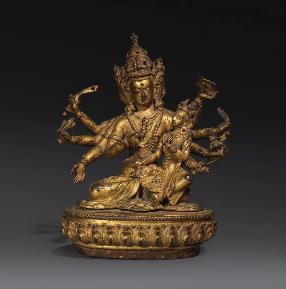 Comparable examples include a three-headed, eight-armed Manjushri with Shakti (HAR 30139) from Walter Arader Asian Art, and a Vajradhatu Vagishvara Manjushri with consort (Koller Auctions, 6 May 2014, lot 139) from the same period. Both share the same stylistic vocabulary seen here including the lush modelling of the lotus base with the beaded top rims, the fine articulation of ornamentation and facial features, as well as the naturalism of both figures' robes that cascade fluidly, pooling at the ankles in neat pleats.