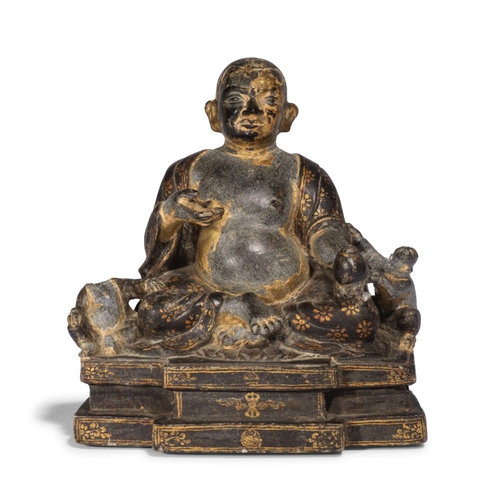 Hvashang holds a persimmon fruit in his left hand, while his right hand is raised, in a gesture typically associated with holding a rosary or mala. His jovial presence is further emphasised by the inclusion of two attendant children: one to his left pulls playfully at his robe, while the other to his right reclines against him, one hand resting lightly upon his lap. This affectionate rapport with children combined with his corpulent body, and affable demeanour makes him easily identifiable and represents his association with fecundity, abundance, and the transmission of blessings, themes that entered Tibetan Buddhist imagery under Chinese influence during the Yuan and Ming periods. Comparable compositions are seen in a contemporaneous gilt copper alloy figure sold at Sotheby's, New York, 21 March 2002, lot 175 as well as an earlier related example (HAR item no. 20710).