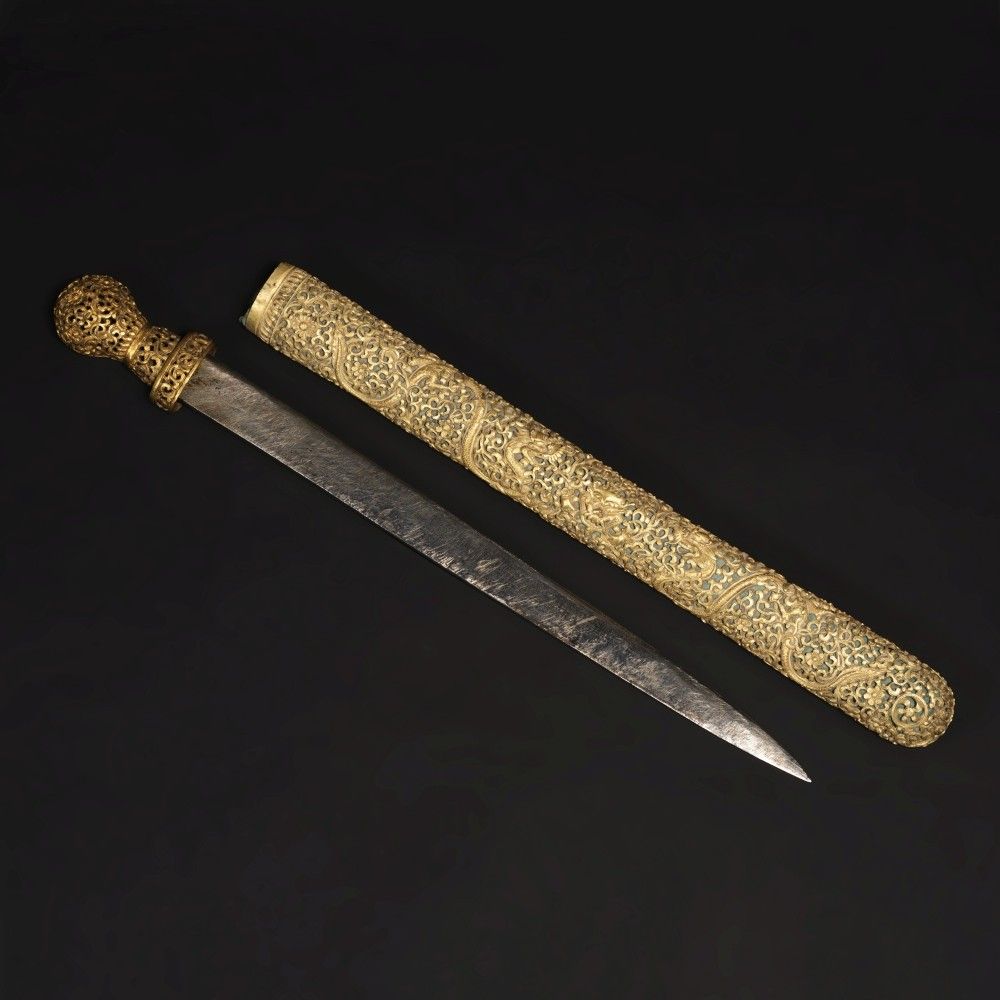 Premium 27. A REPOUSSÉ GILT COPPER ALLOY HILTED DAGGER WITH SCABBARD…