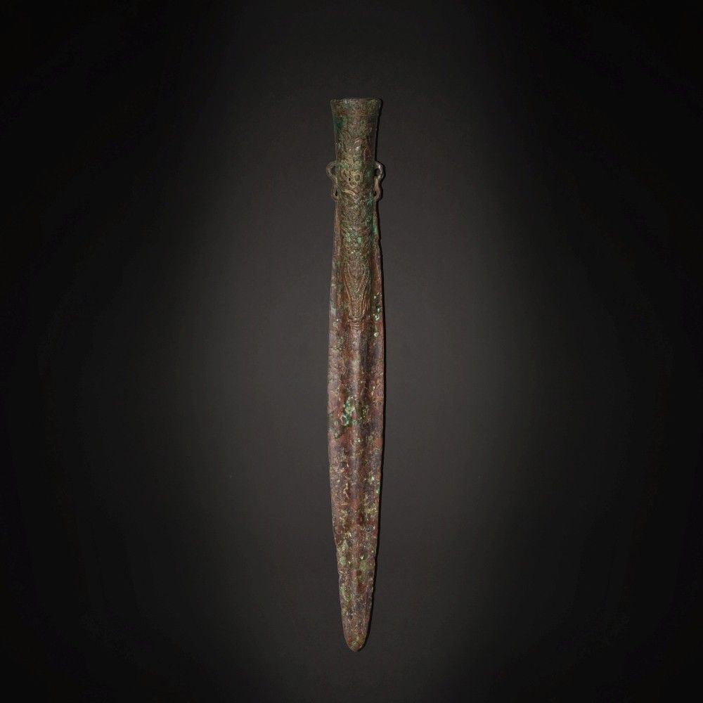 The elongated leaf-shaped blade flanked by a pair of side loops, finely cast on both sides with Taotie masks, the surface shows a reddish-brown patina with traces of green encrustation.