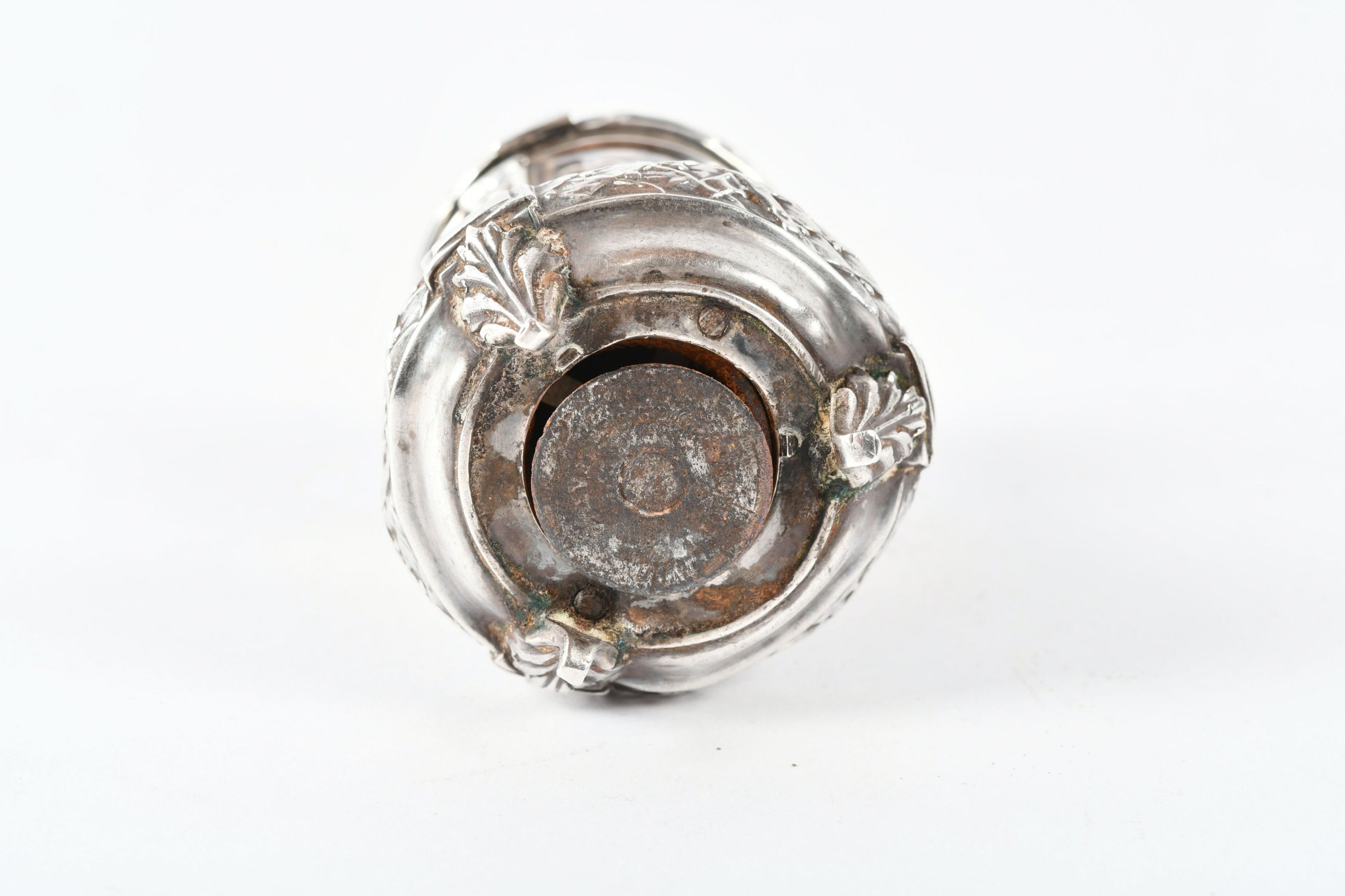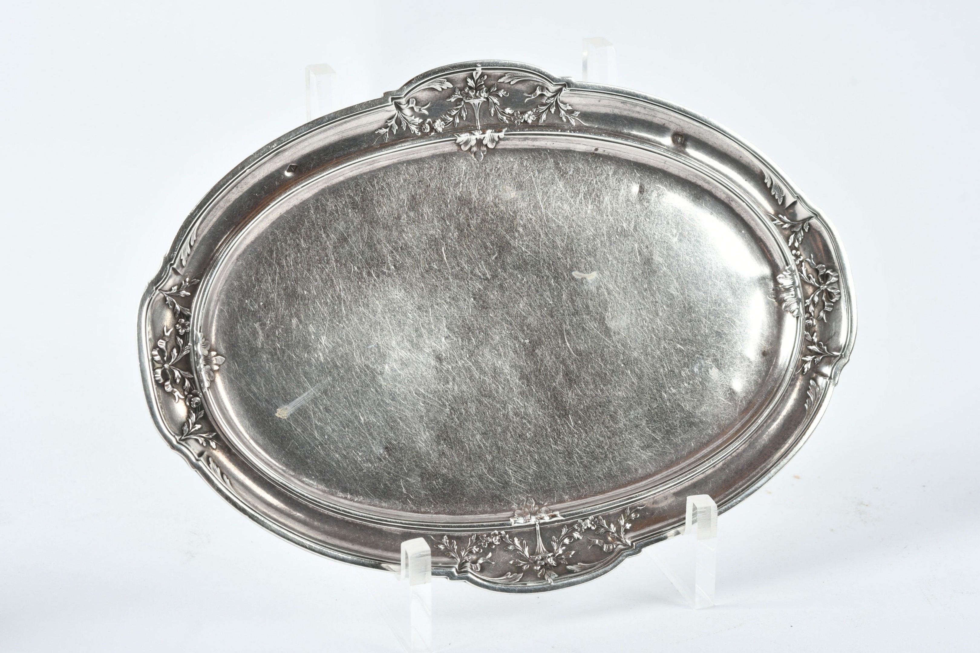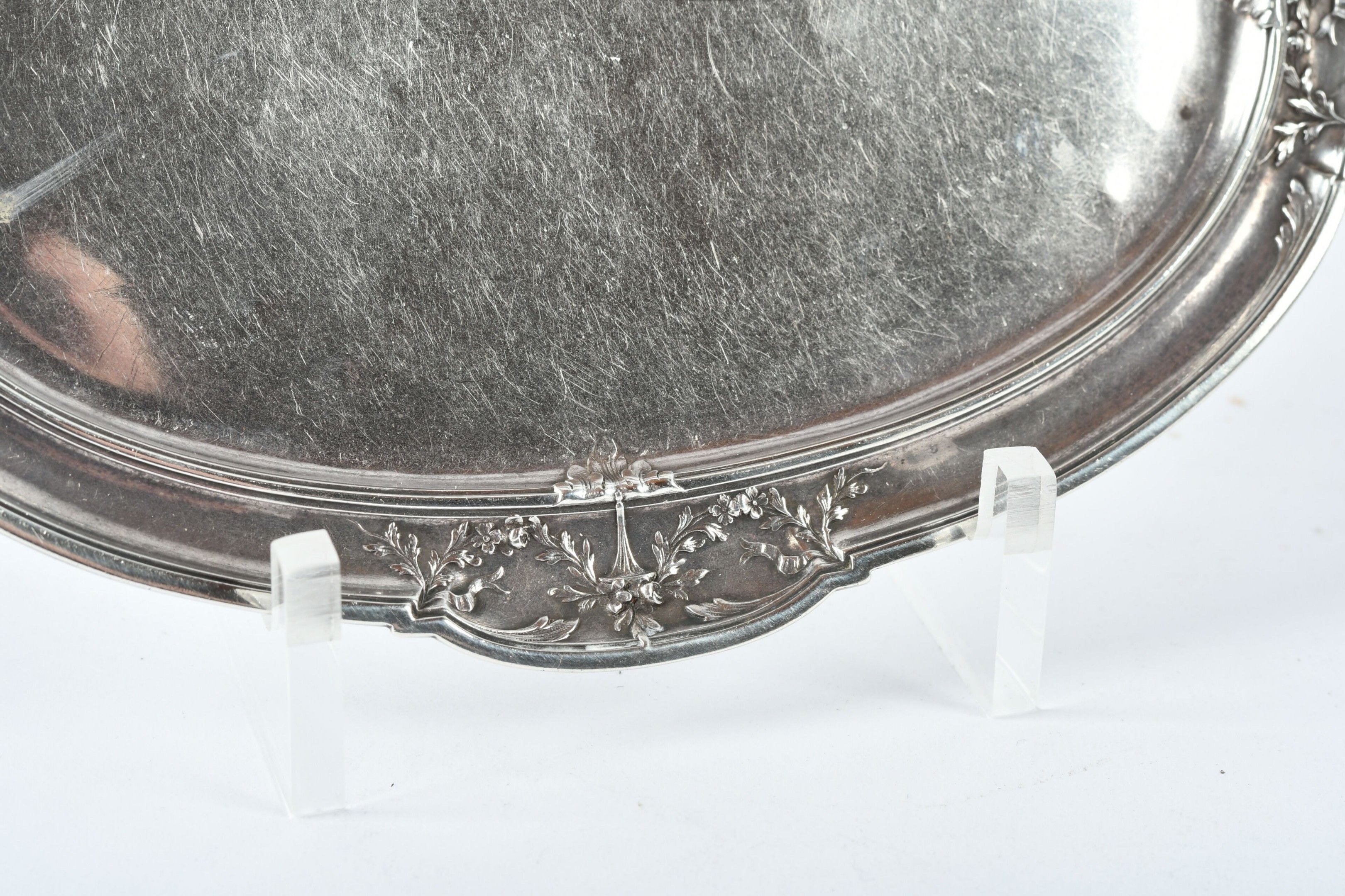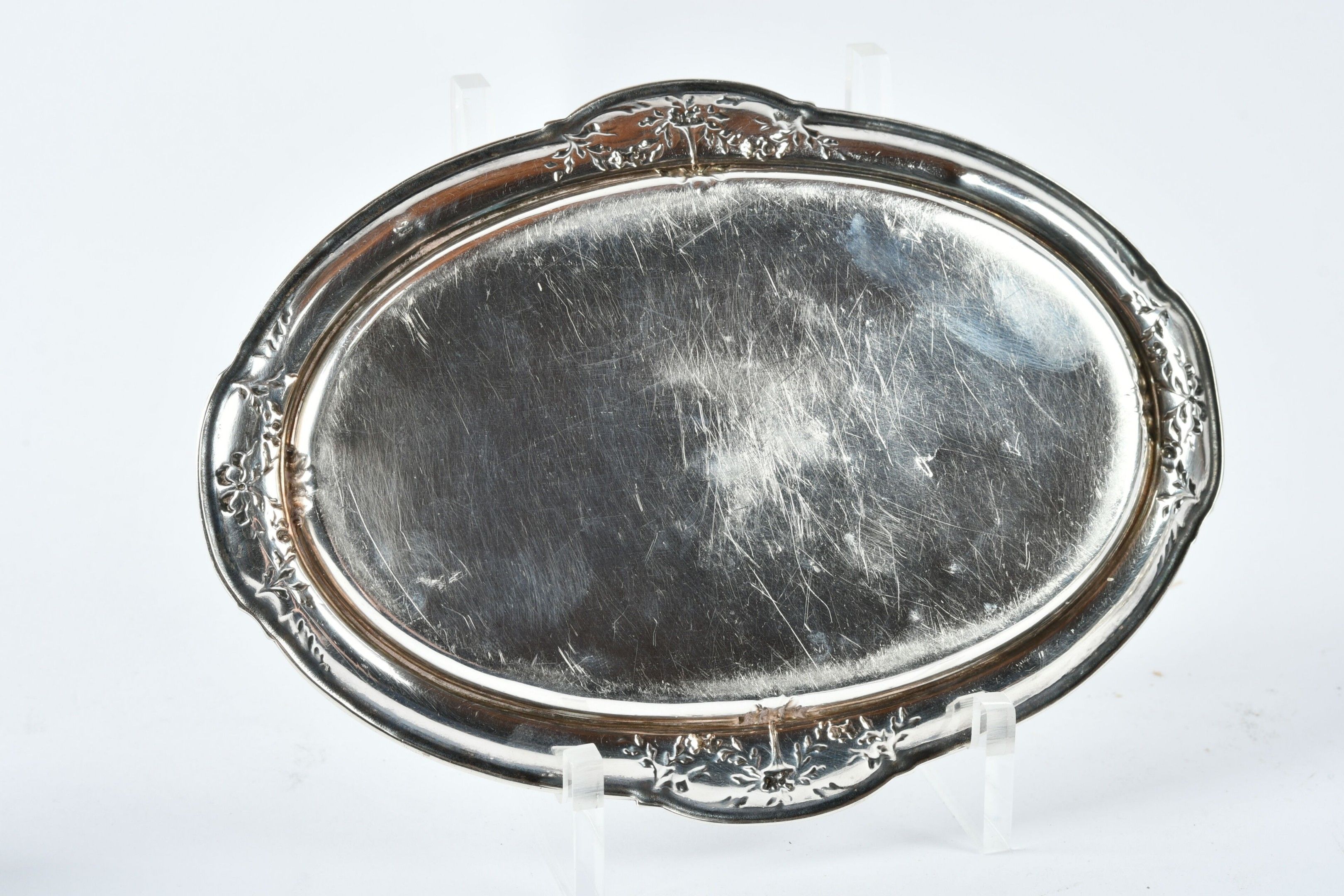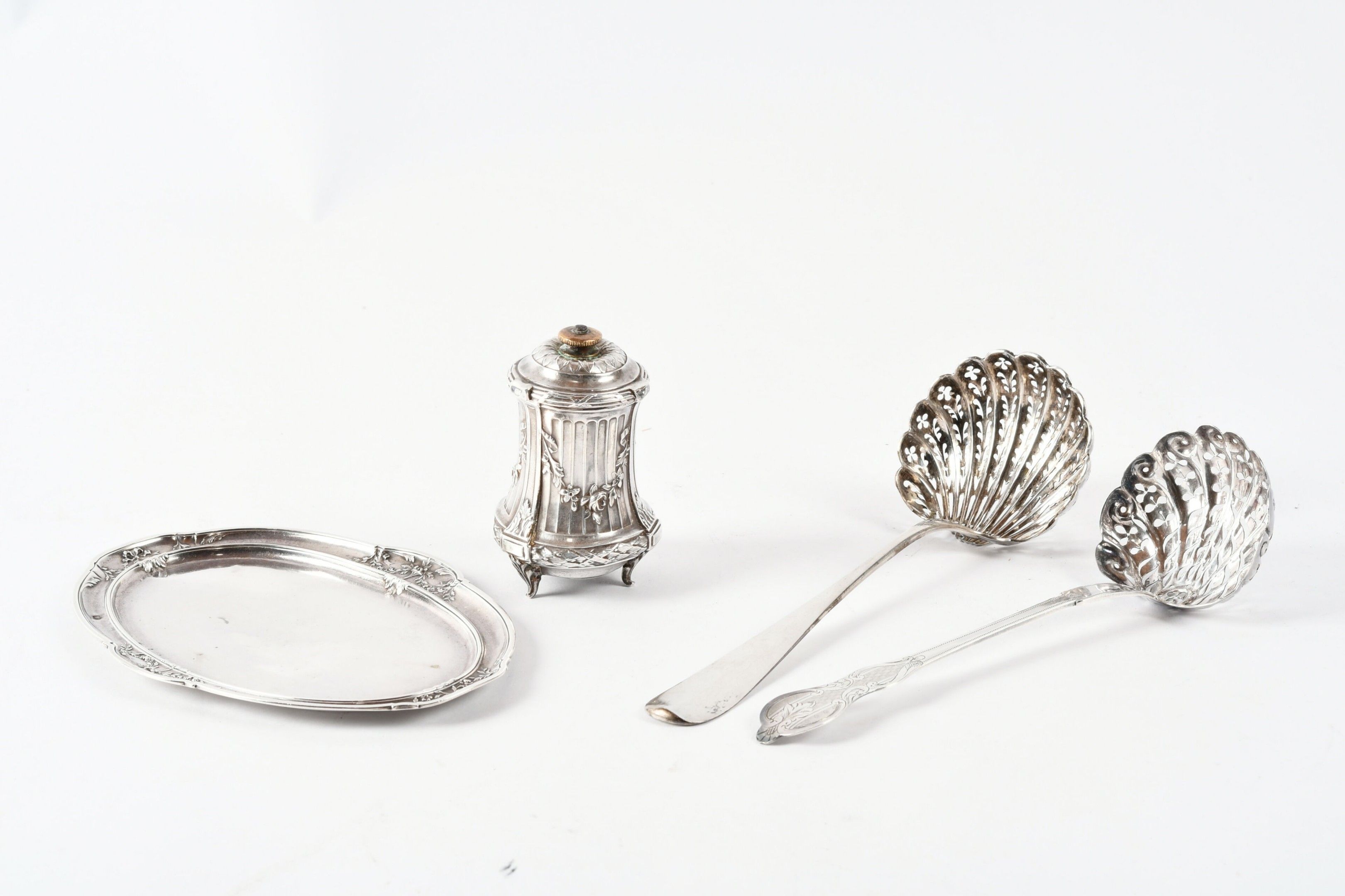 SILVER VITRINARY OBJECTS: small poly-lobed platter; two spoons (one damaged) and pepper shaker. Total gross weight: 306 g. (Gross weight of pepper shaker: 133 g)