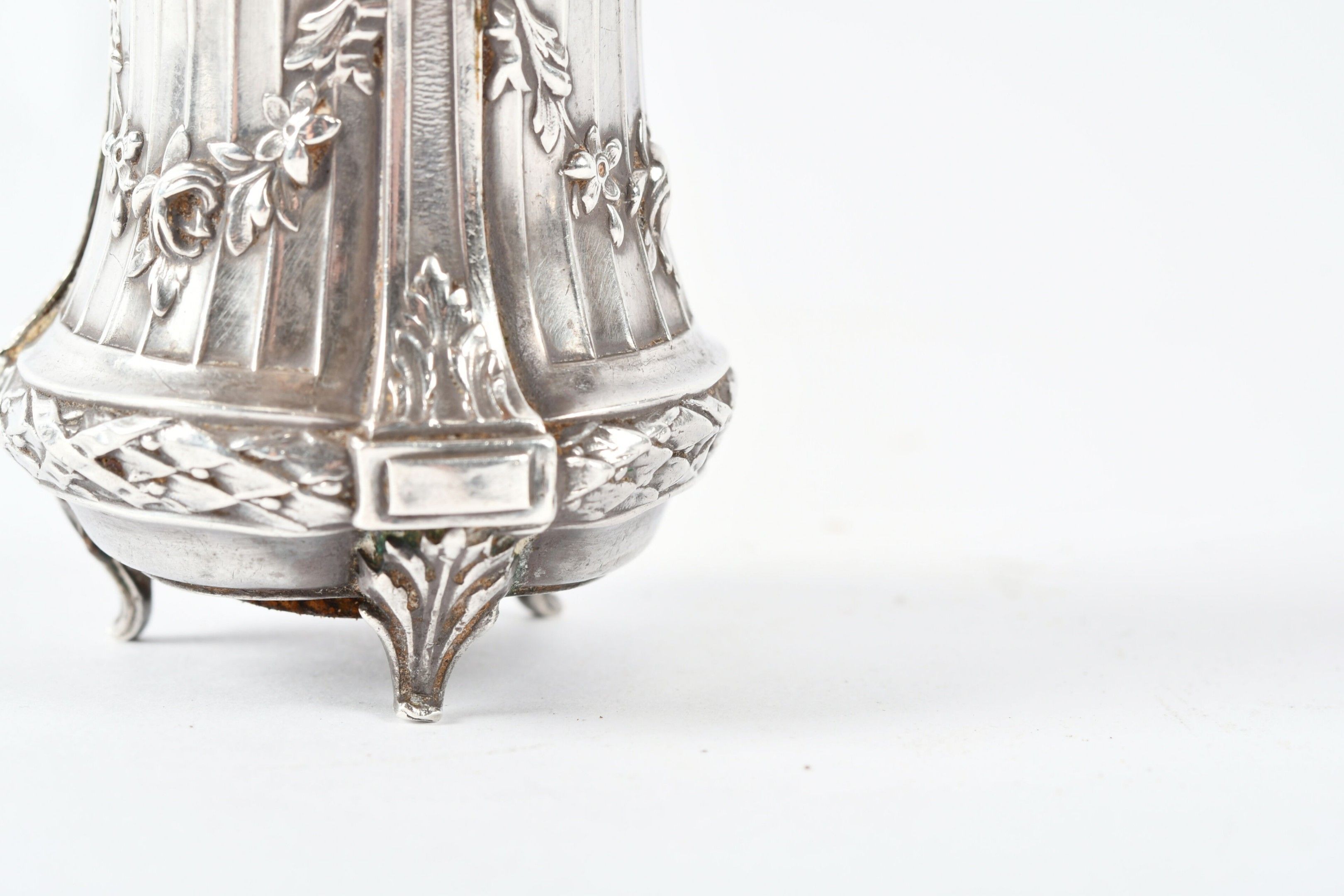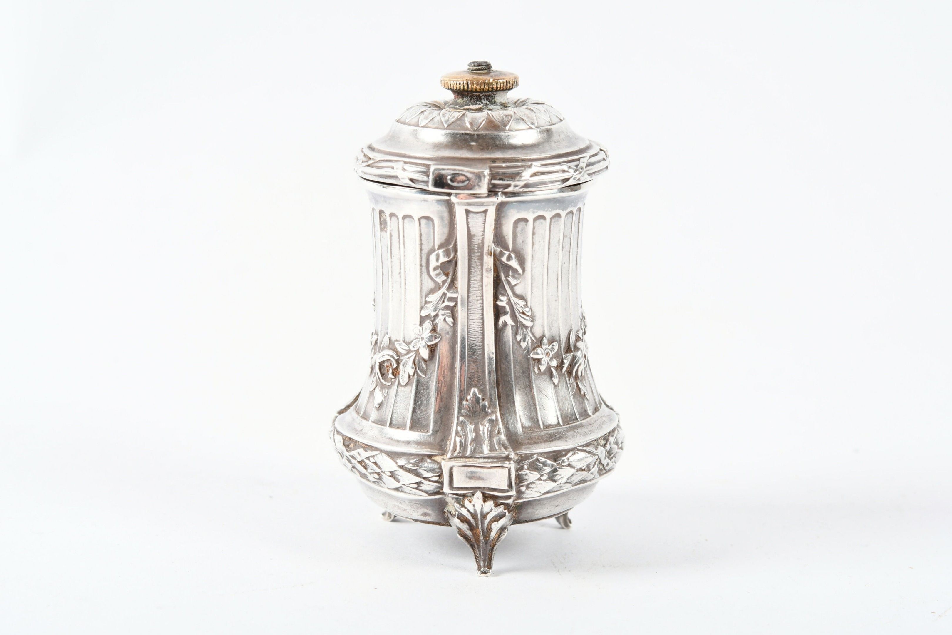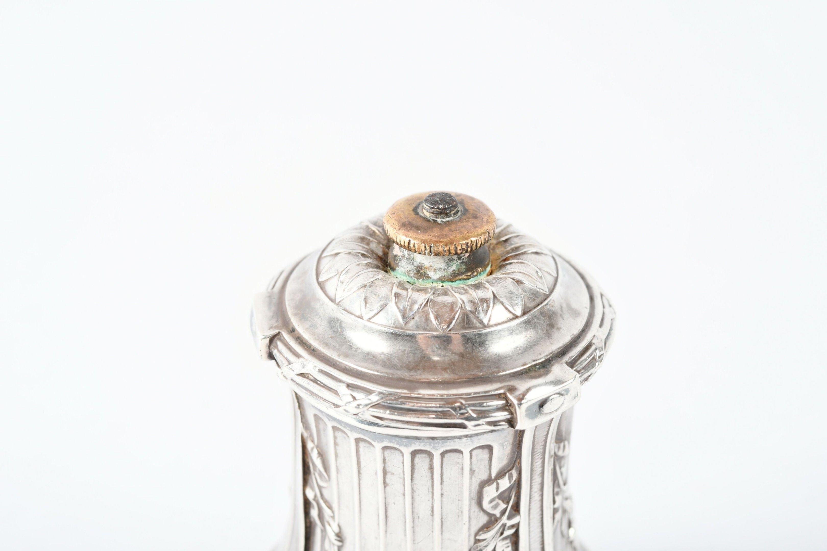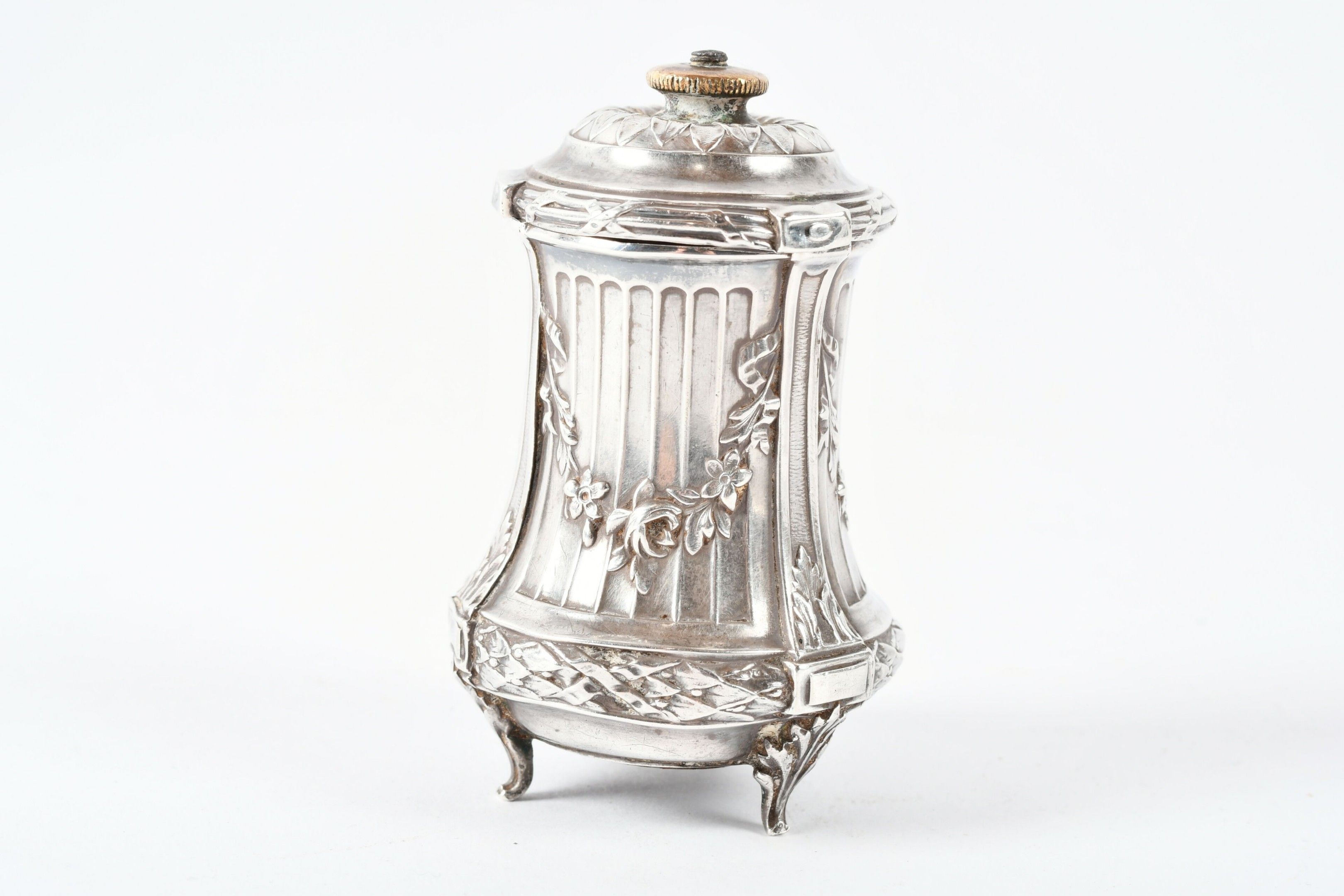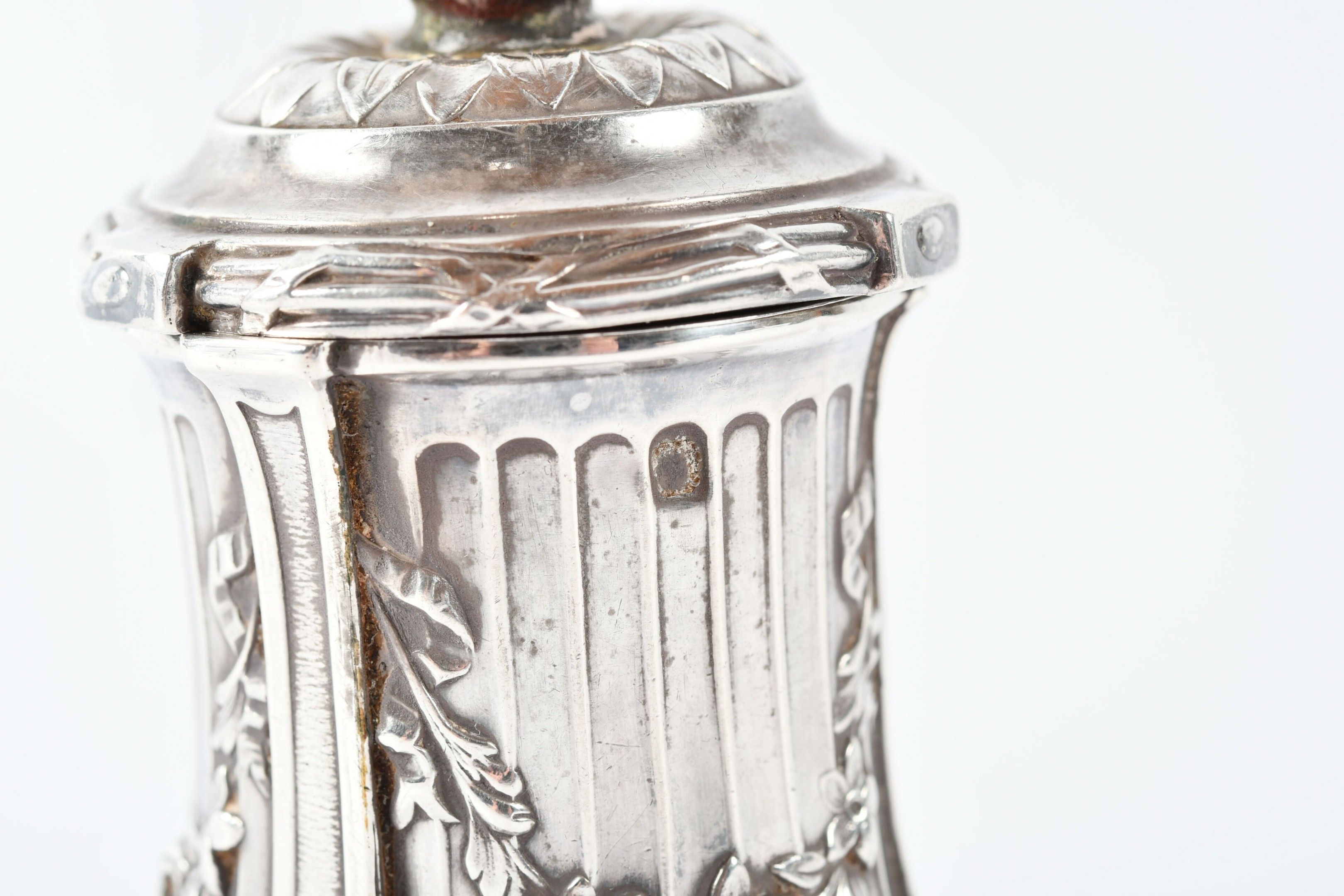 SILVER VITRINARY OBJECTS: small poly-lobed platter; two spoons (one damaged) and pepper shaker. Total gross weight: 306 g. (Gross weight of pepper shaker: 133 g)