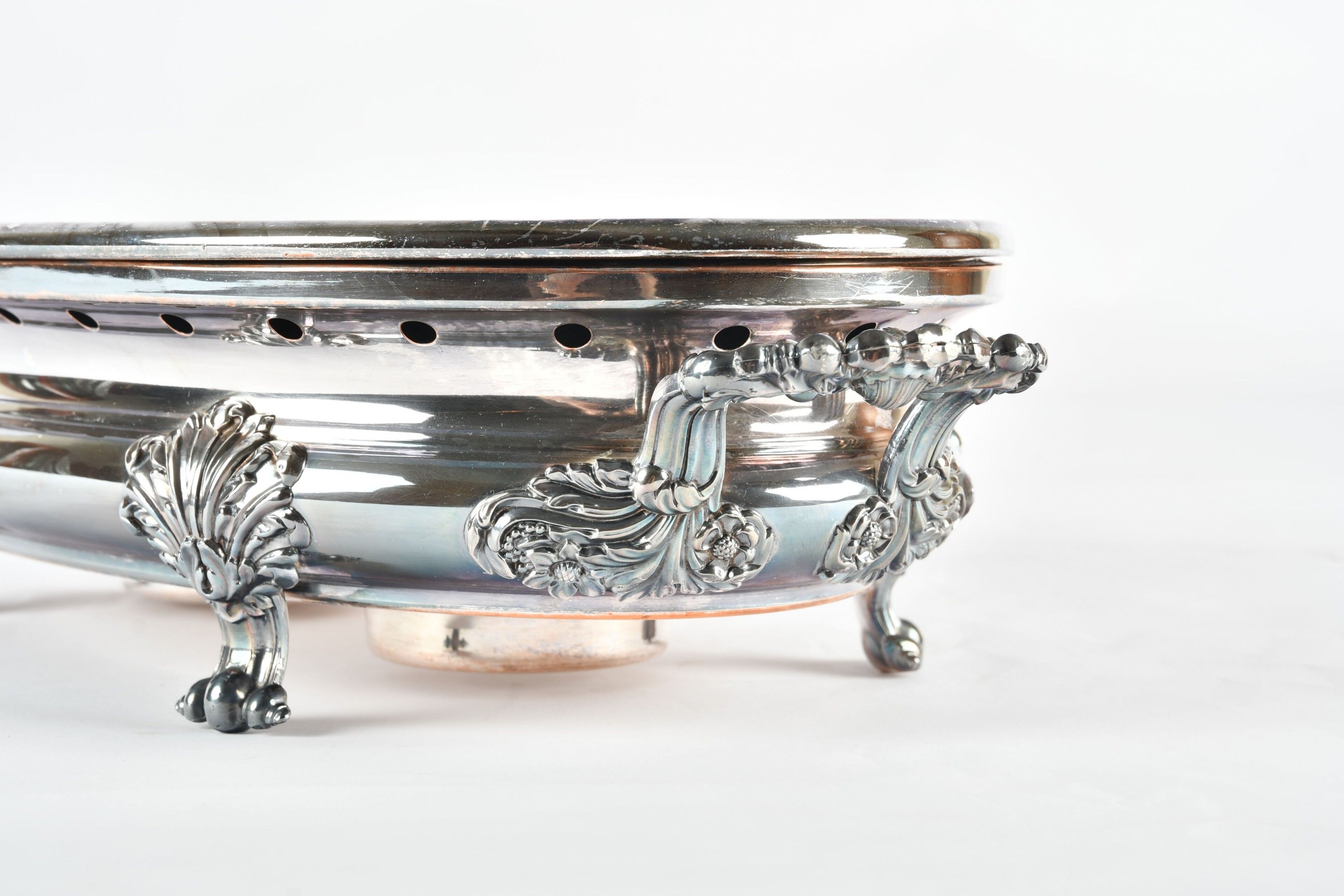 A silver-lined metal TABLE HEATER with handles standing on f…