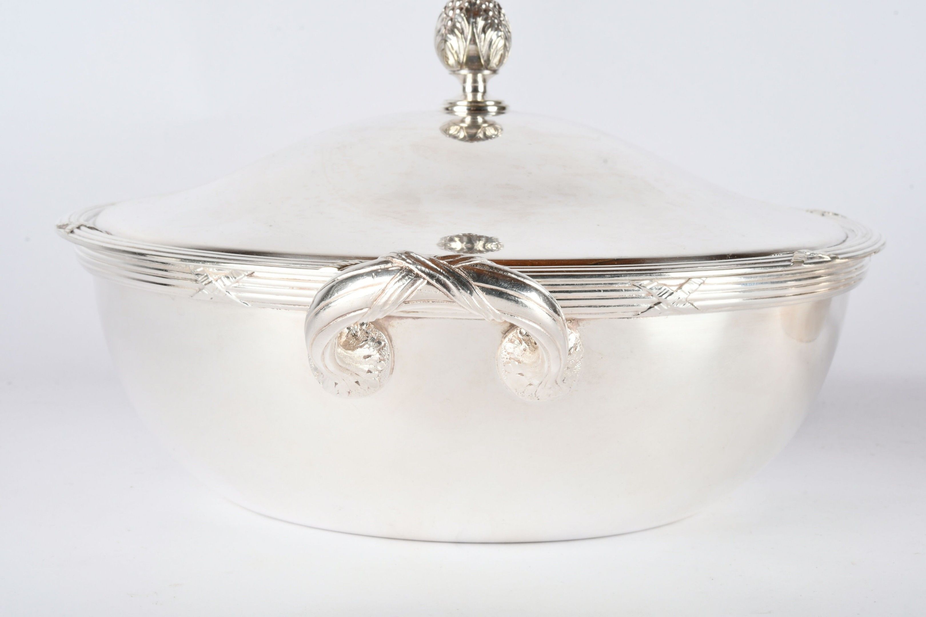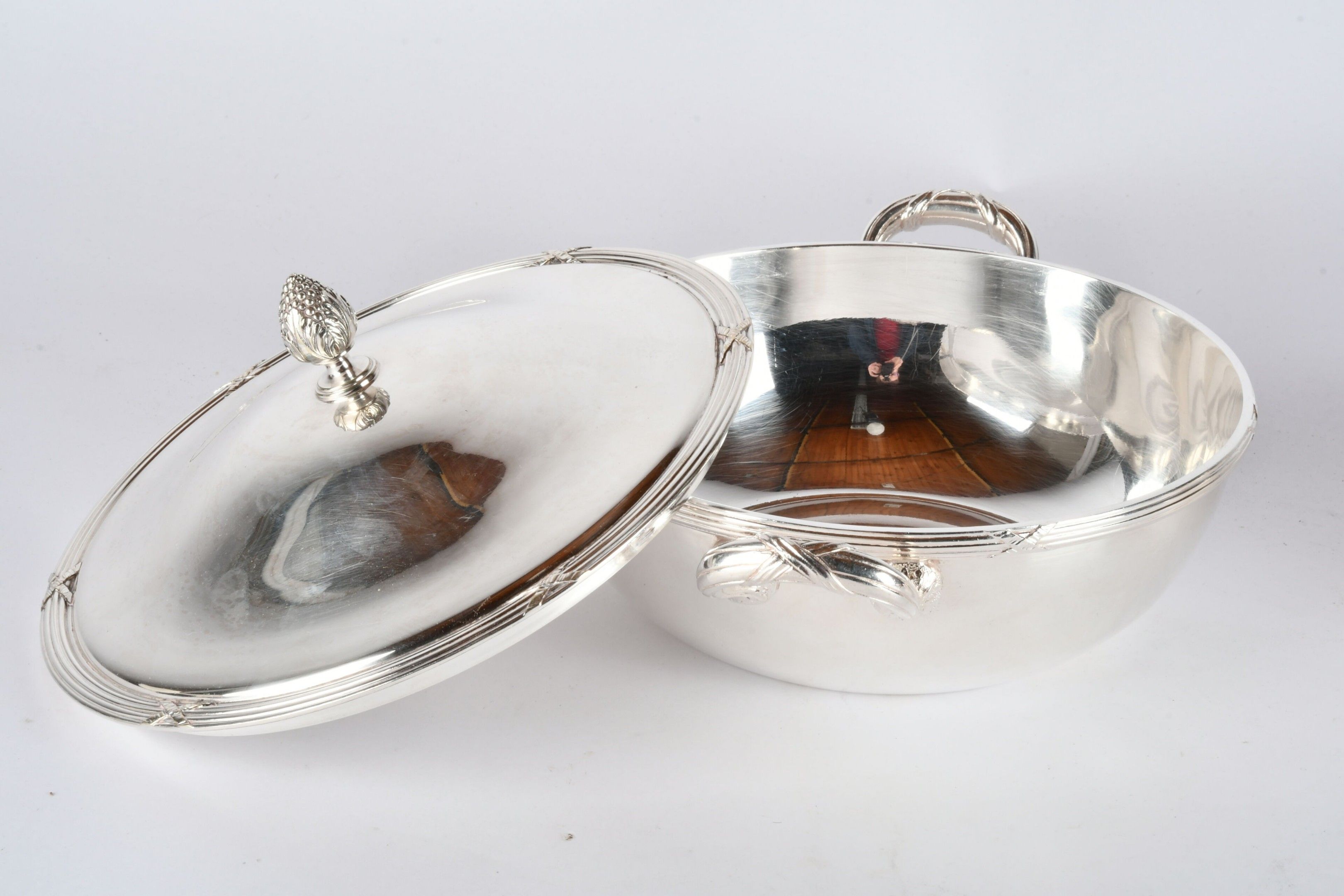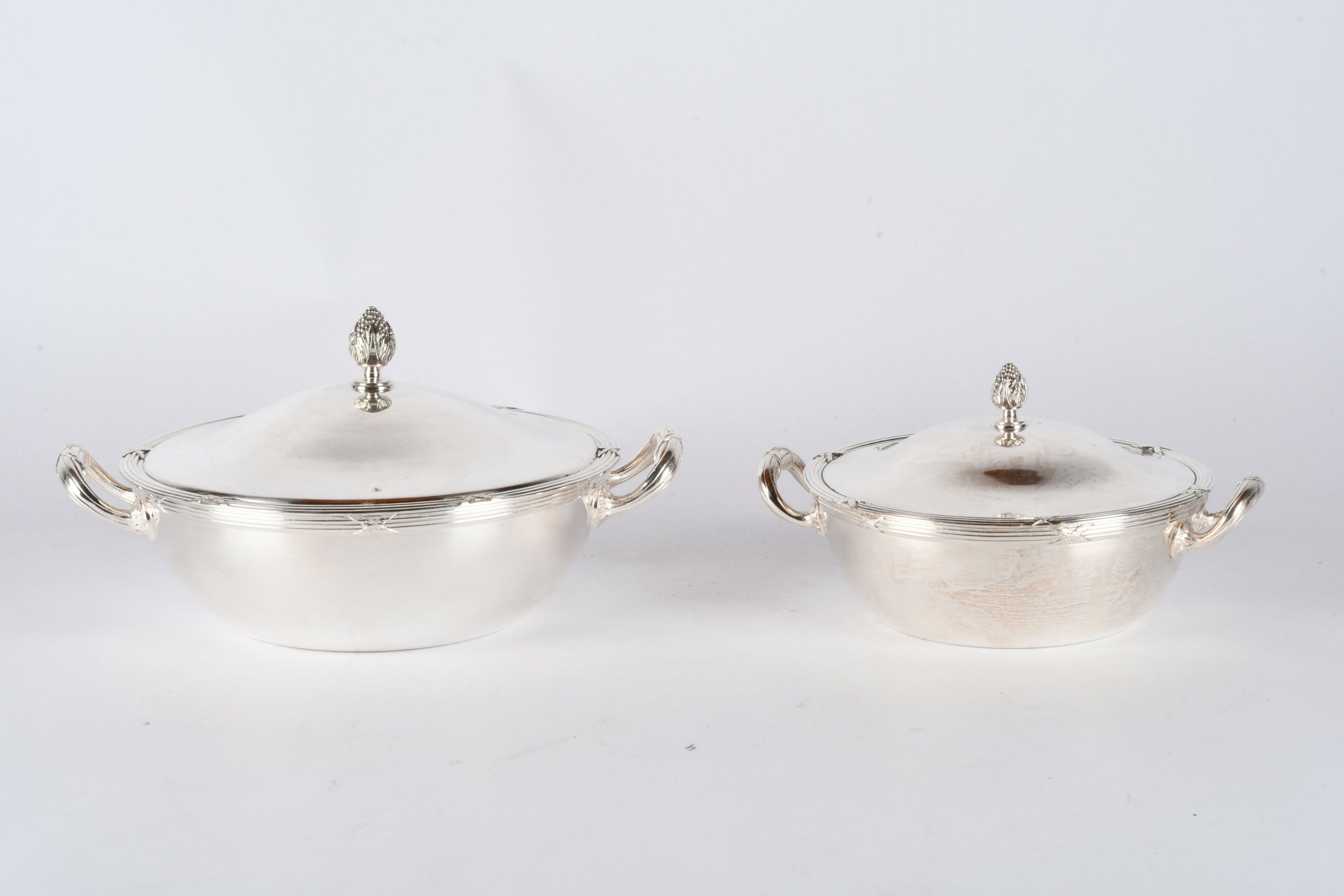 WISKERMANN. Two silver-plated covered vegetable dishes with descending handles decorated with ribboned fillets and fruit handles. Signed. L. 23 and 30 cm