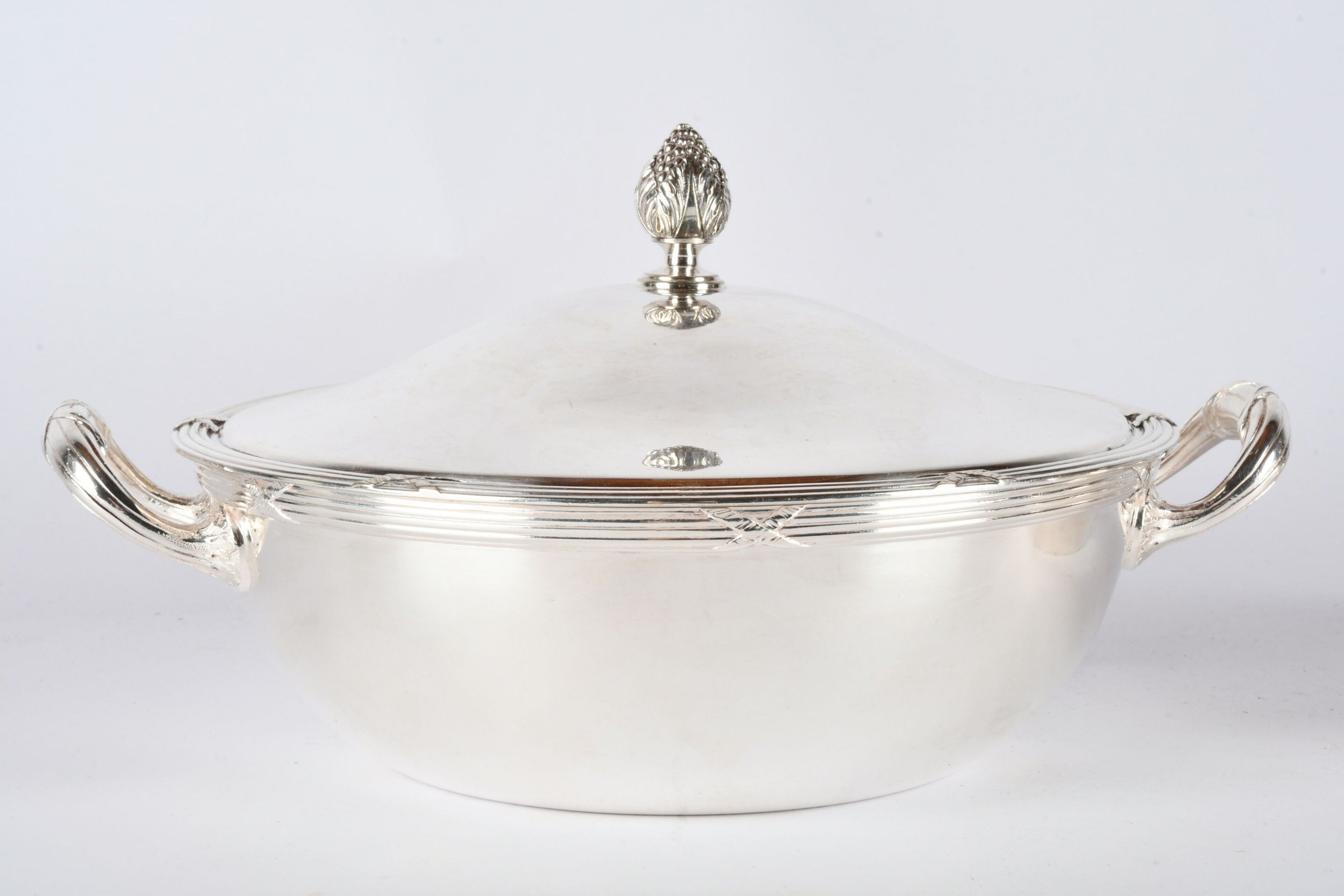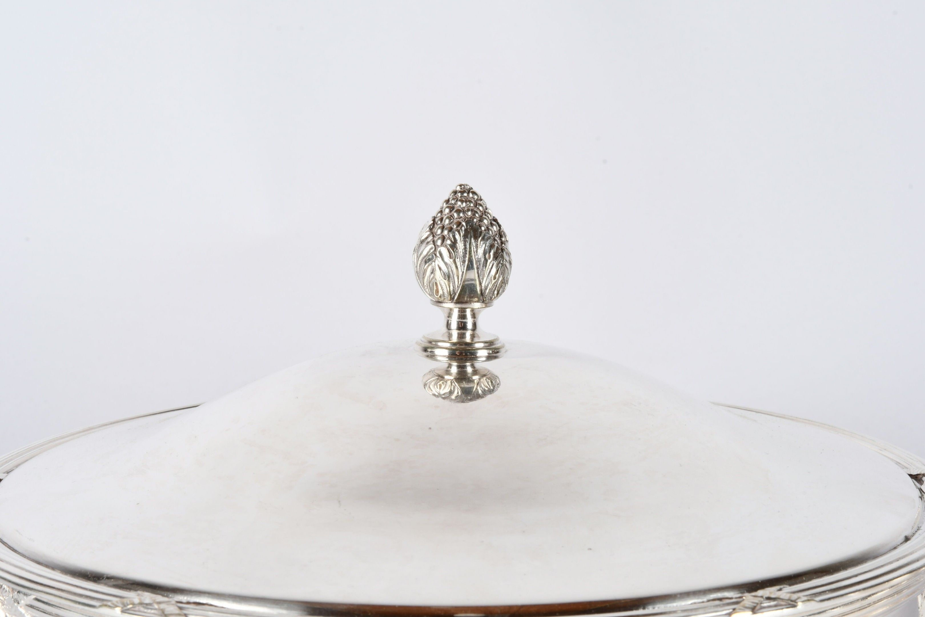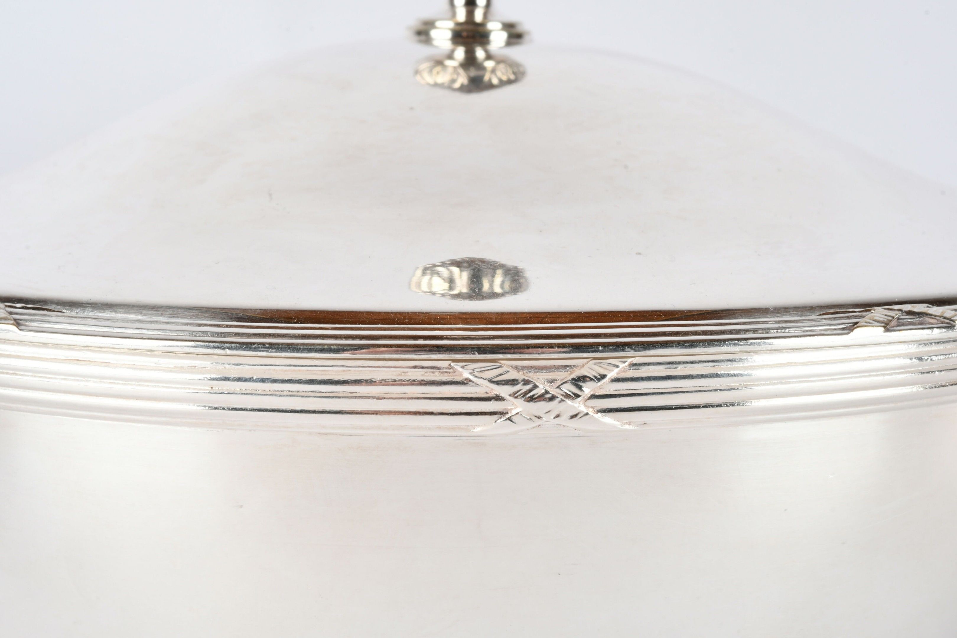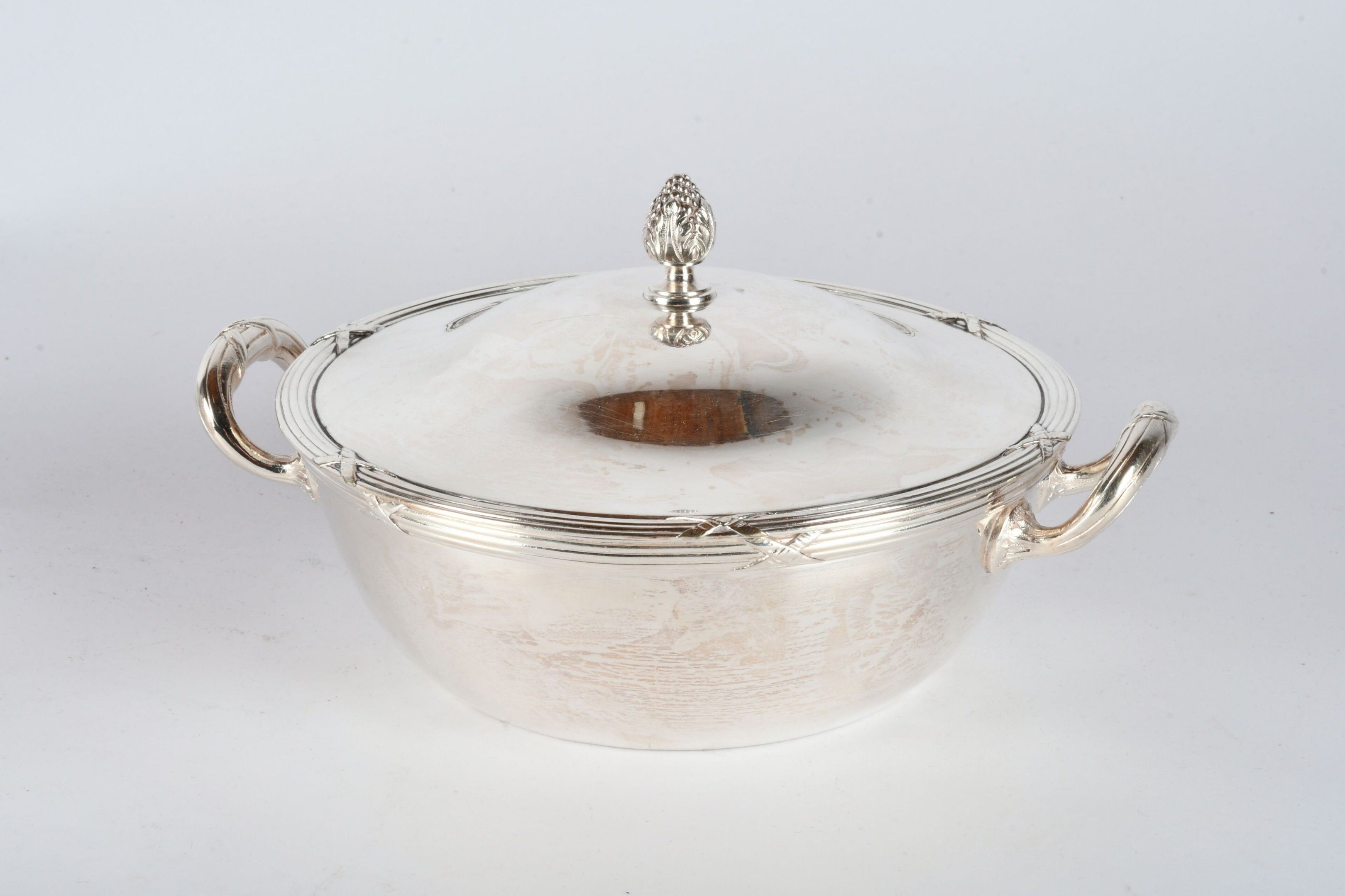 WISKERMANN. Two silver-plated covered vegetable dishes with descending handles decorated with ribboned fillets and fruit handles. Signed. L. 23 and 30 cm