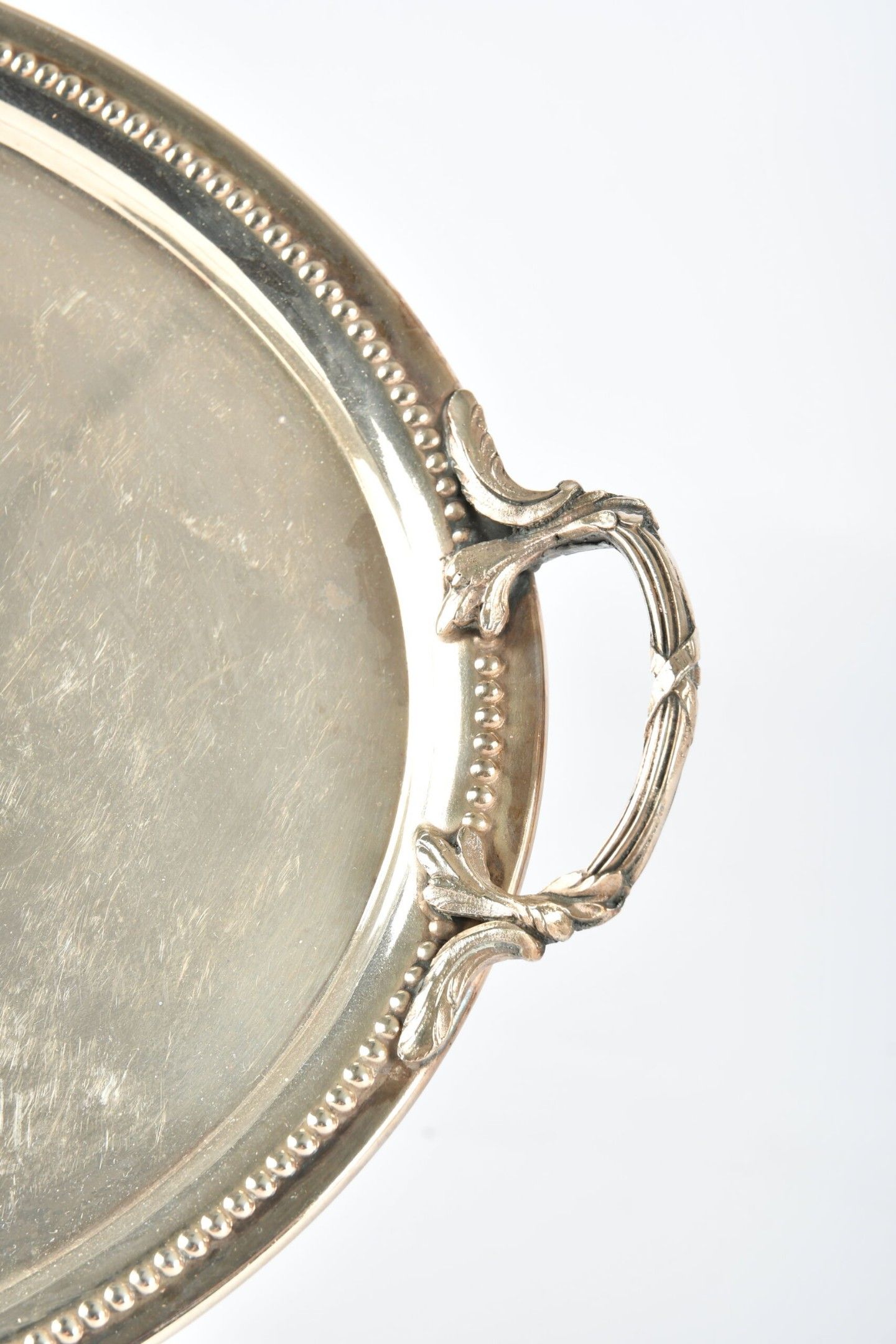 Silver plated TEA and COFFEE SET with pearled rim comprising coffee pot, teapot, sugar bowl, milk jug and oval tray. Height from 9.5 to 21 cm